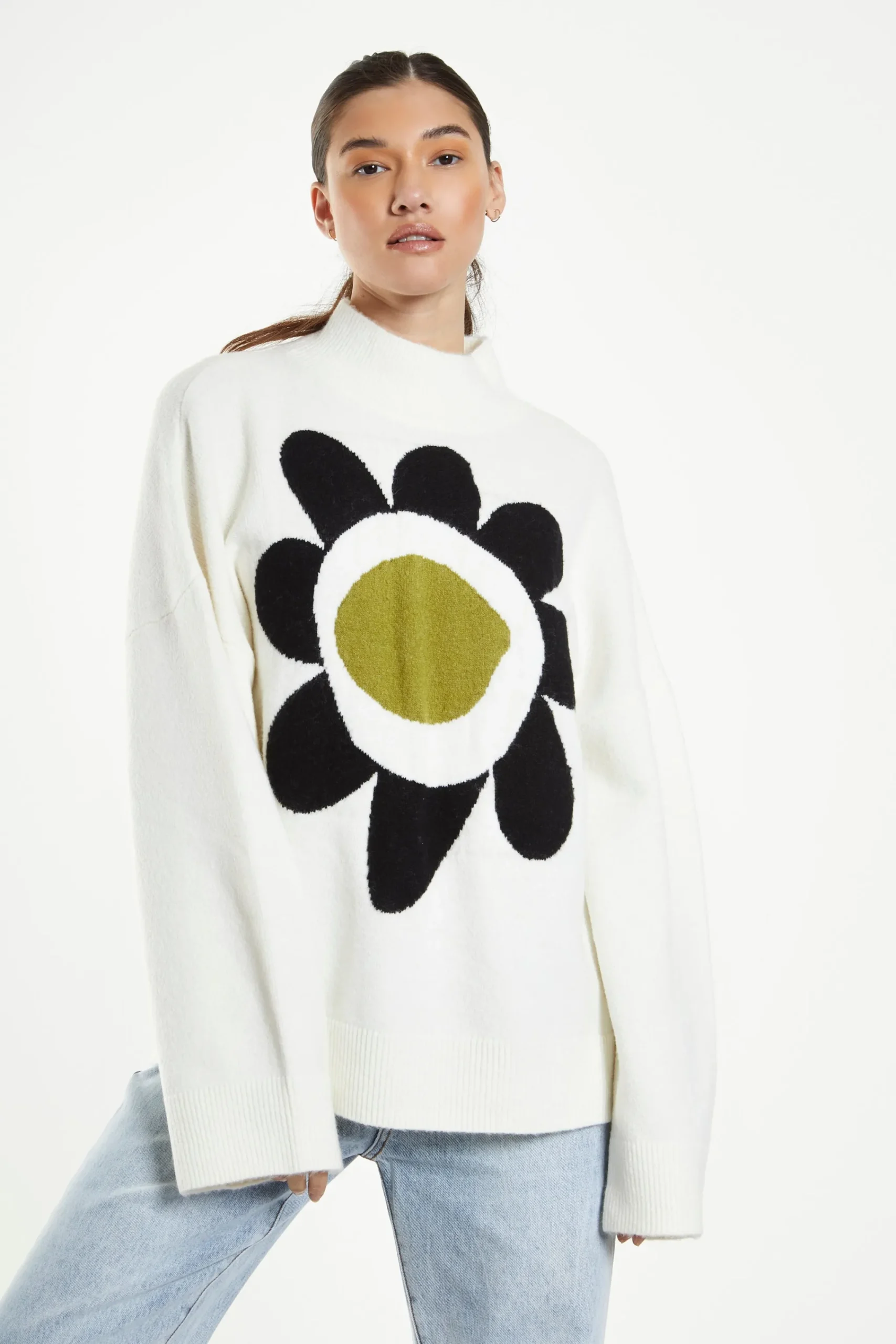 Glamorous Cream Large Flower Knitted Oversized Jumper. Stay cozy yet fashionable with this on tread knit jumper. Featuring a large flower knit design and oversized fit, we love this piece here at Glamorous. Style with your favourite pair of jeans for a relaxed but chic look.