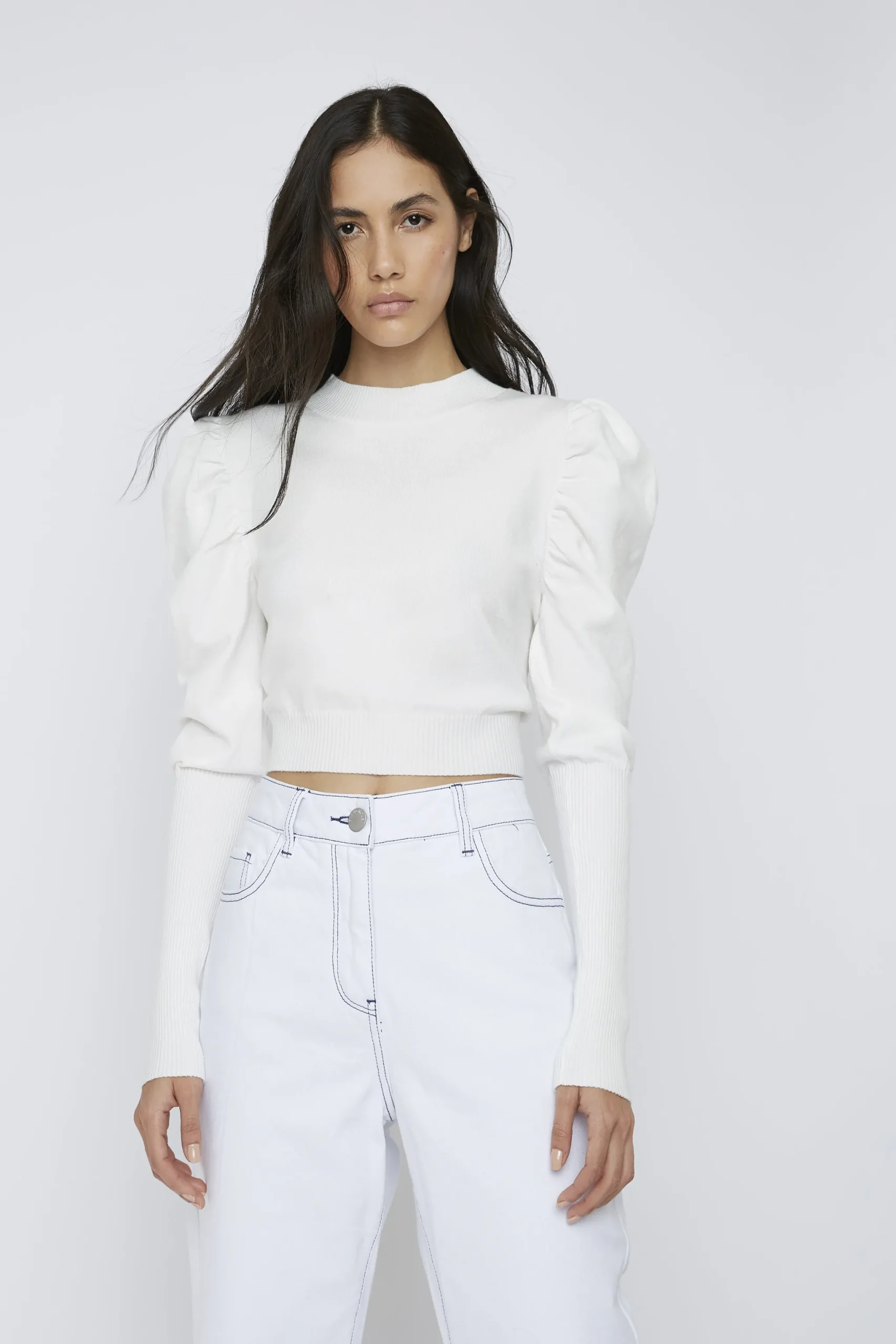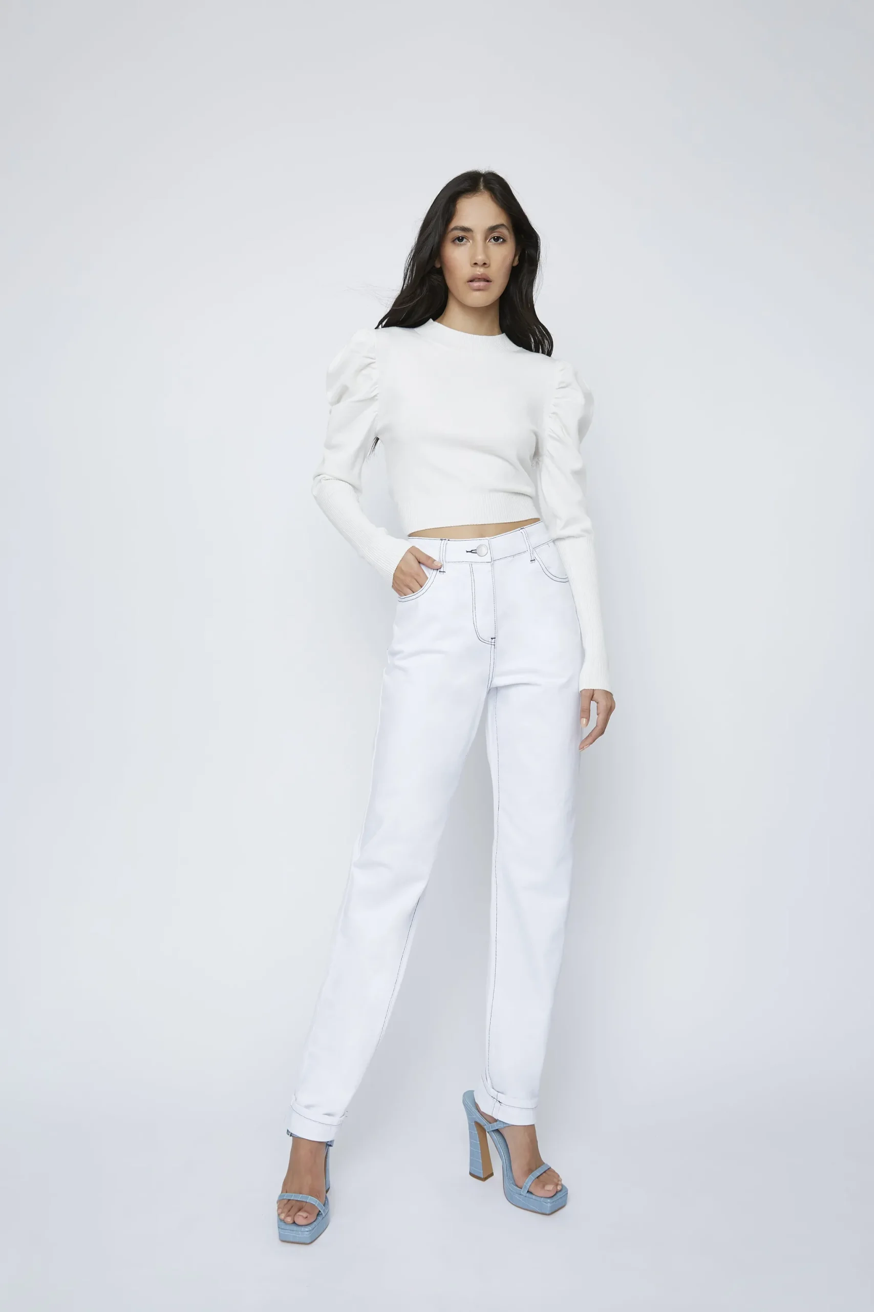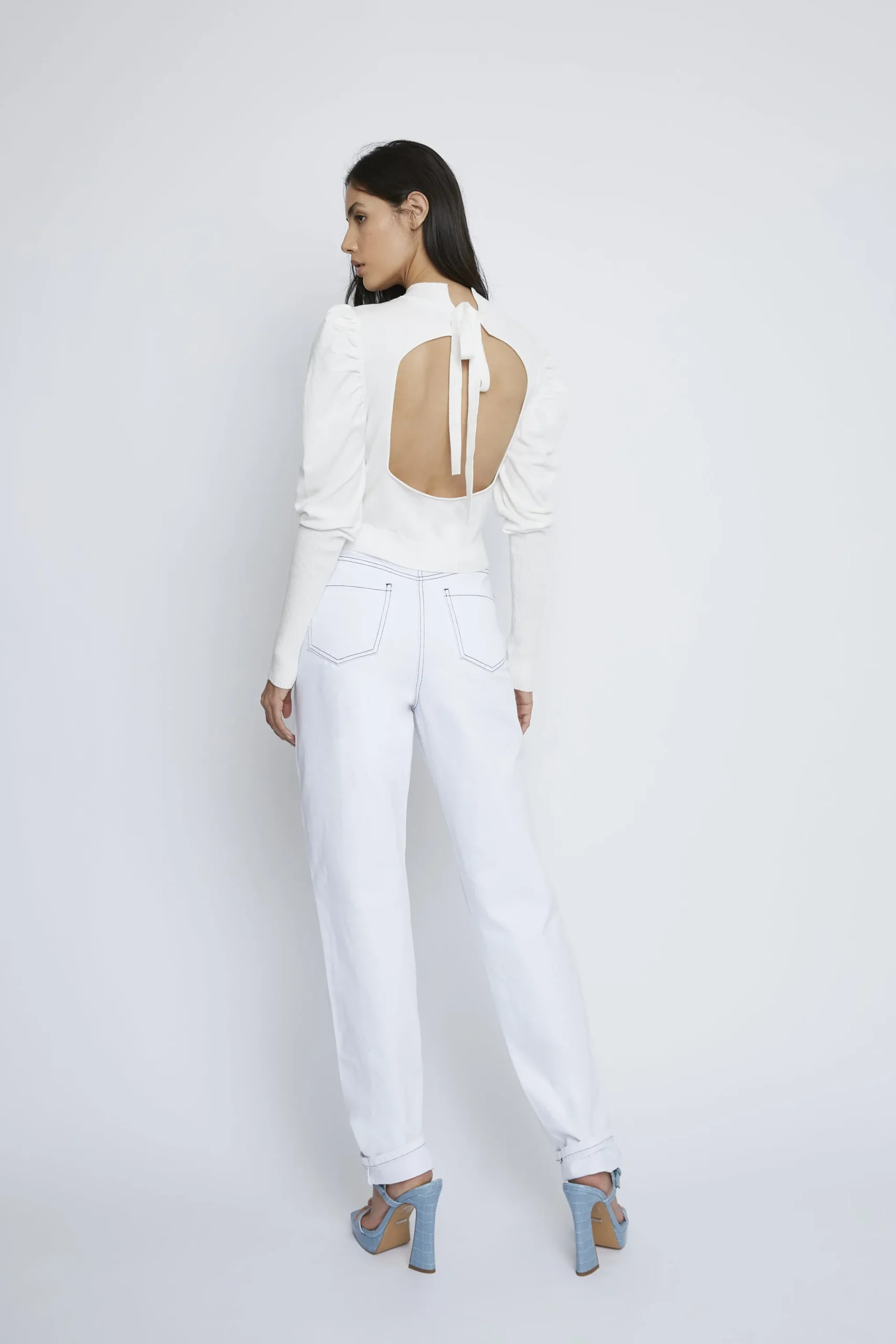 Glamorous Womens White Puff Shoulder Open Back Jumper. This knitted Jumper is the perfect addition to your wardrobe. Featuring an open back and flattering fit this jumper is glamorous and chic. This piece will go perfectly with a pair of black denim jeans and some mule sandals.