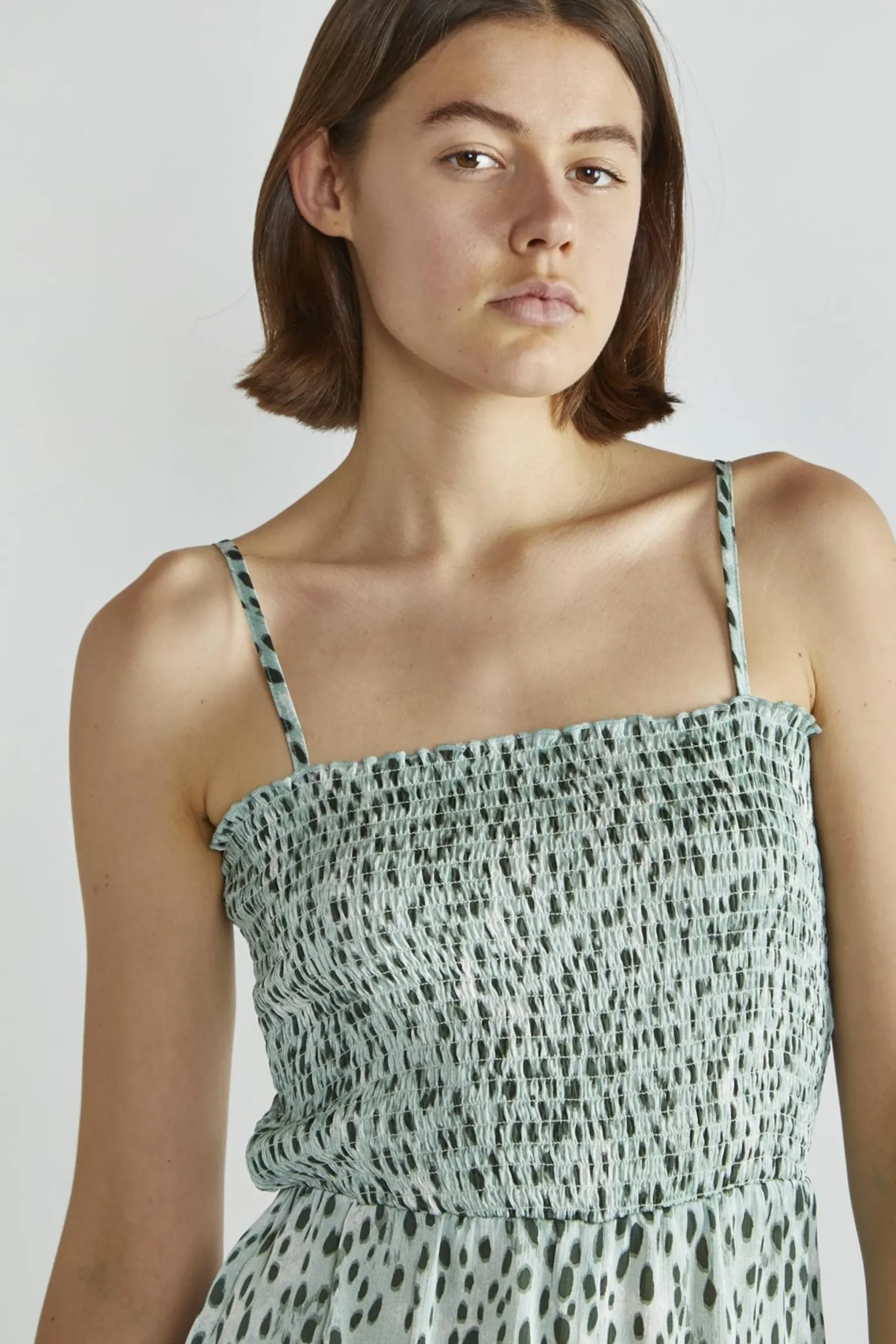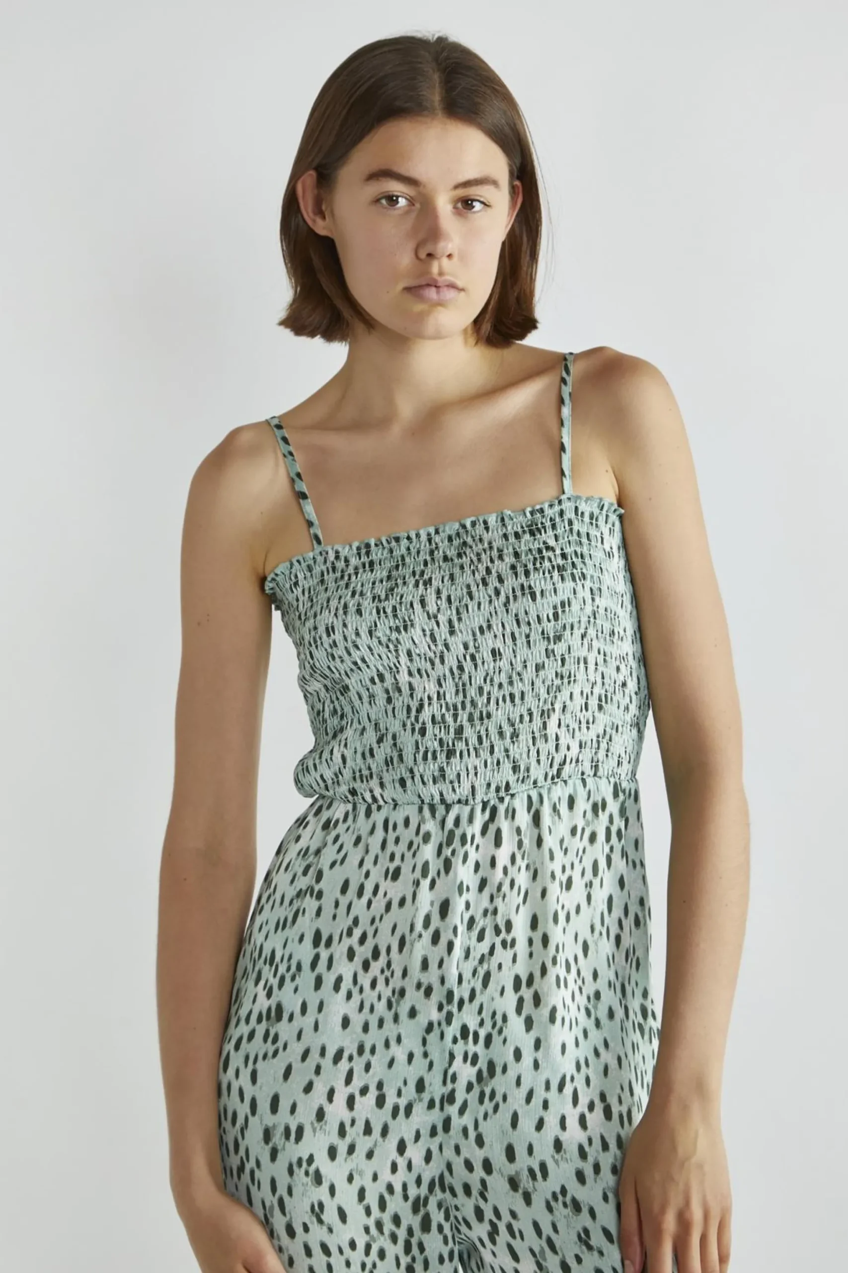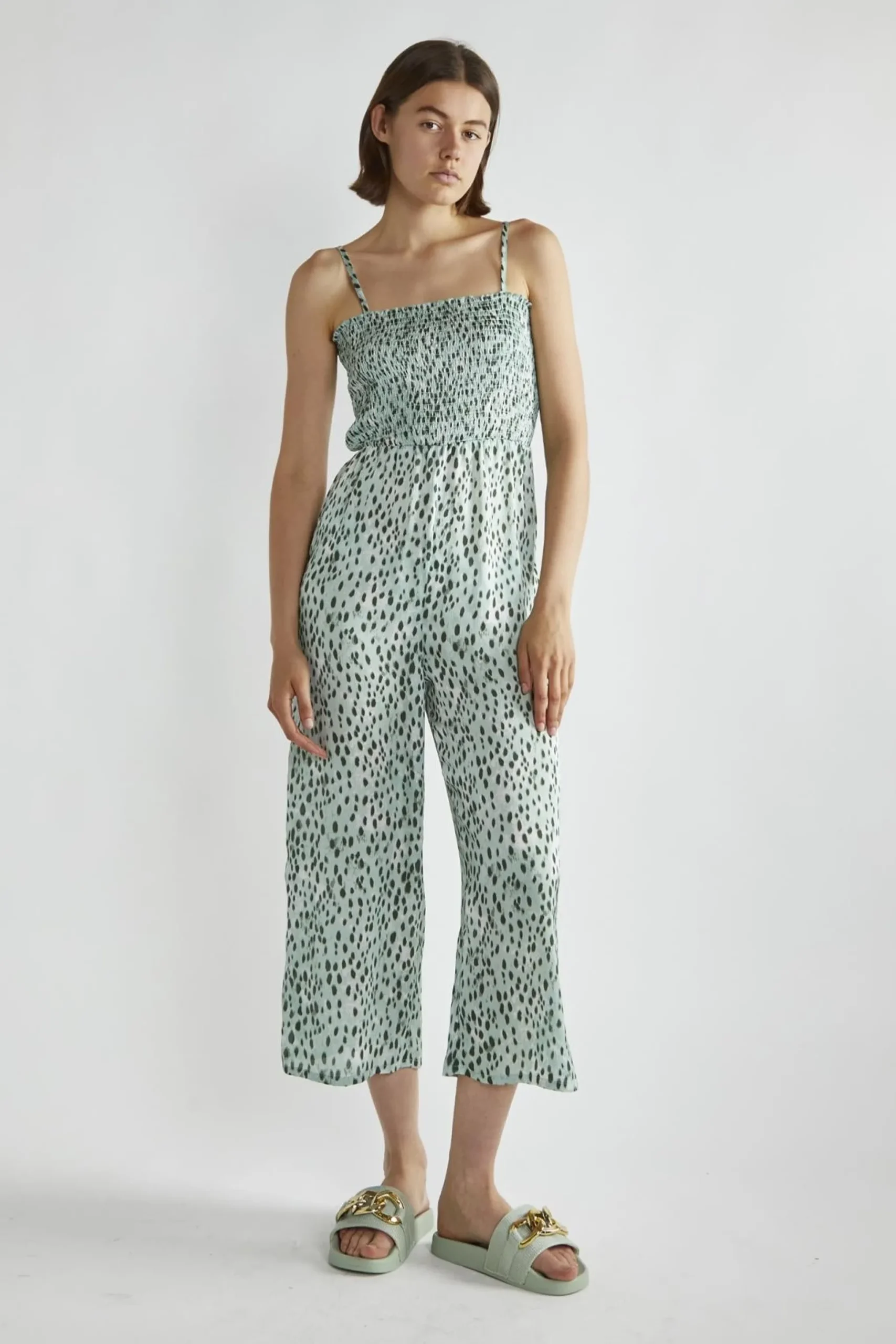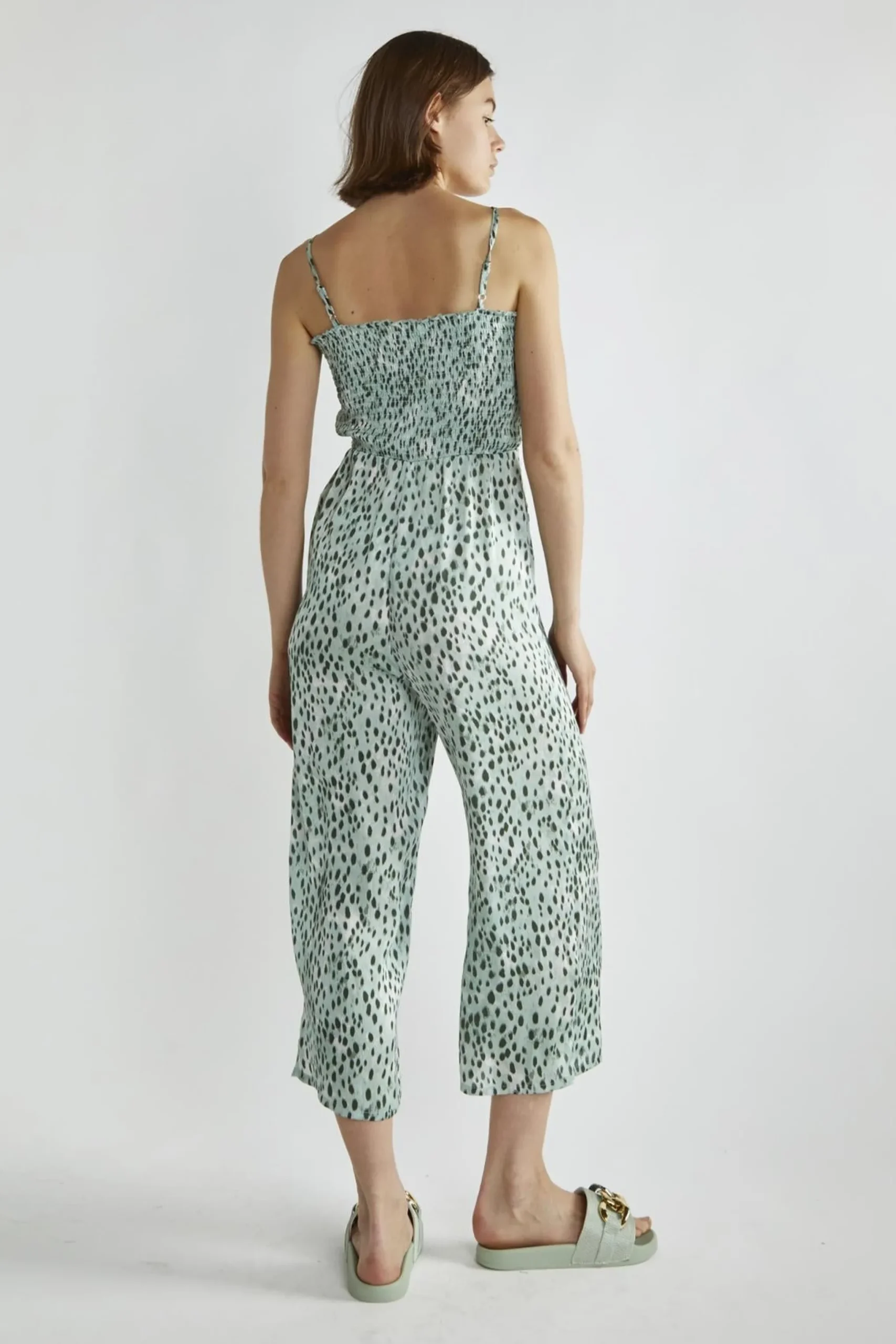 Glamorous Dusty-Green Leopard Wide-Leg Cropped-Jumpsuit. Get ready to turn heads in our Dusty-Green Leopard Wide-Leg Cropped-Jumpsuit. This eye-catching piece combines comfort and style effortlessly. The shirred bodice hugs your curves just right, while the wide legs offer a breezy, relaxed feel. Hit the perfect length with its cropped design, ideal for showing off your favourite shoes. Adjust the spaghetti straps for a custom fit that keeps you comfy all day long. The dusty-green leopard print adds a touch of wild charm to your wardrobe. Pair it with sandals for a casual day out, or dress it up with heels for a night on the town. This jumpsuit is your go-to for easy, stylish dressing..