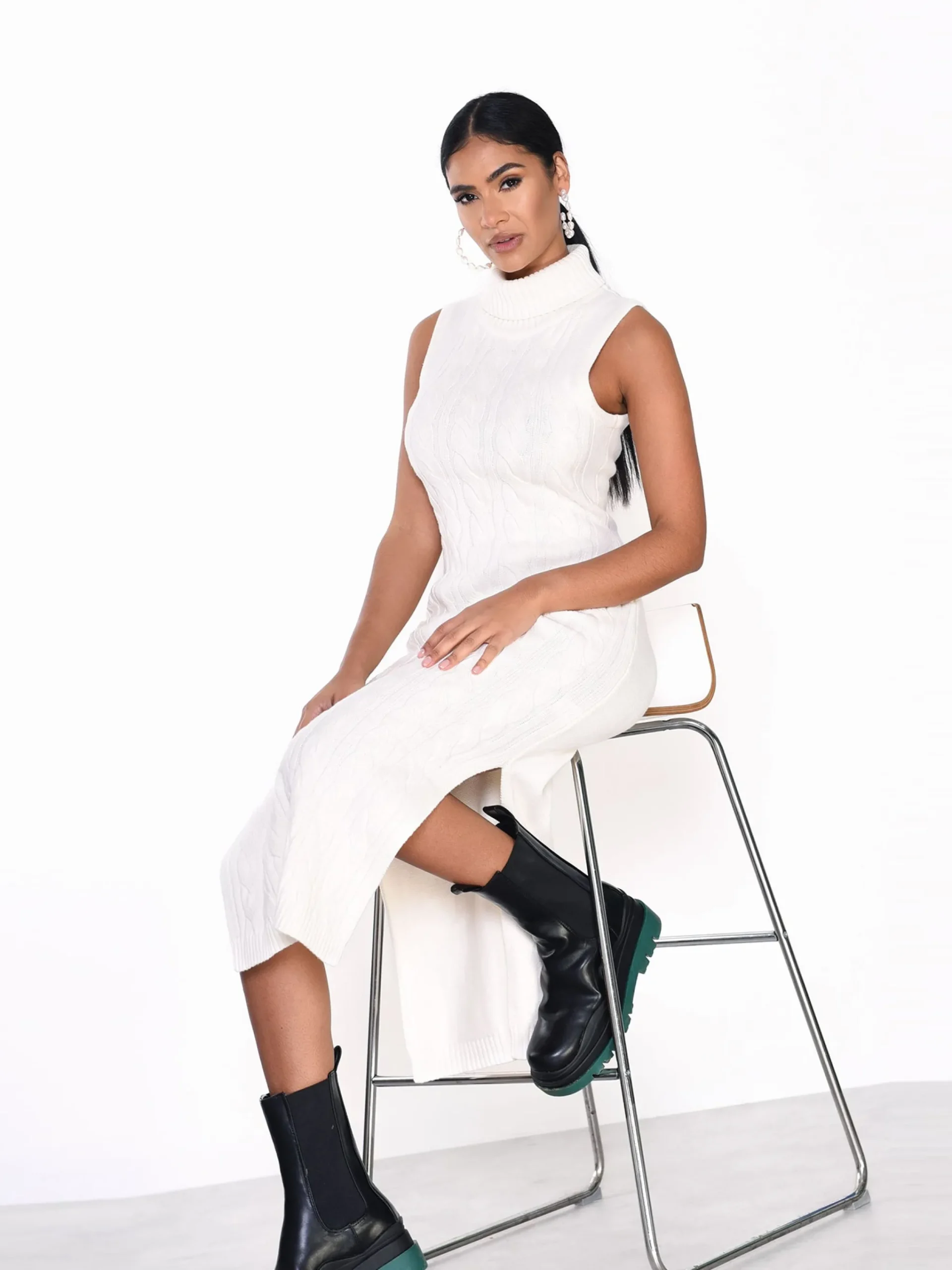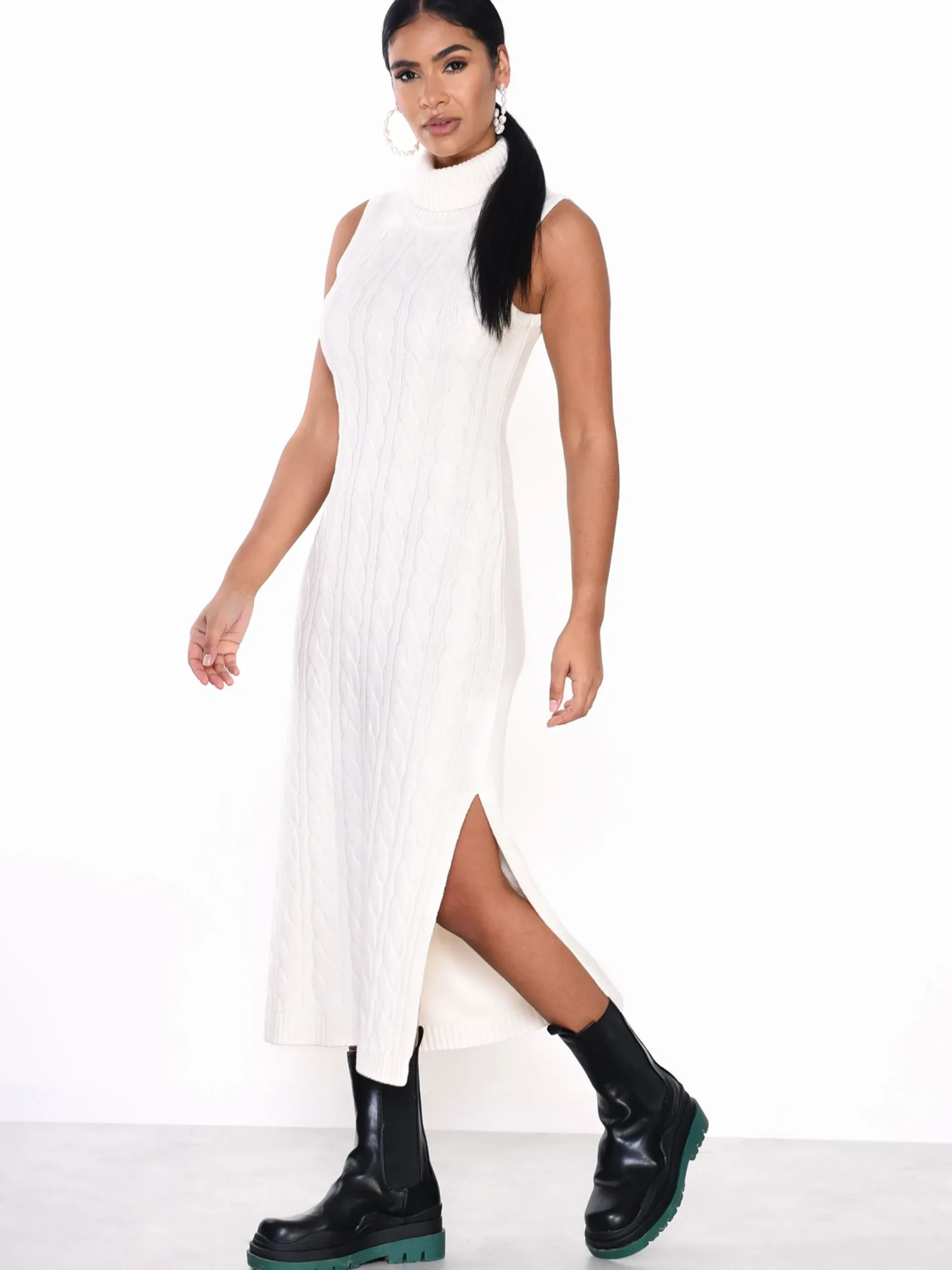 Glamorous Womens Cream side Split High Neck Knit Midi Dress. This super on trend midi dress is the must have staple piece this season. Featuring a midi style, side split detail and cable knit style this dress is super flattering addition to your closet! Style with your favourite high knee boots for the daytime and switch to heels for the evening.