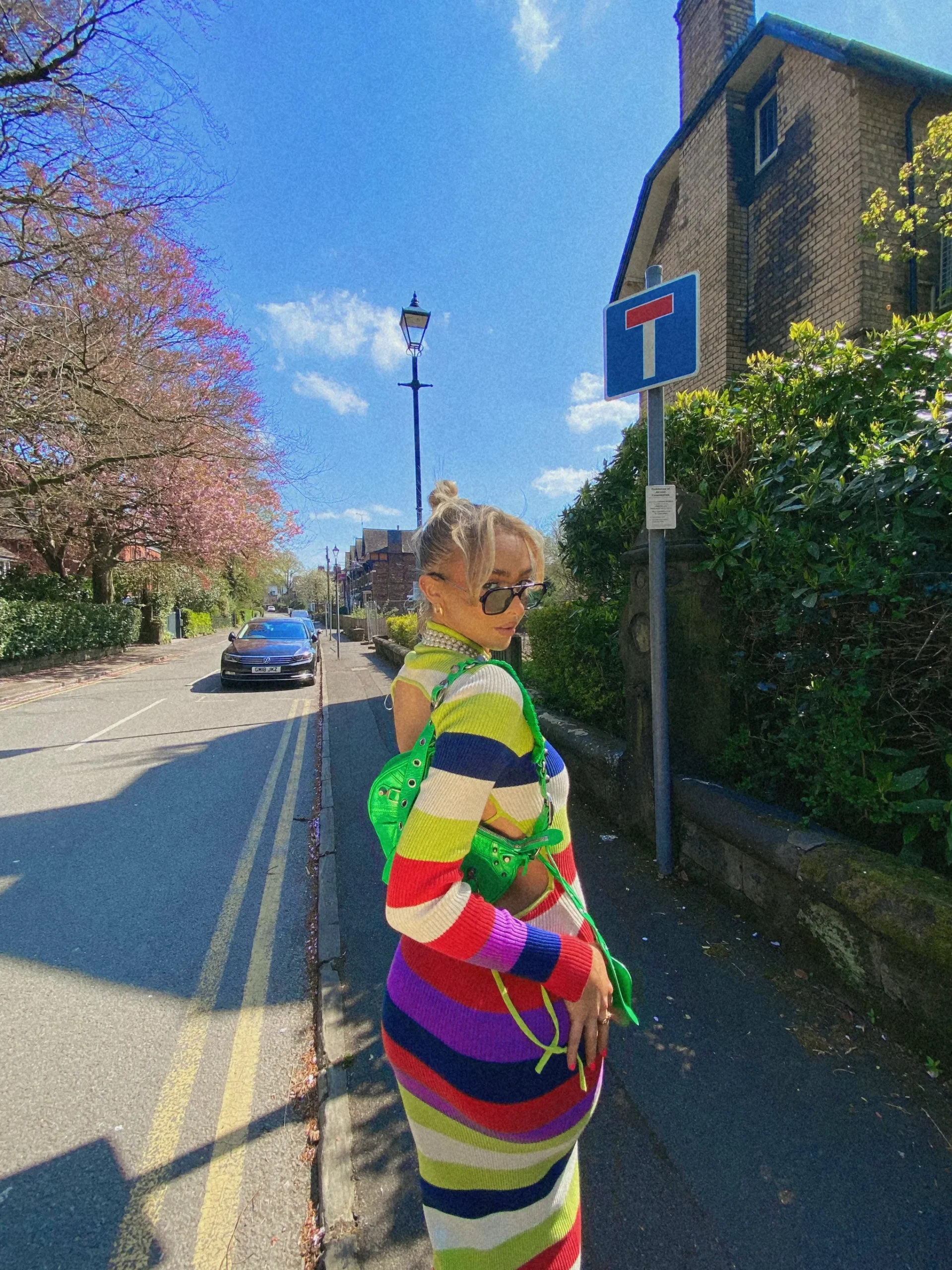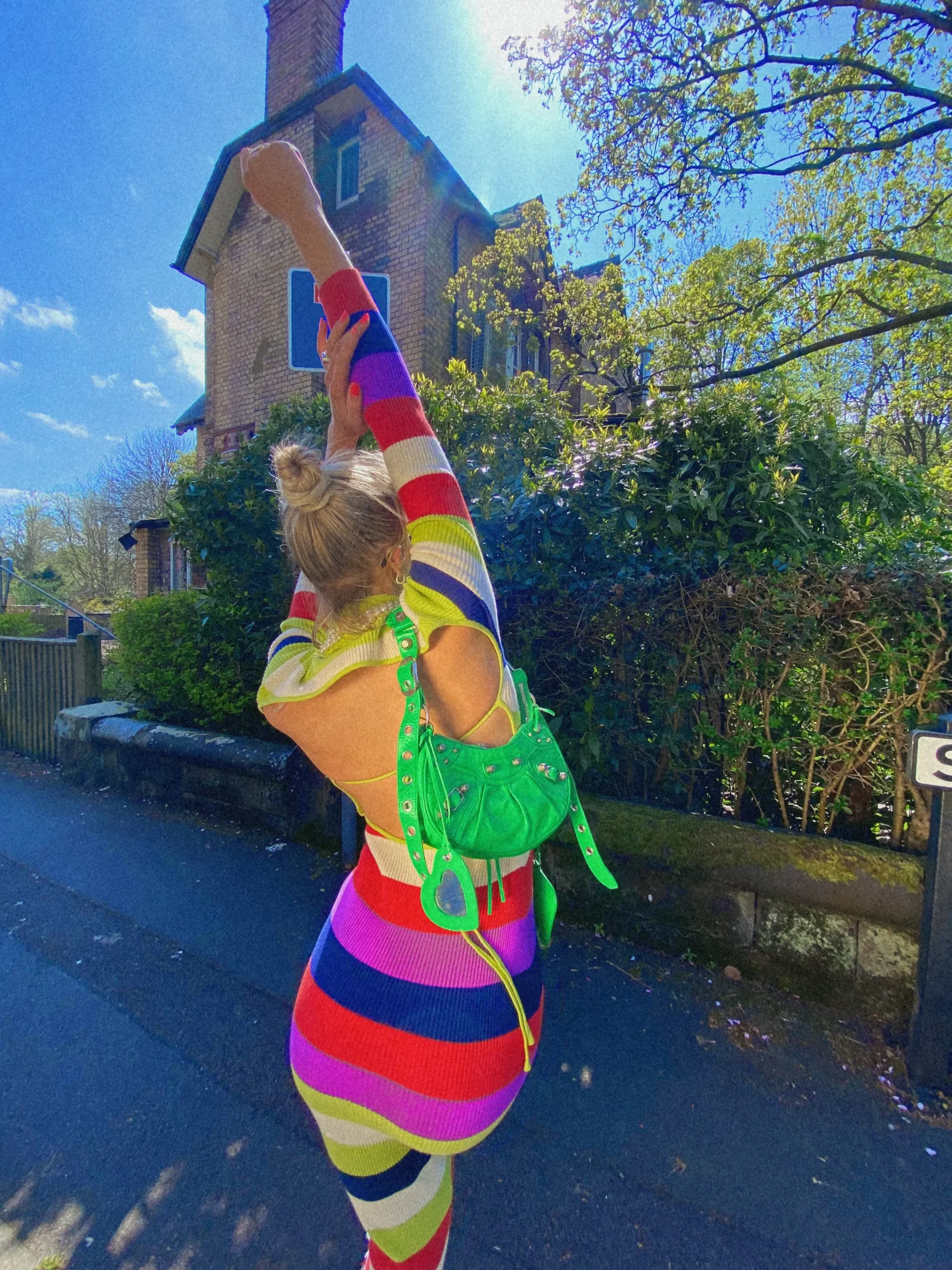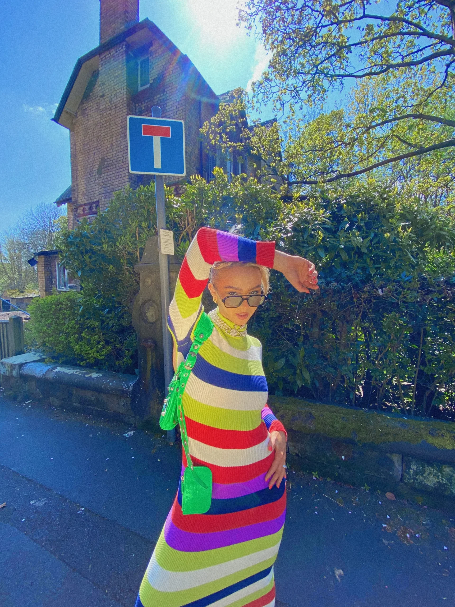Glamorous Multi Stripe Knitted Midi Dress with Open Back. We cant get enough of this colourful stripe knit midi dress. Featuring long sleeves, and an open back, this really is a head turning piece.