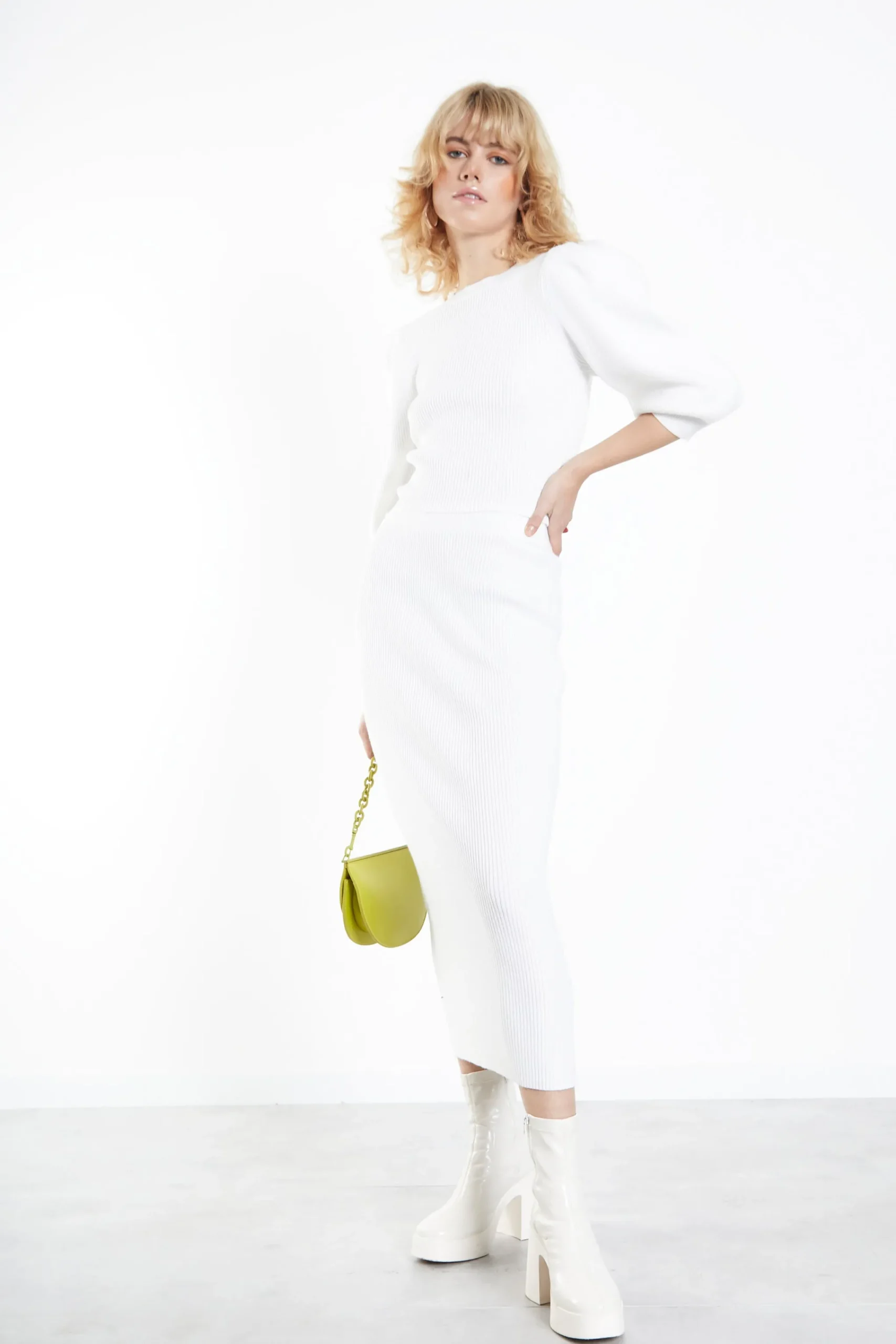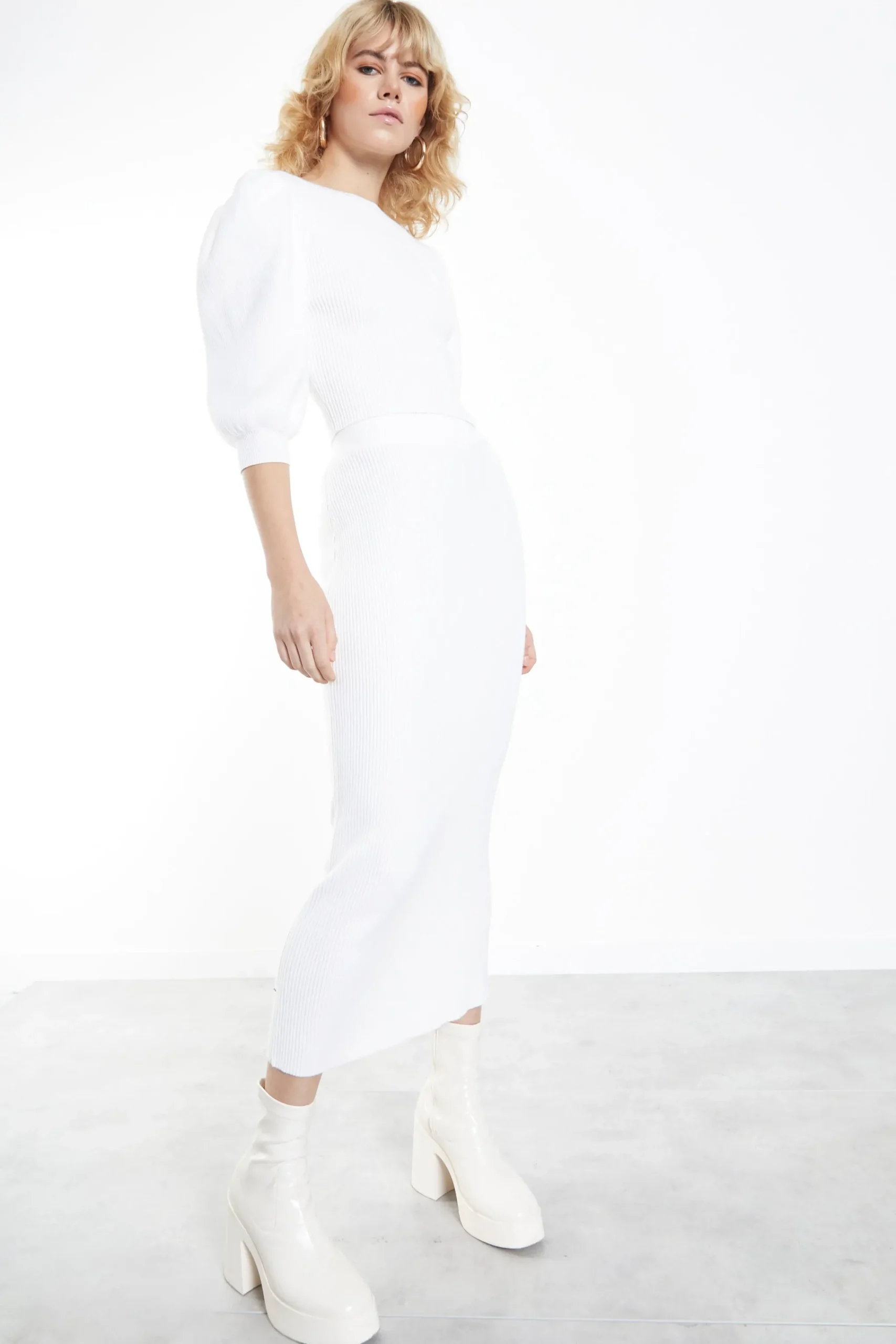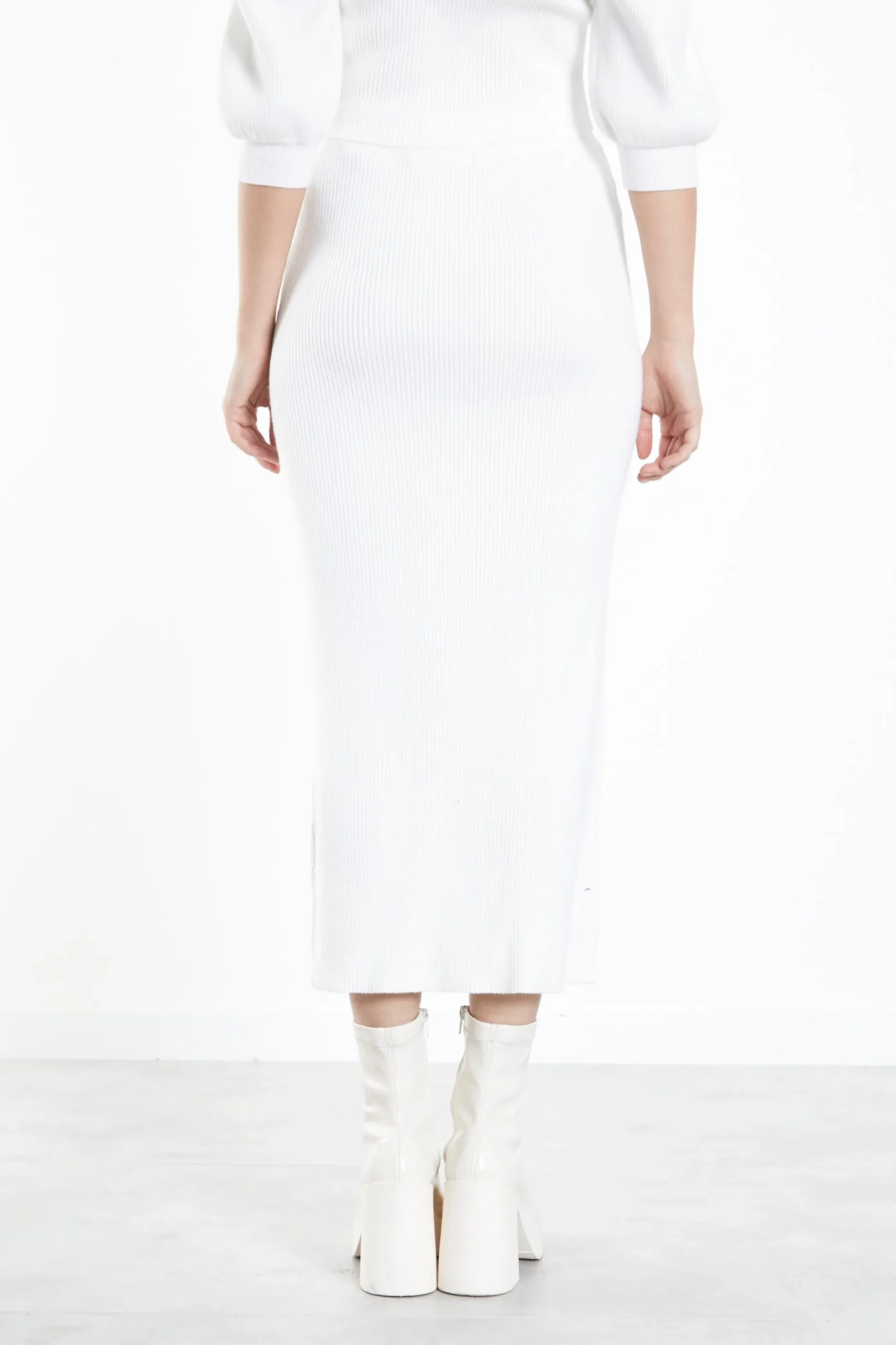 Glamorous Off White Knitted Midi Skirt. This staple midi skirt is perfect for your Autumn wardrobe. Pair with matching co ord jumper and some heeled boots for the perfect on trend look.