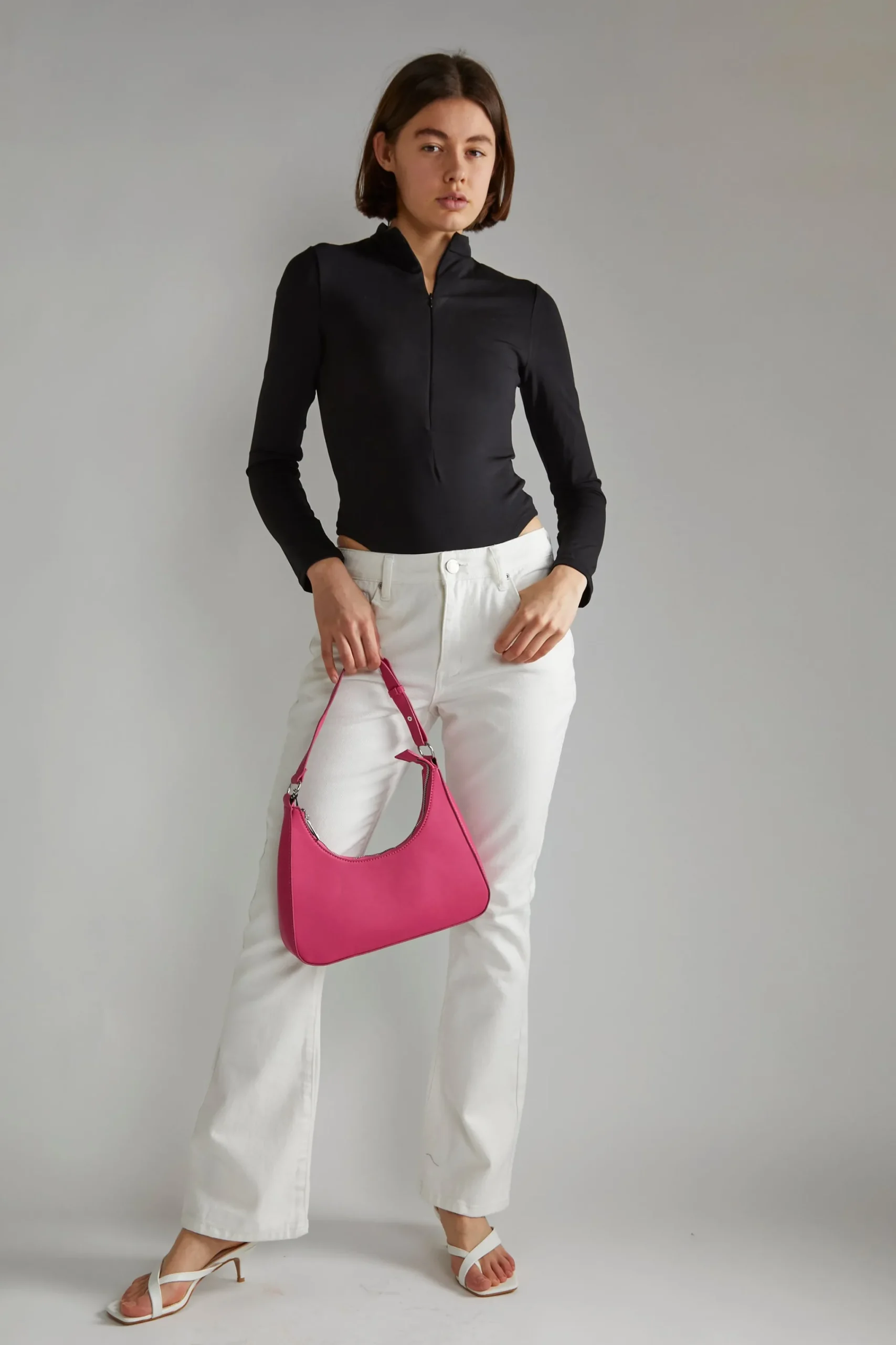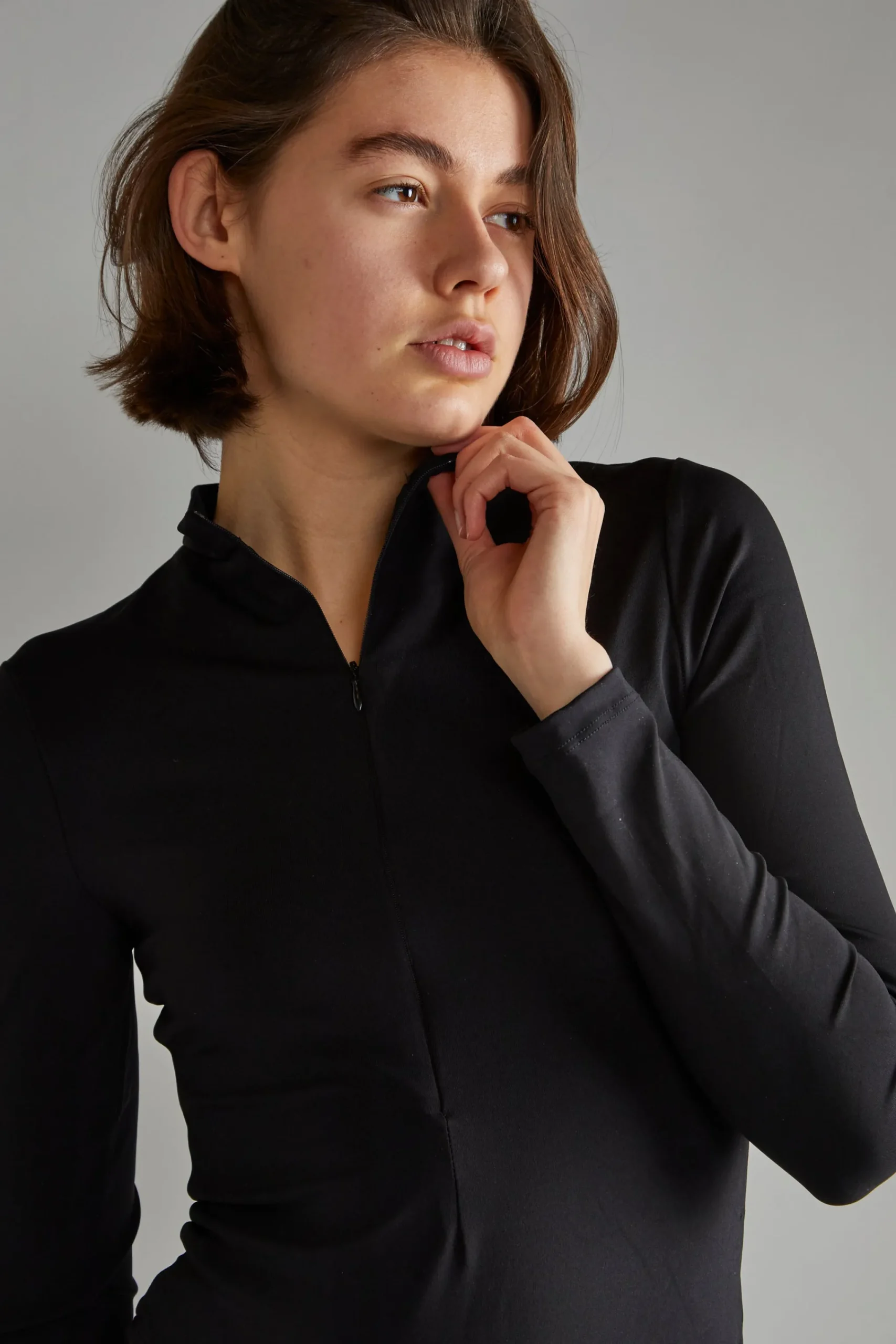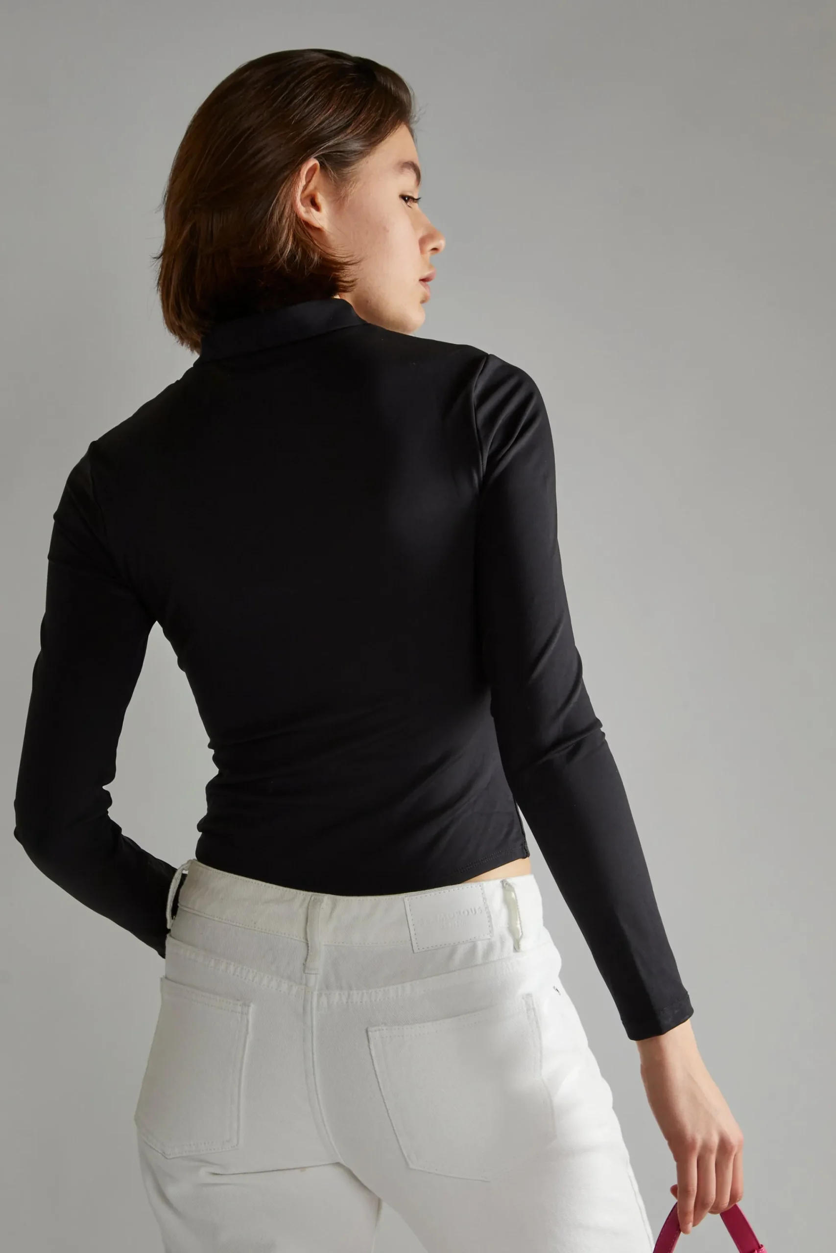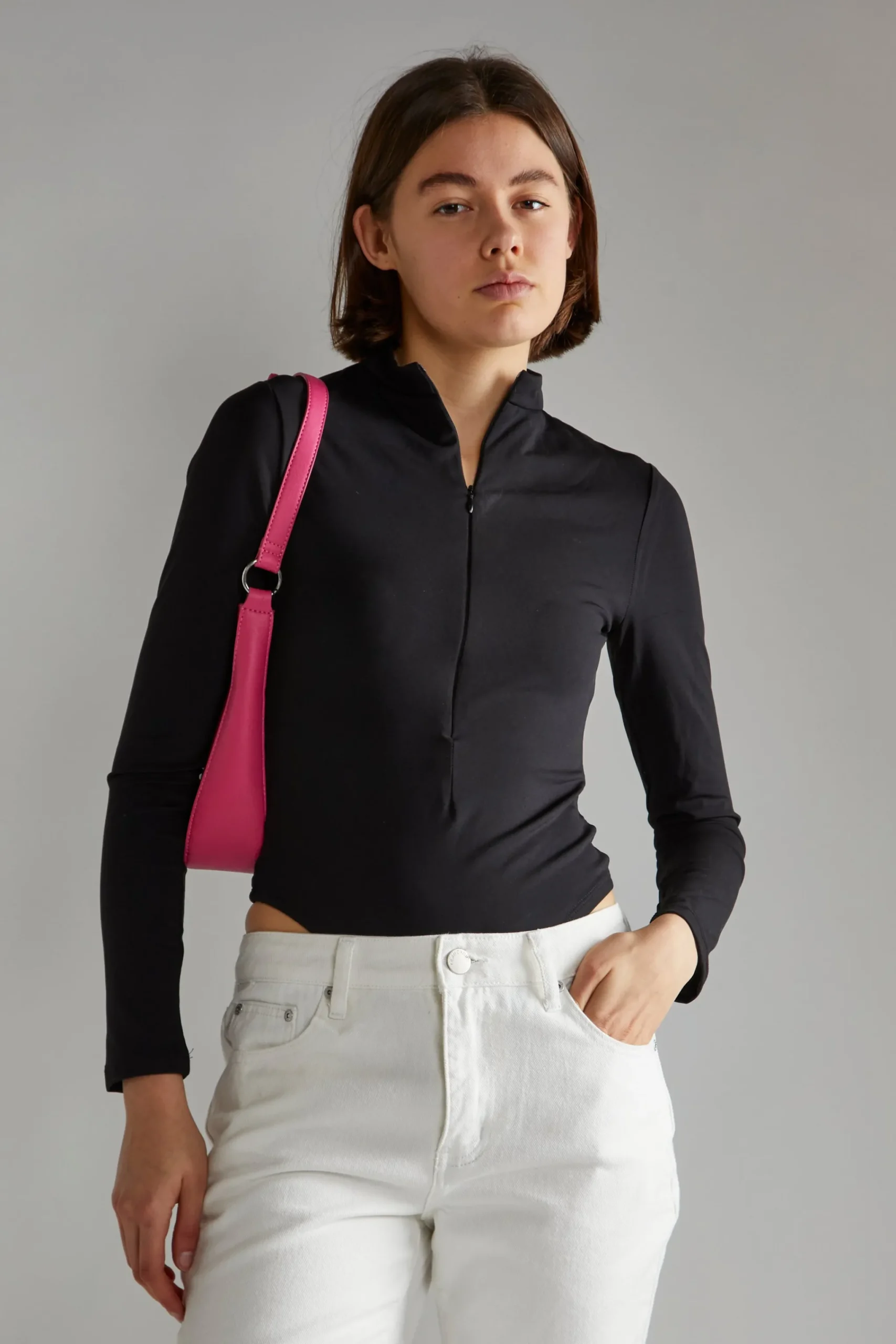 Glamorous Women’s Black Long-Sleeve Zip-Up Bodysuit. Dress to impress in this perfect Black Long-Sleeve Zip-Up Bodysuit! This bodycon fit will hug all the right curves, while the high neck and long sleeves provide a look that’s chic-yet-comfy. Style under one of our perfectly tailored suit sets for a that modern city girl look!