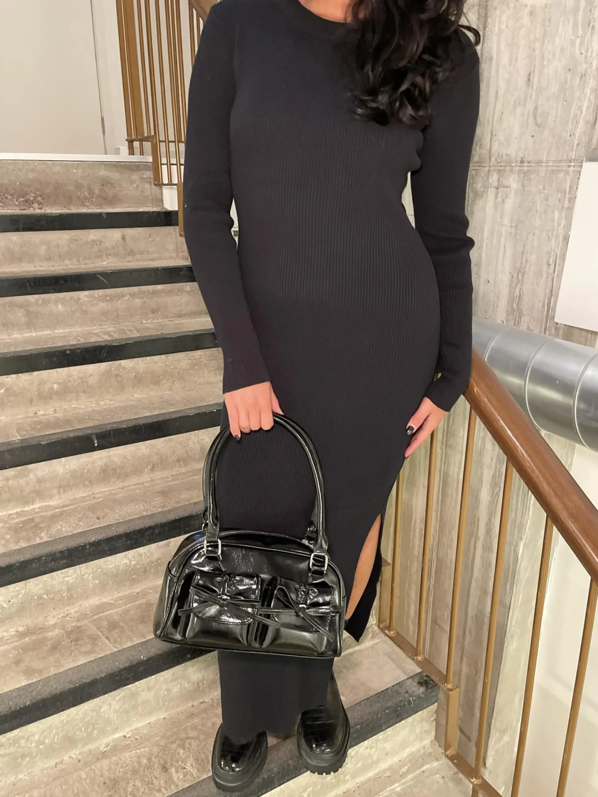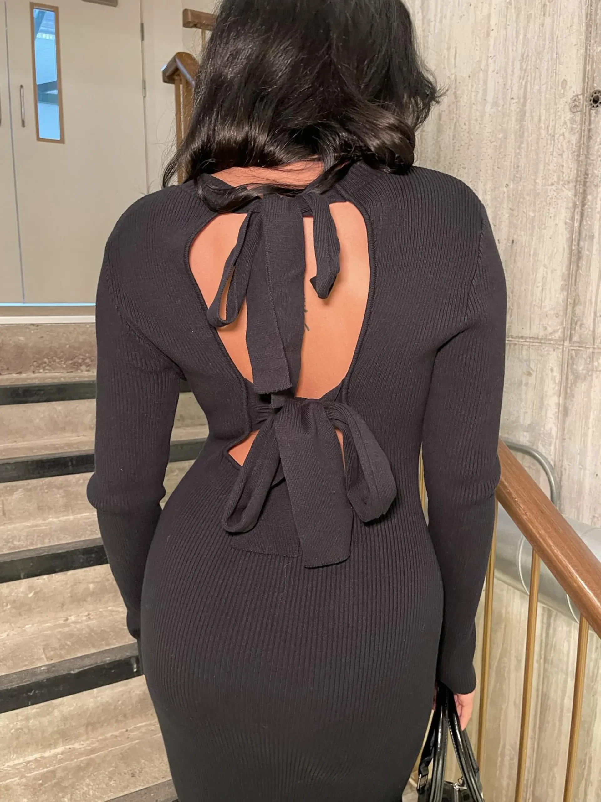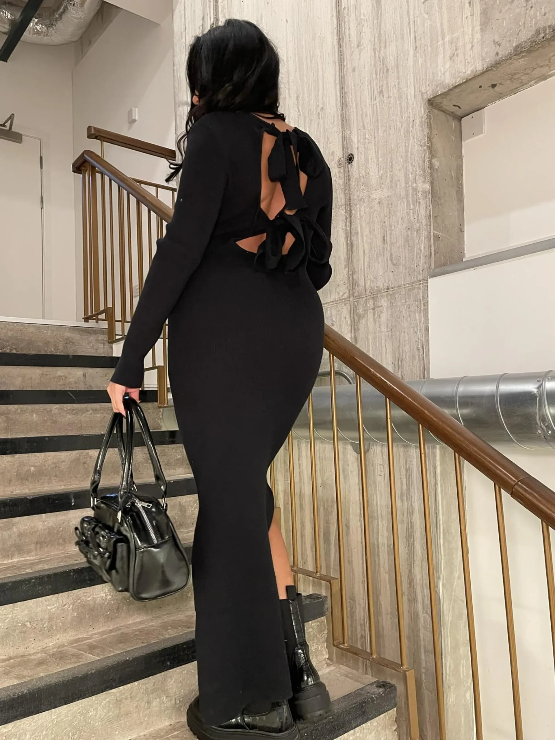 Glamorous Women’s Black Bow-Back Maxi-Dress. This Black Bow Back Maxi Dress brings together elegance and comfort with a sleek bodycon fit that highlights your figure. The standout feature is the delicate bow tie at the back, adding a subtle touch of charm while keeping the overall look clean and minimal. With its long sleeves, this dress offers just the right amount of coverage, making it a great choice for cooler evenings or more formal events. The maxi length adds a graceful finish, perfect for pairing with simple heels or your favourite boots. Whether you’re dressing it up or down, this dress offers an easy, flattering style that you’ll love wearing time and again.
