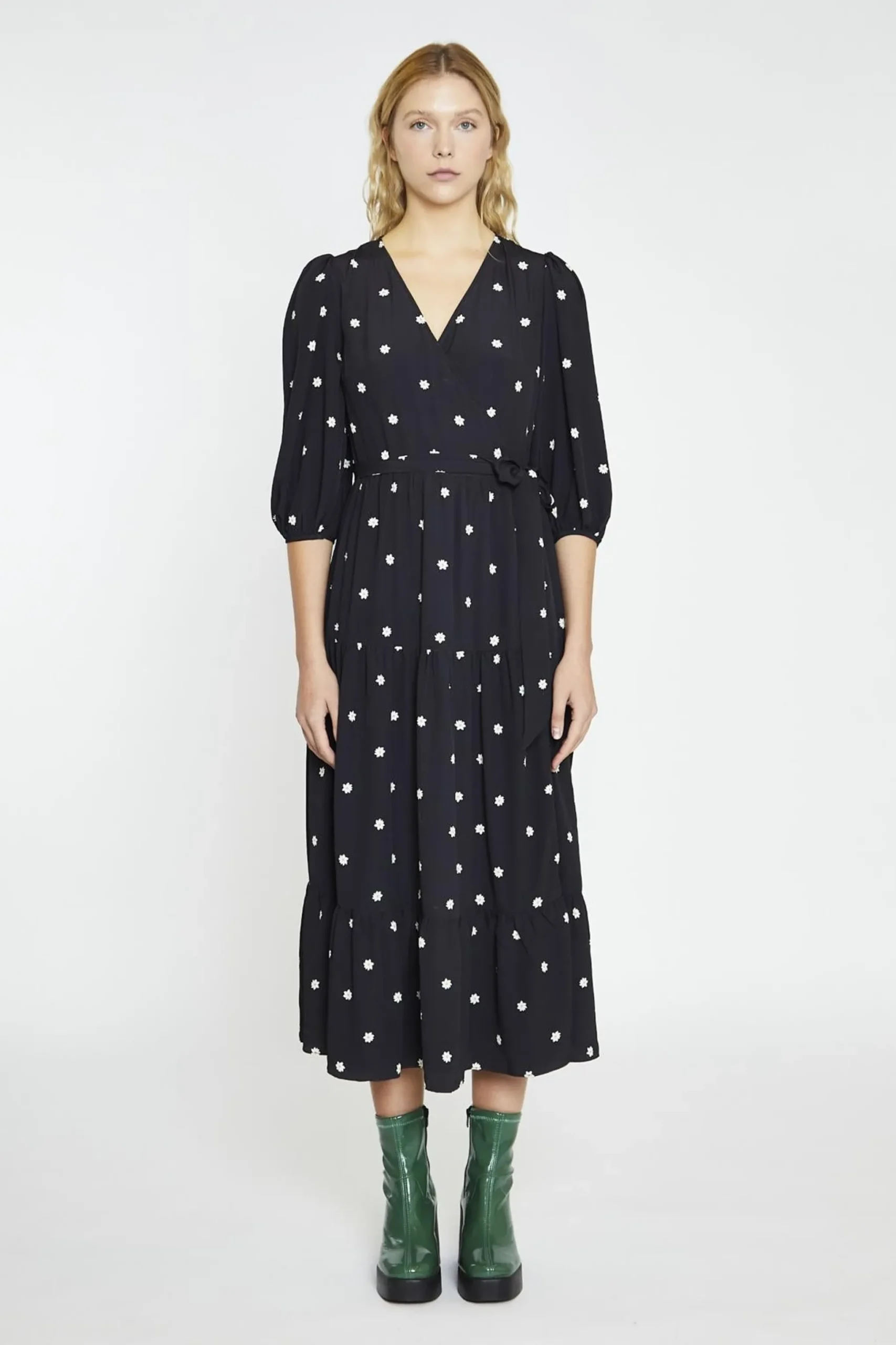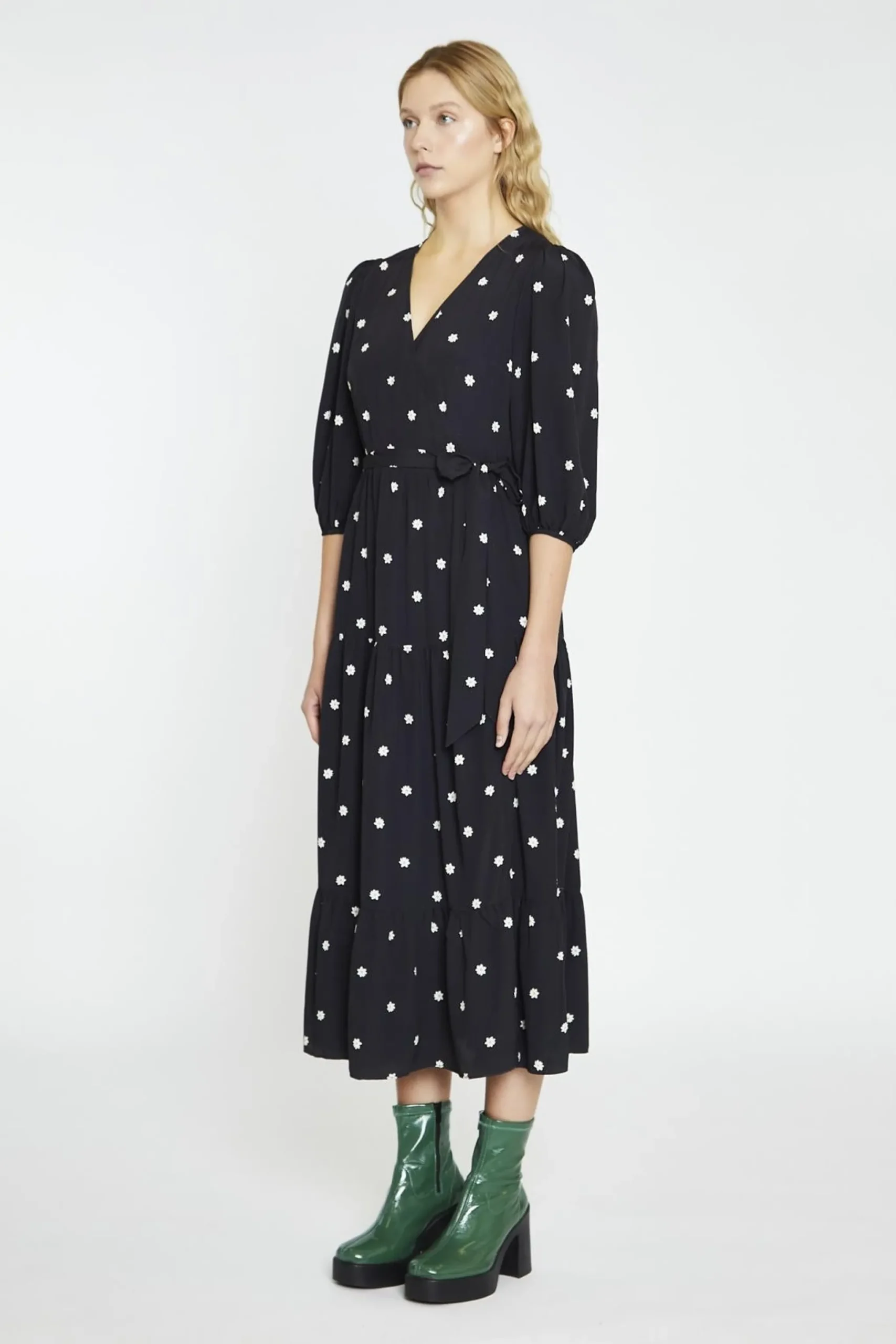Glamorous Women’s Black Daisy V-Neck Wrap Midi-Dress. This black midi-dress brings a playful touch to your wardrobe with its charming daisy floral print. The wrap design creates a flattering V-neckline and allows you to adjust the fit to suit your style. With 3/4 sleeves, it’s a great option for transitional weather or adding a bit of coverage on breezy days. The flowy silhouette makes it comfortable for all-day wear while still looking polished. Pair it with sandals or flats for a casual daytime look, or dress it up with heels and a clutch for an evening out. The timeless floral pattern and versatile length make this dress an easy choice for everything from brunch dates to special occasions.