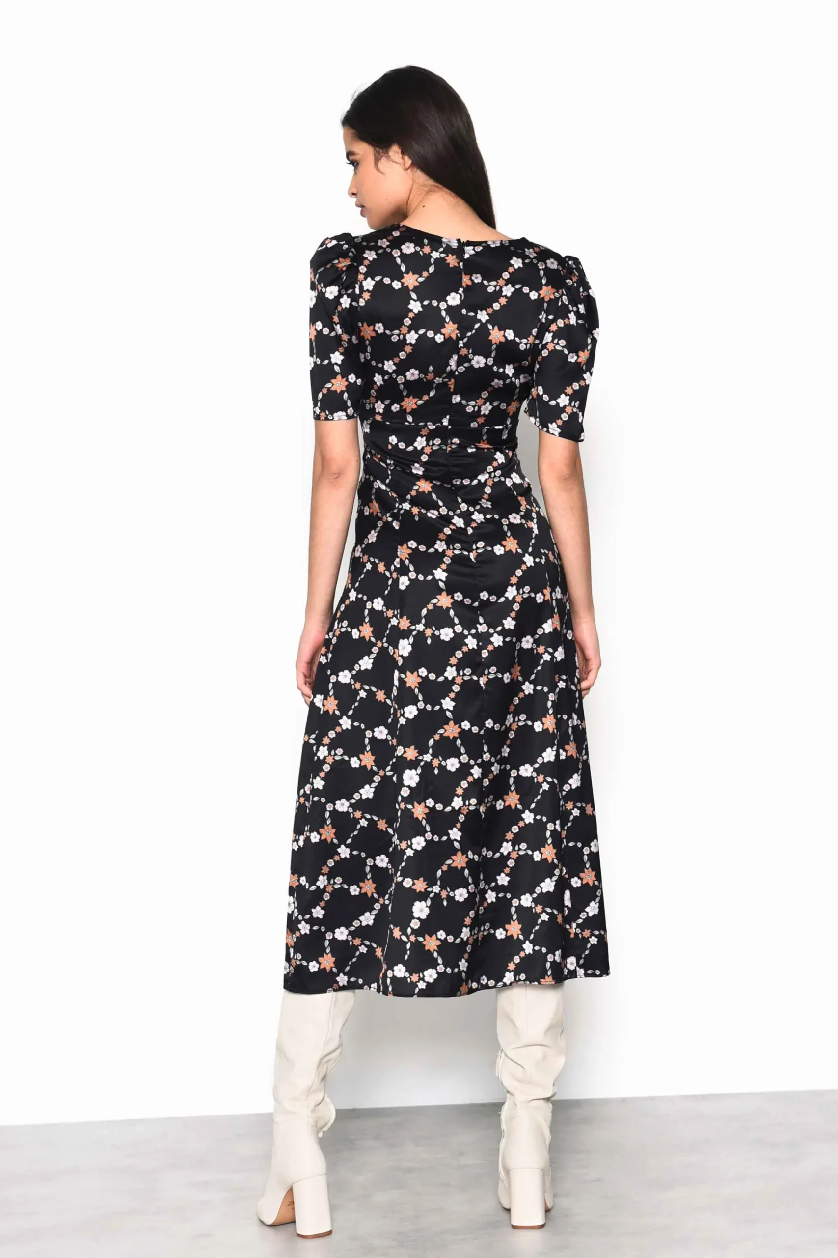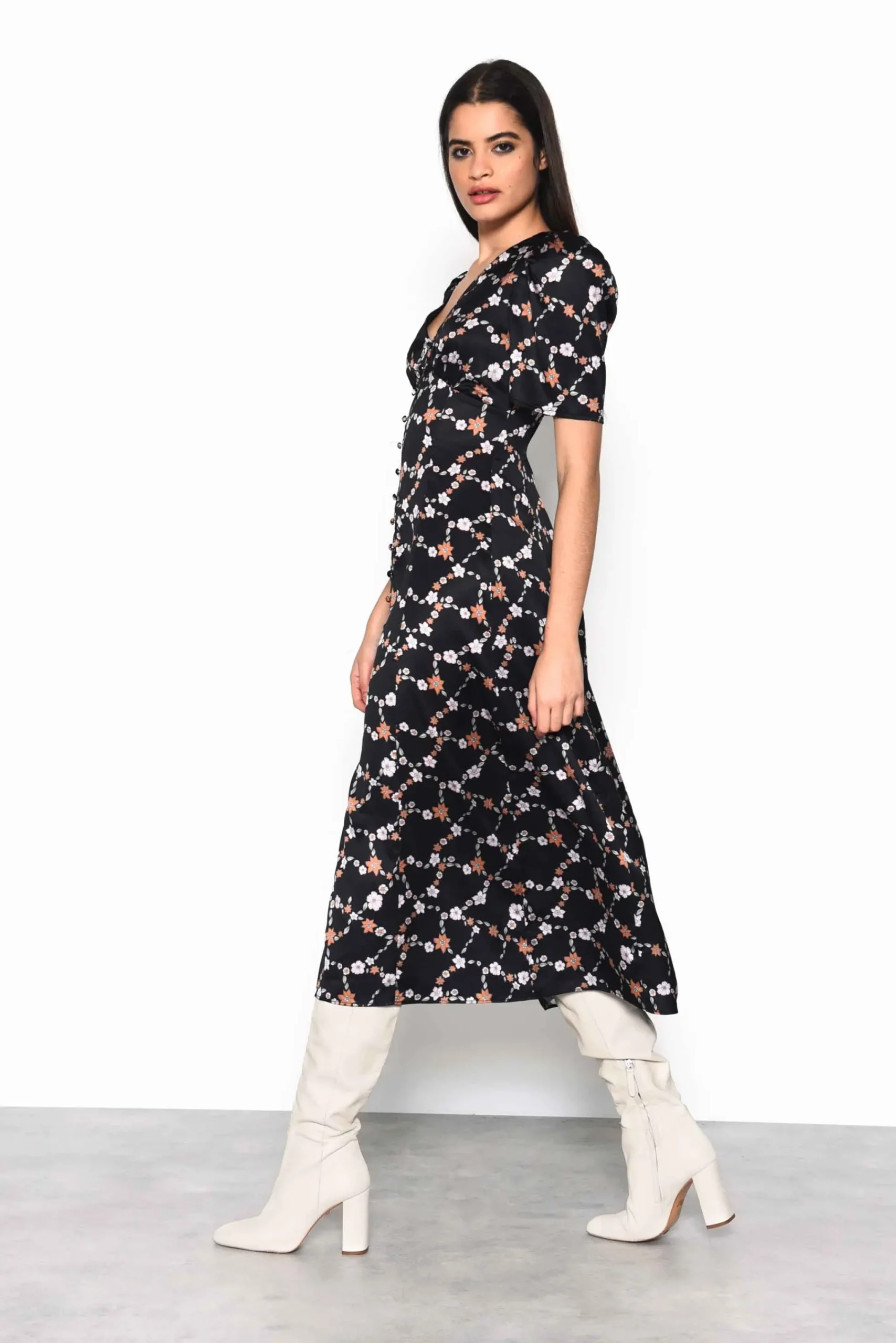 Glamorous Chain Floral Button Down Midi Dress with Plunging Neckline, Gathered Bust Detail and Puff Sleeves. We love a midi dress here at glamorous and this one is no exception! Featuring a plunging neckline, button down design and puff sleeves, this dress is an autumn winner! Style with Knee high boots and a cropped jackets for a trendy brunch look!