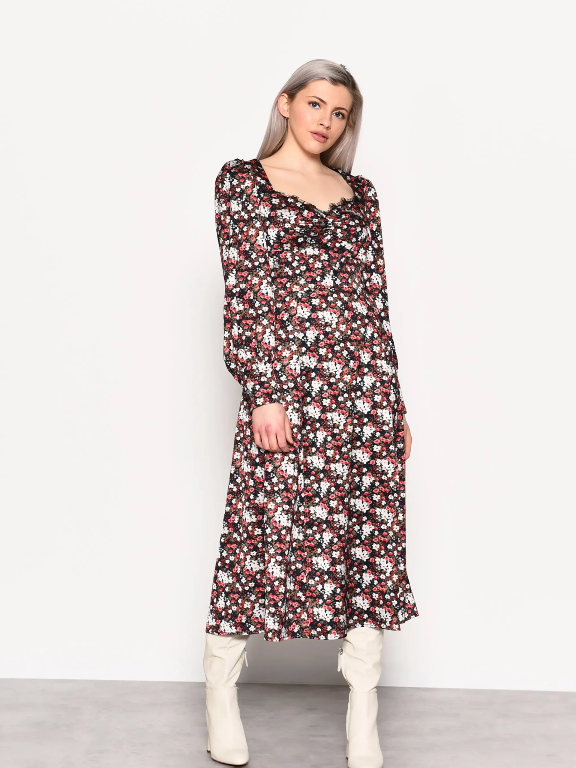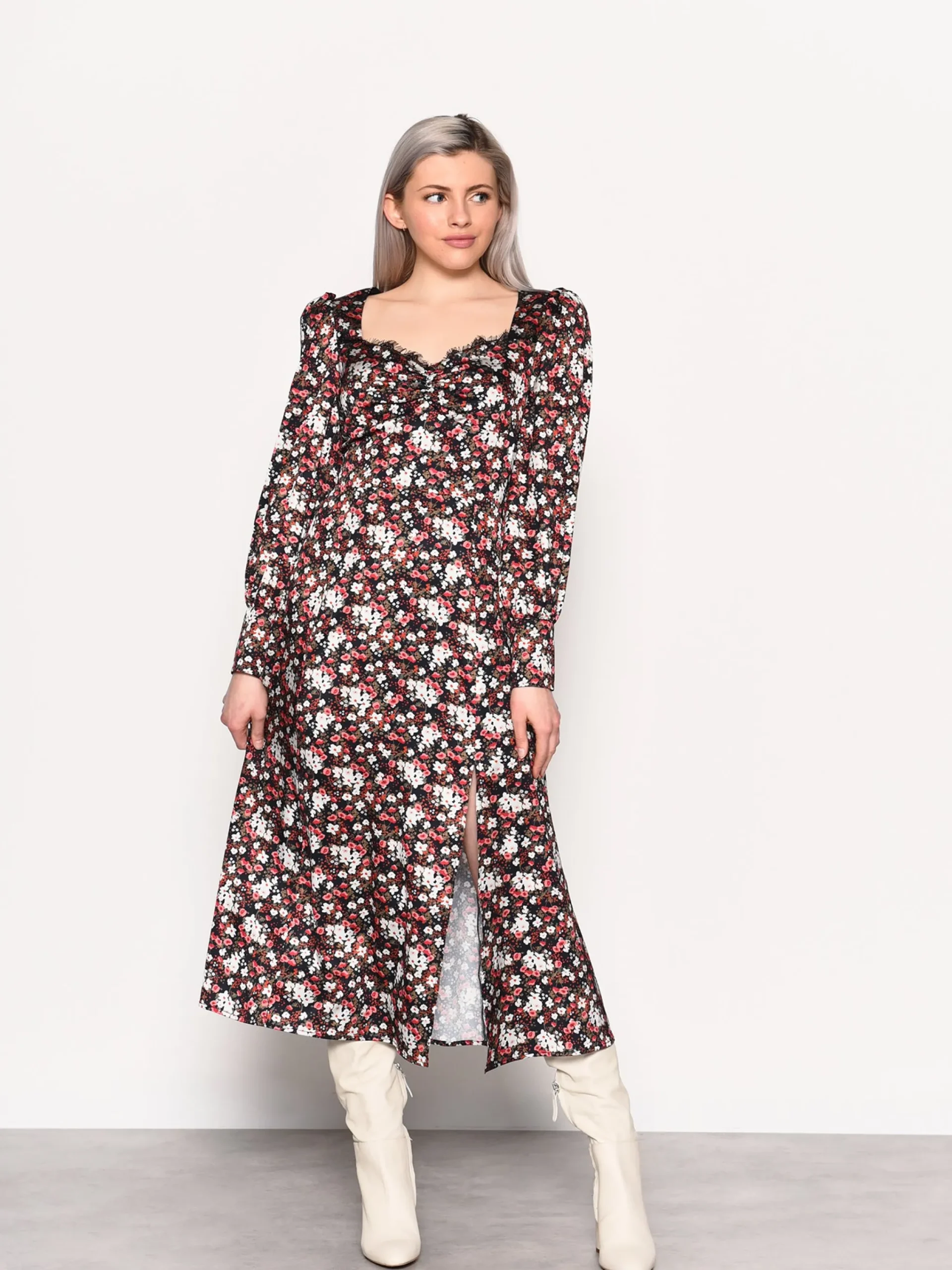 Glamorous Women’s Winter Ditsy Floral Side Split Midi Dress. This autumn winter, florals are all the rage. This lace front detailed midi dress is designed with a side split for a feminine interpretation to a style staple.