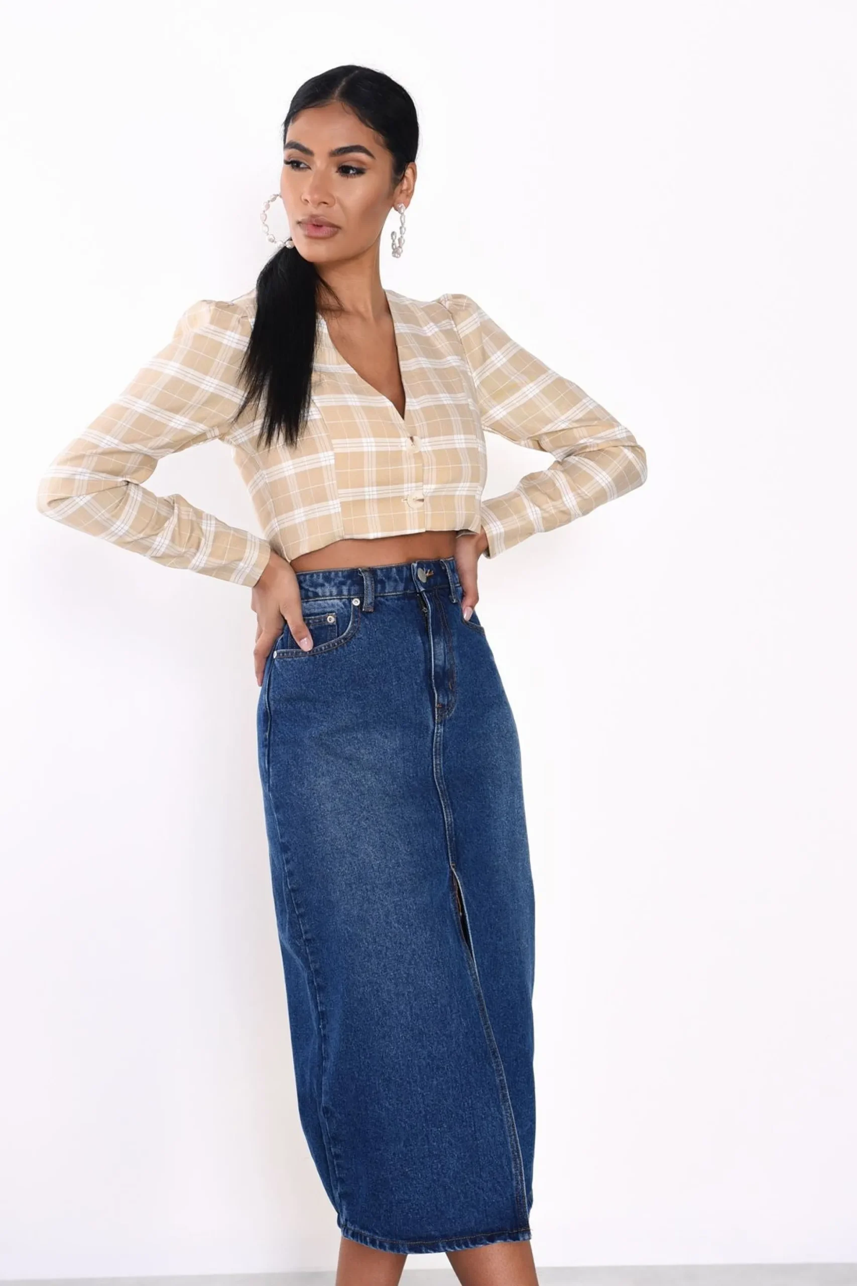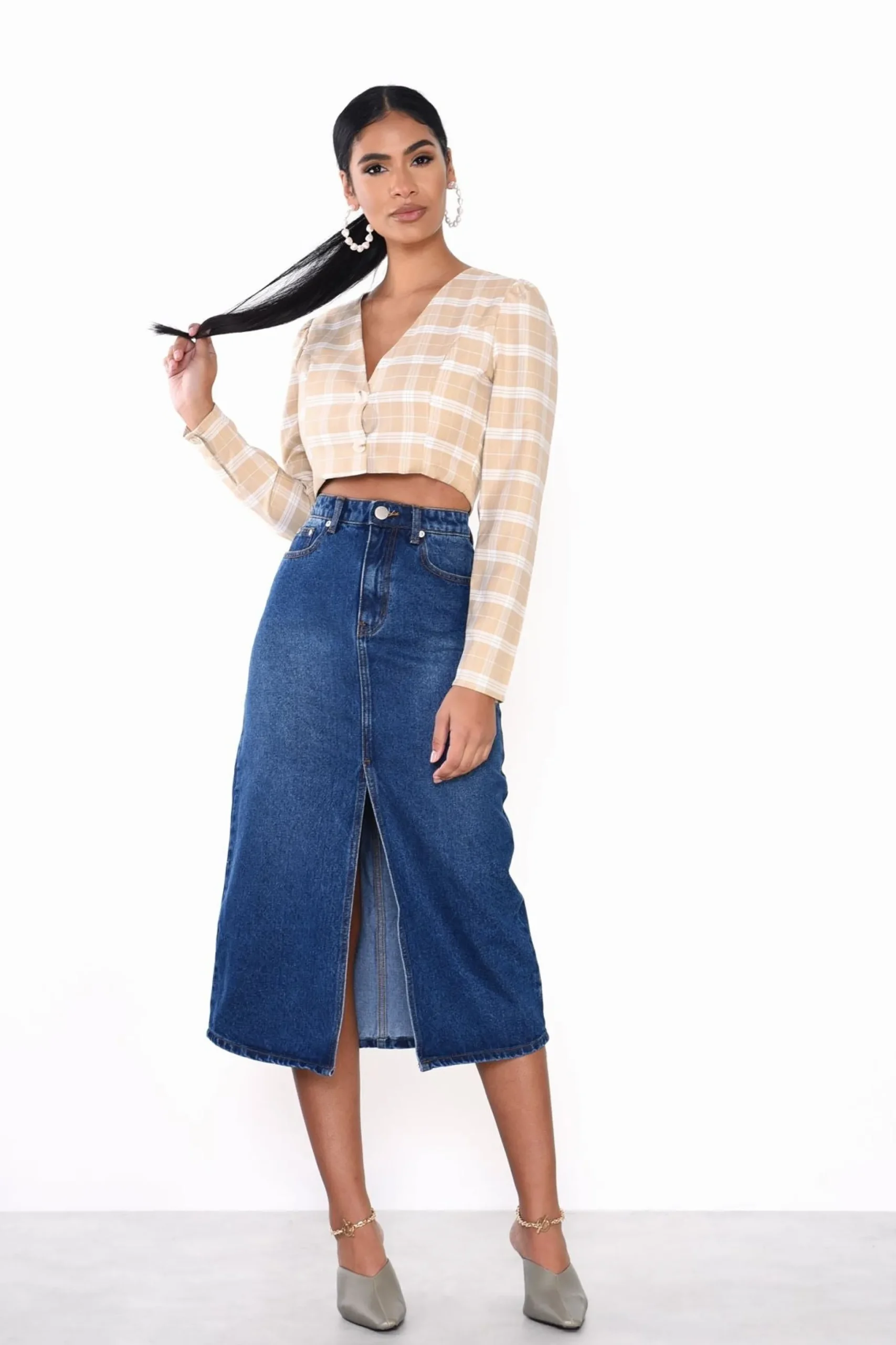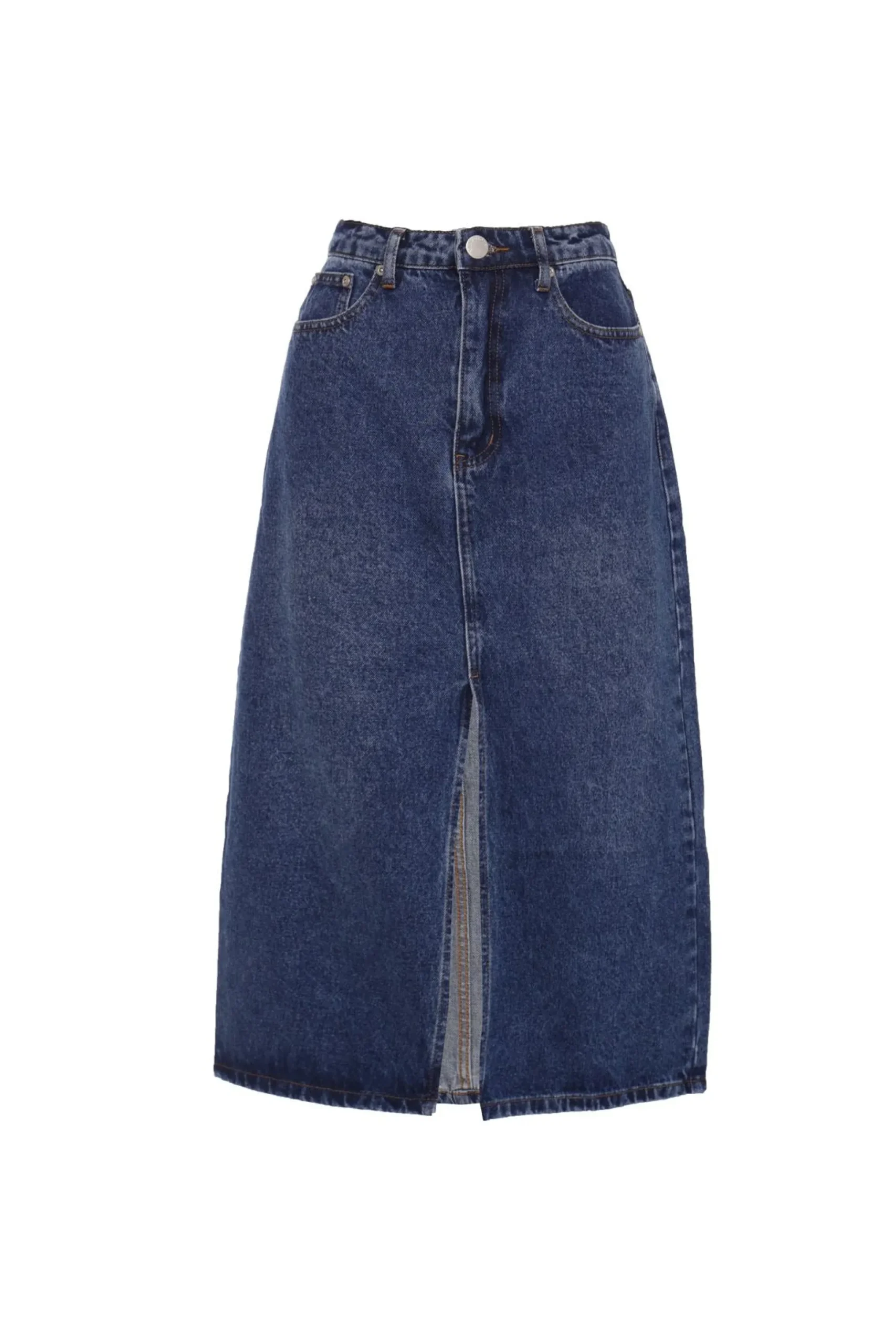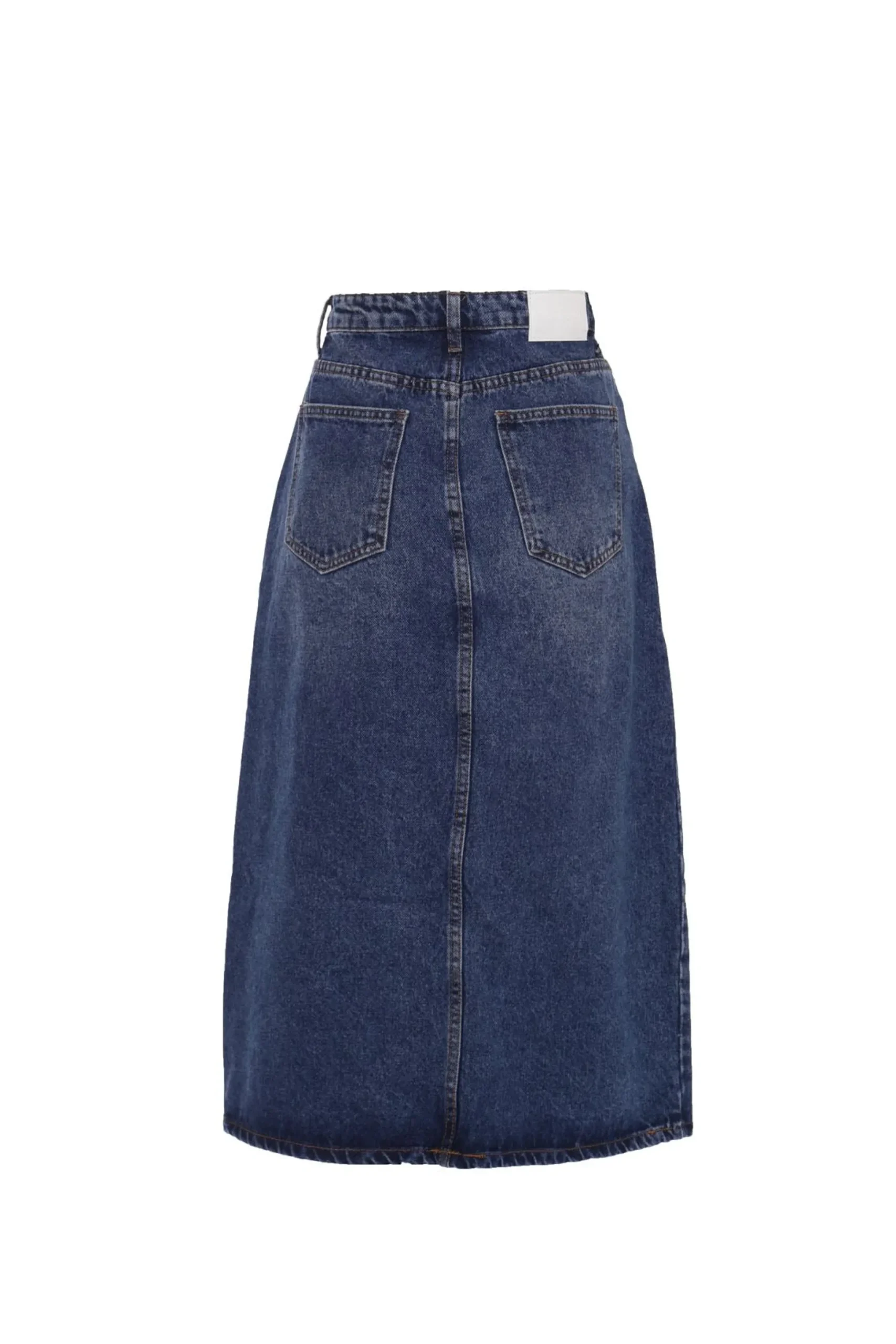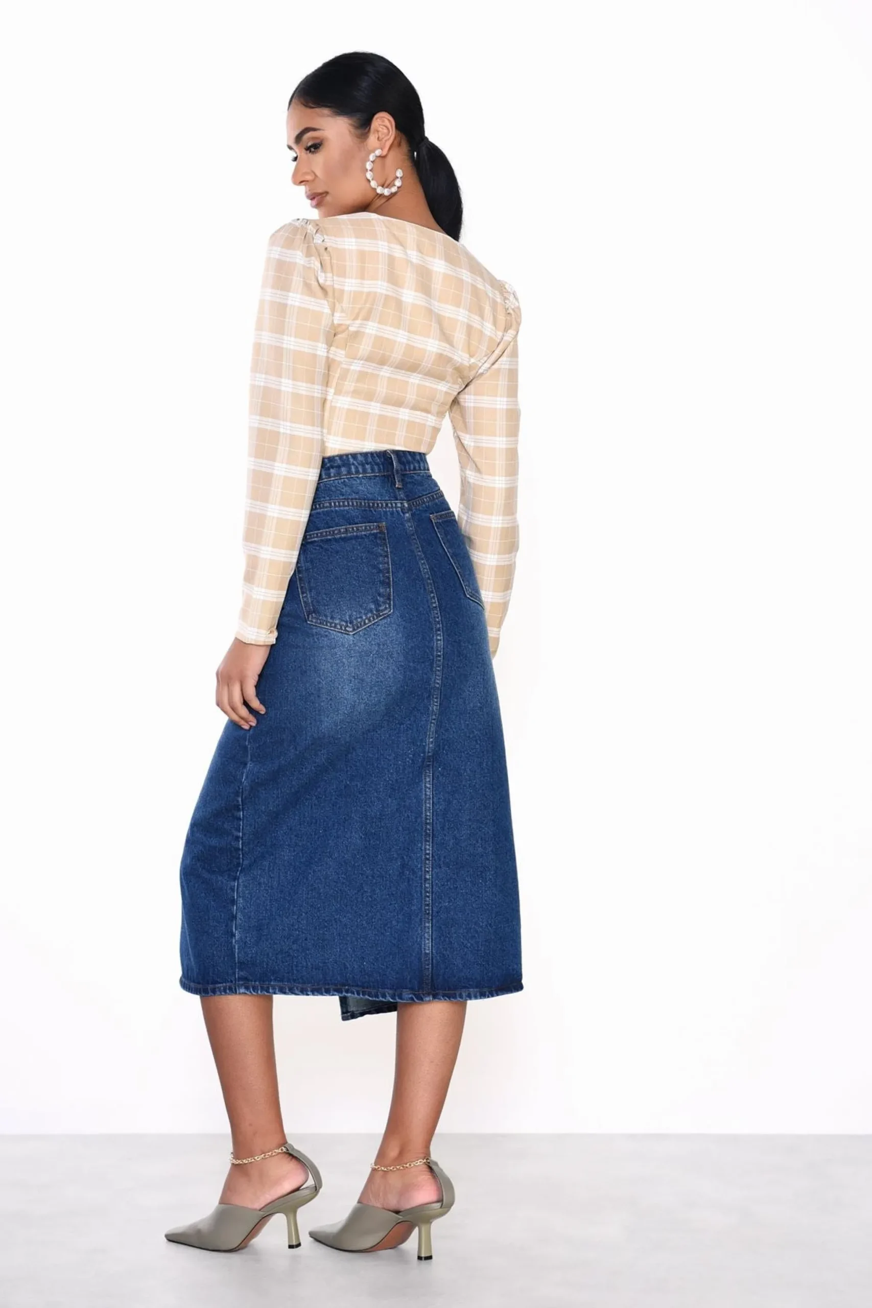 Glamorous Dark Blue Stonewash Split High Waisted Midi Skirt. This on trend skirt will look amazing on you! We love this skirt here at