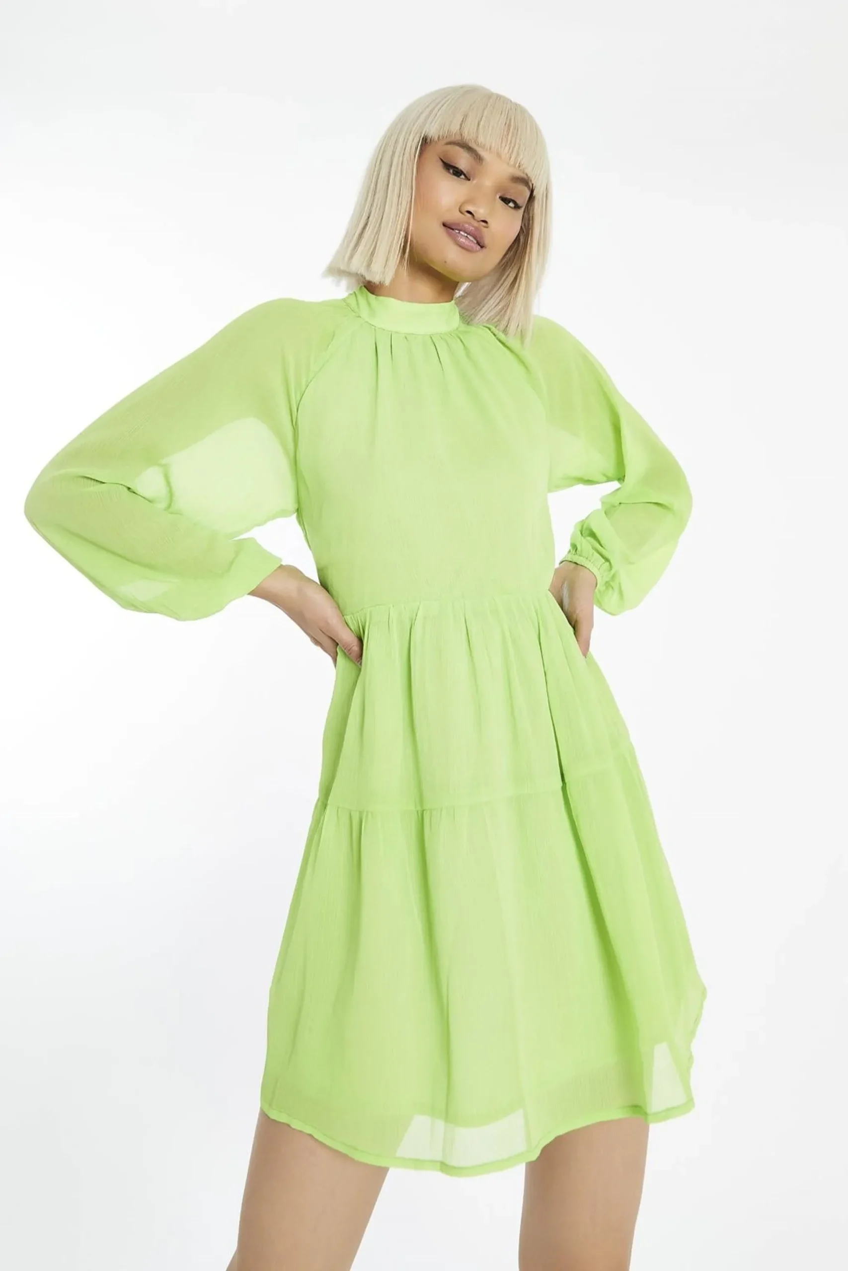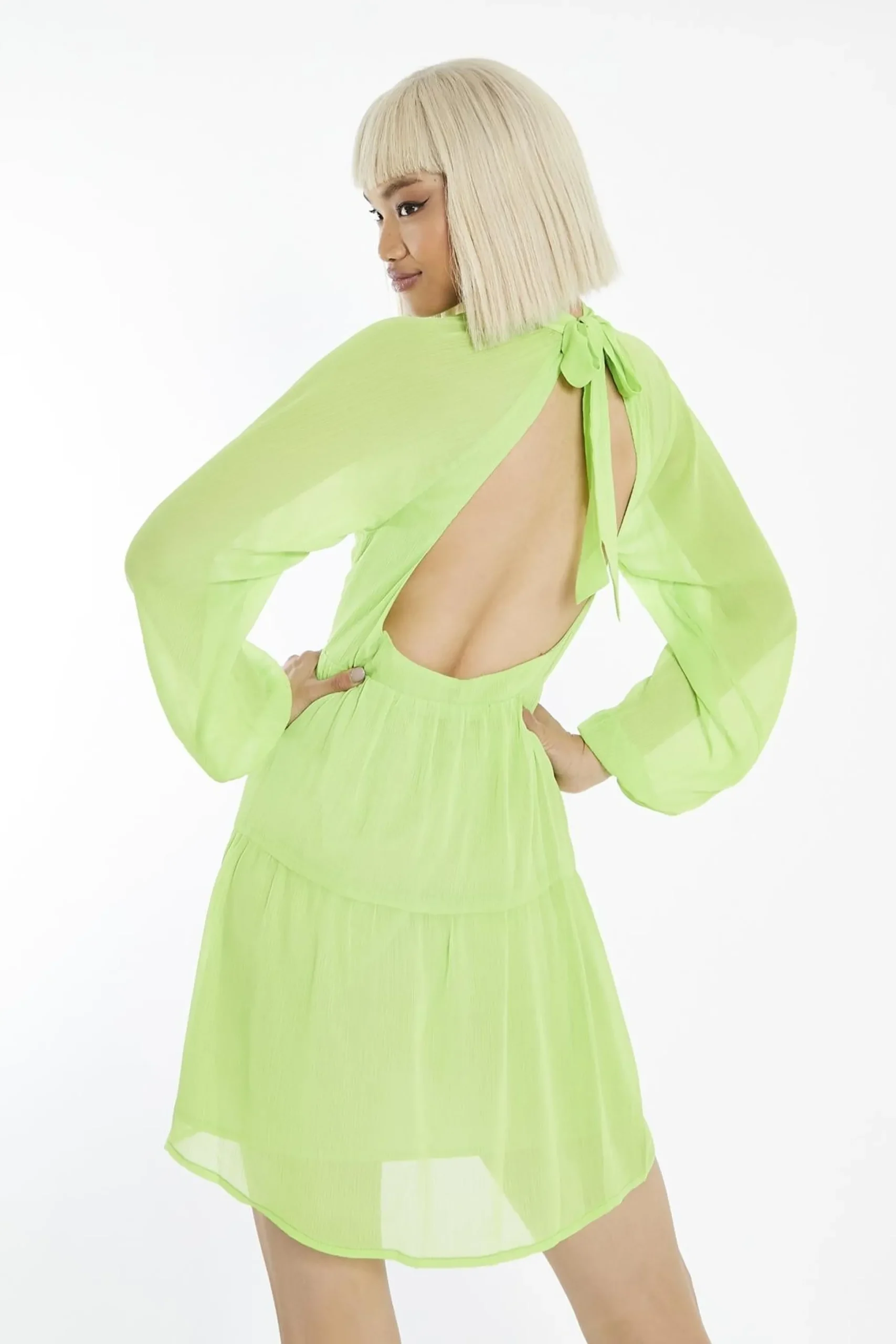 Glamorous Women’s Acid-Lime Long-Sleeve-Open-Back Mini-dress. Bring bold energy to your wardrobe with this acid-lime long-sleeve mini dress. Featuring a high neckline for a sleek and modern look, this dress balances its striking colour with elegant design details. The open-back design adds a daring twist, while the tie-back closure allows you to adjust the fit for comfort and style. Long sleeves provide a chic contrast to the shorter length, making it perfect for cooler evenings or when you want a little extra coverage. Pair it with statement heels and minimal accessories to let the dress shine, or add chunky boots and a leather jacket for an edgy vibe. The lightweight fabric ensures you’ll feel as good as you look, making this dress a standout choice for nights out, parties, or any occasion where you want to turn heads. It’s a fun and vibrant piece that brings confidence and personality to your wardrobe.