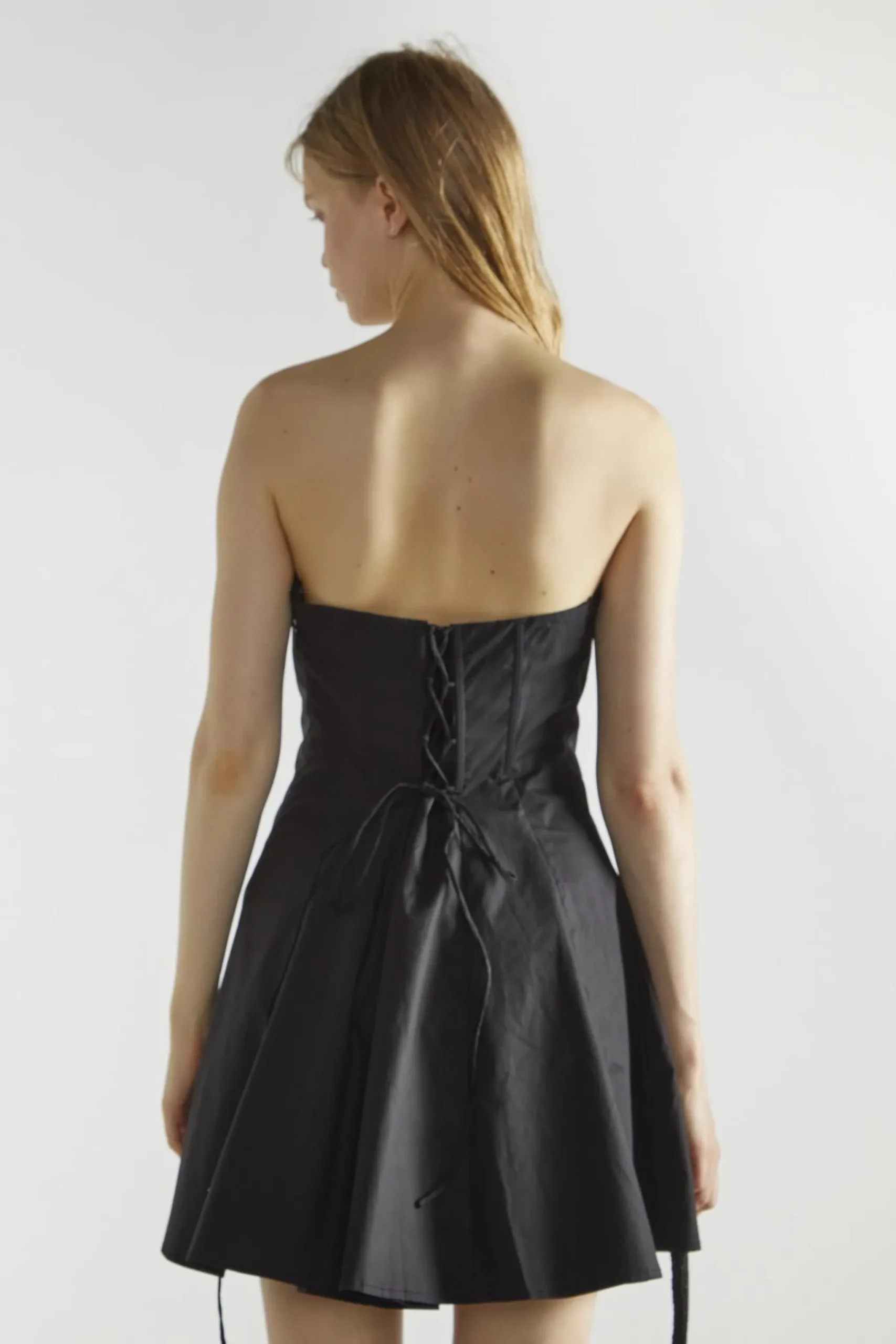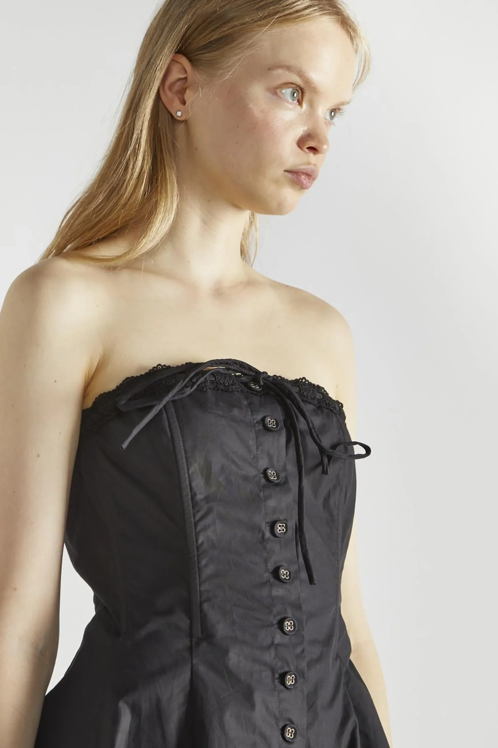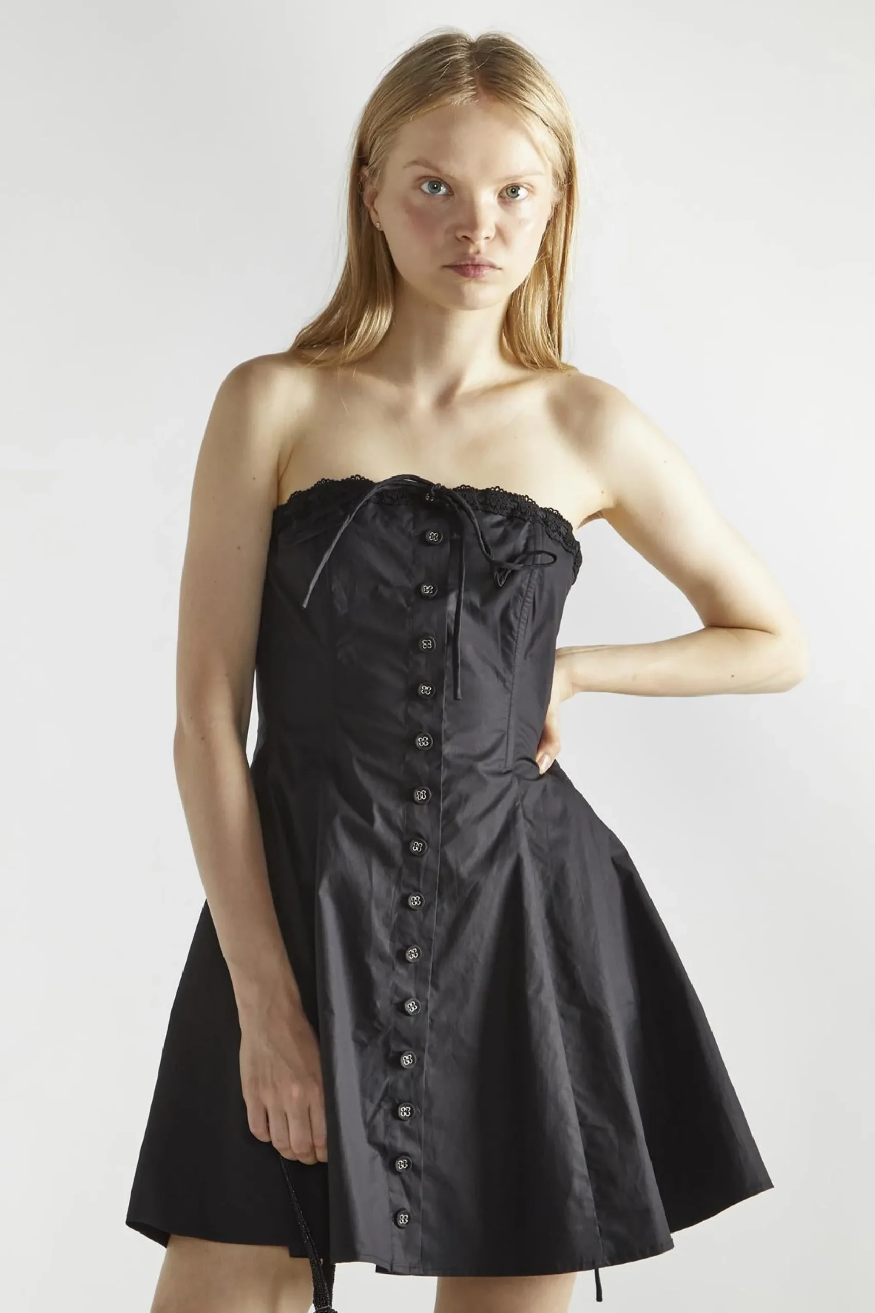 Glamorous Women’s Black Cotton Bandeau Pleated Mini-Dress. This cotton bandeau mini dress is a delightful fusion of playful charm and feminine allure. The pleated design adds a touch of whimsy, creating beautiful movement as you twirl and dance. The button front feature allows for easy wear and gives you the option to adjust your neckline to your liking. Delicate lace detailing adds a romantic touch, perfect for those who appreciate a bit of vintage-inspired flair. The tie front and back details offer a customizable fit and create eye-catching focal points. This dress is all about versatility – wear it strapless for a bold look, or use the ties to create halter or off-shoulder styles. The mini length shows off your legs, making it ideal for warm summer days or nights out on the town. Pair it with strappy sandals and a wide-brimmed hat for a chic daytime ensemble, or dress it up with heels and statement jewellery for evening events. The dark hue makes it a timeless piece that you’ll reach for season after season, always feeling confident and stylish.