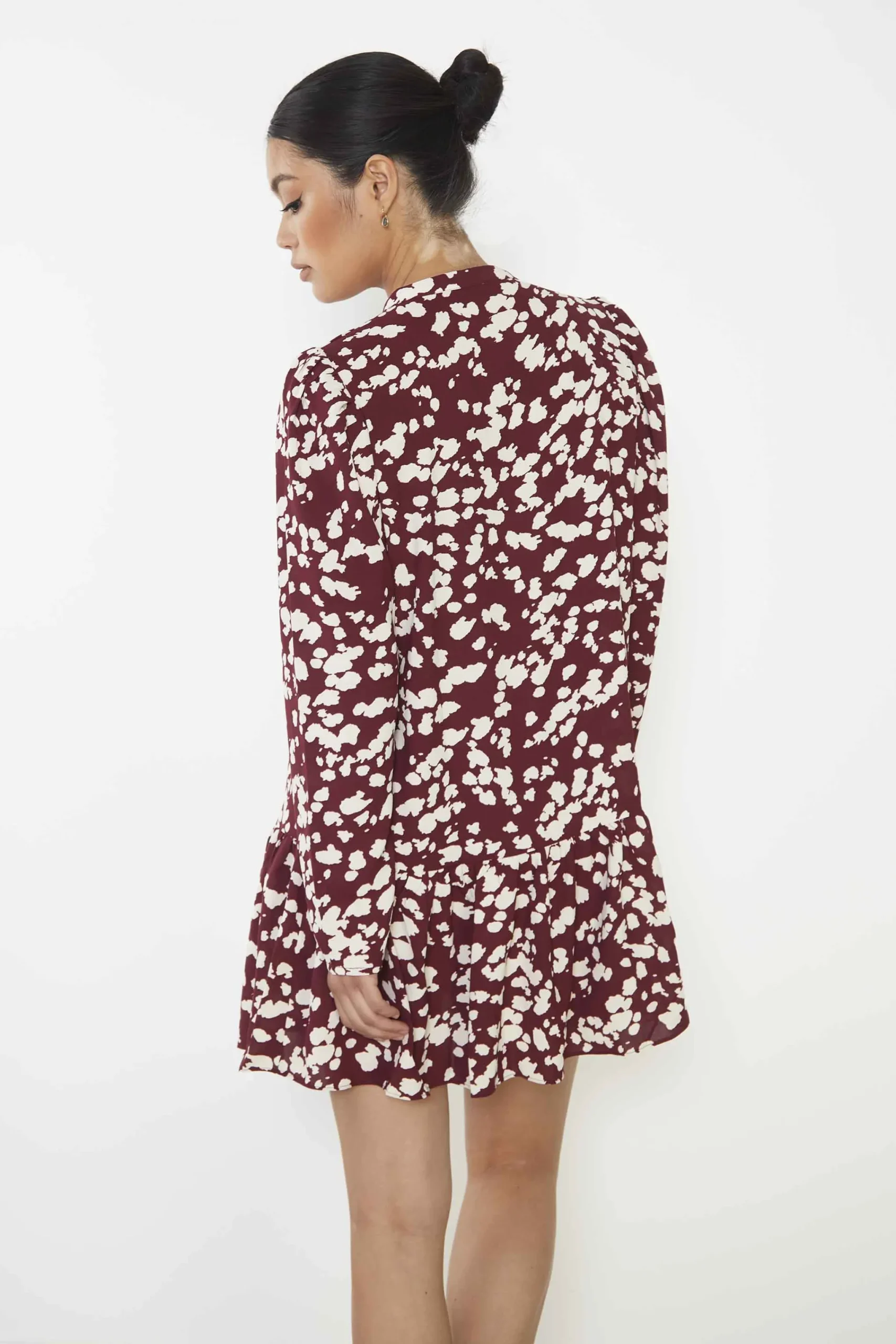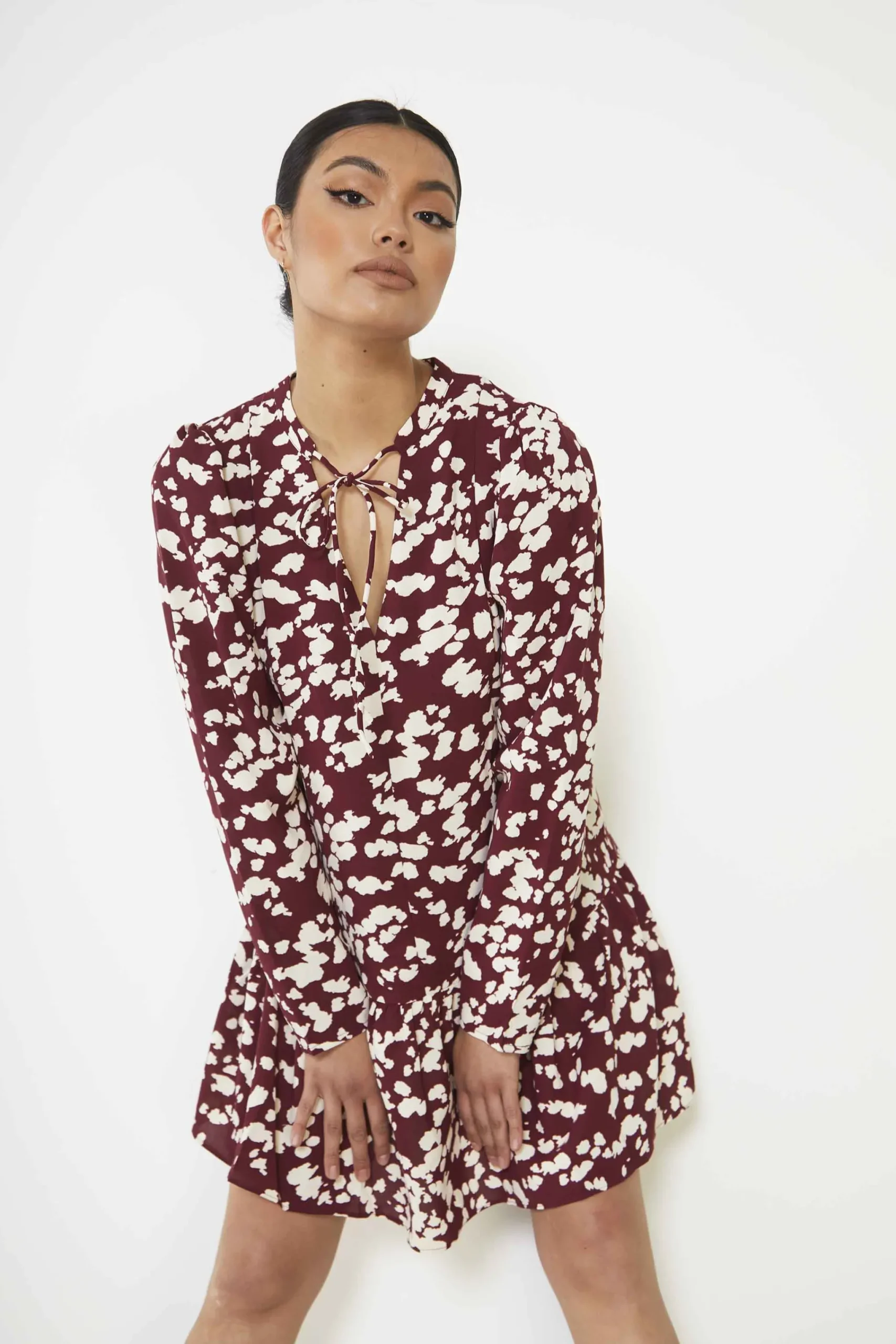 Glamorous Burgundy Cream Abstract Mini Dress with Ruffle Hem and Long Sleeves. This flattering piece is going to look great on you! Featuring long sleeves, ruffle hem and neck tie, this mini dress will be your go to for every occasion this season. Layer this piece up with tights, chunky boots and a leather jackets for a timeless autumn look!