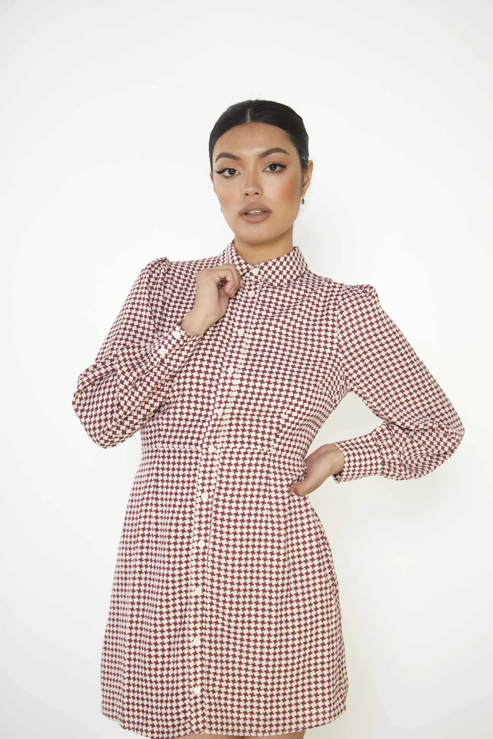 Glamorous Burgundy Geometric Check Long Sleeve Mini Shirt Dress with Peter Pan Collar. Fashion forward and feminine, this burgundy geometric print shirt dress is the perfect daytime look. Featuring a button front design, peter pan collar, and long sleeves, this mini dress is super flattering addition to your closet! Pair with sock and Mary Janes for a super on trend look!