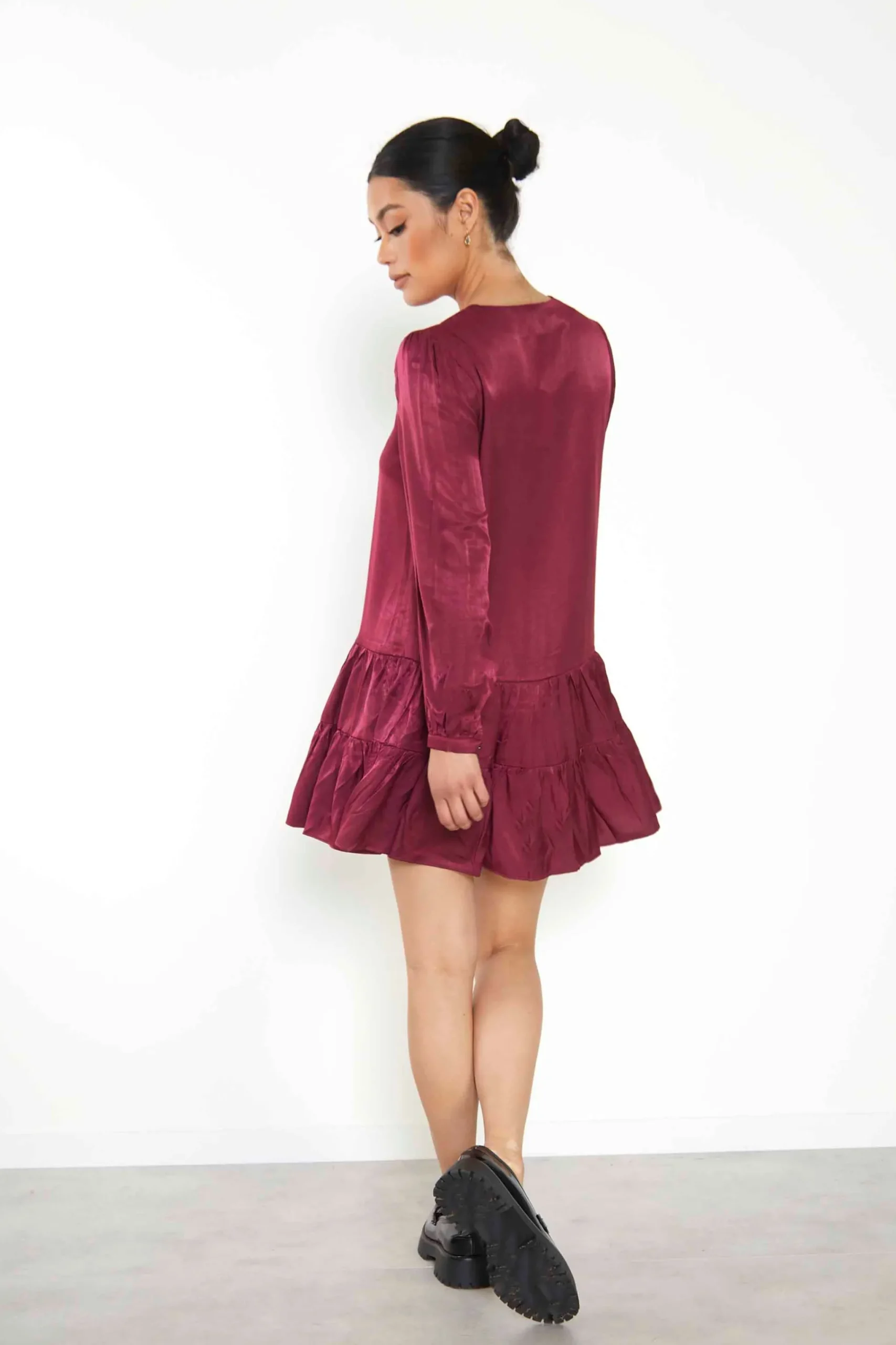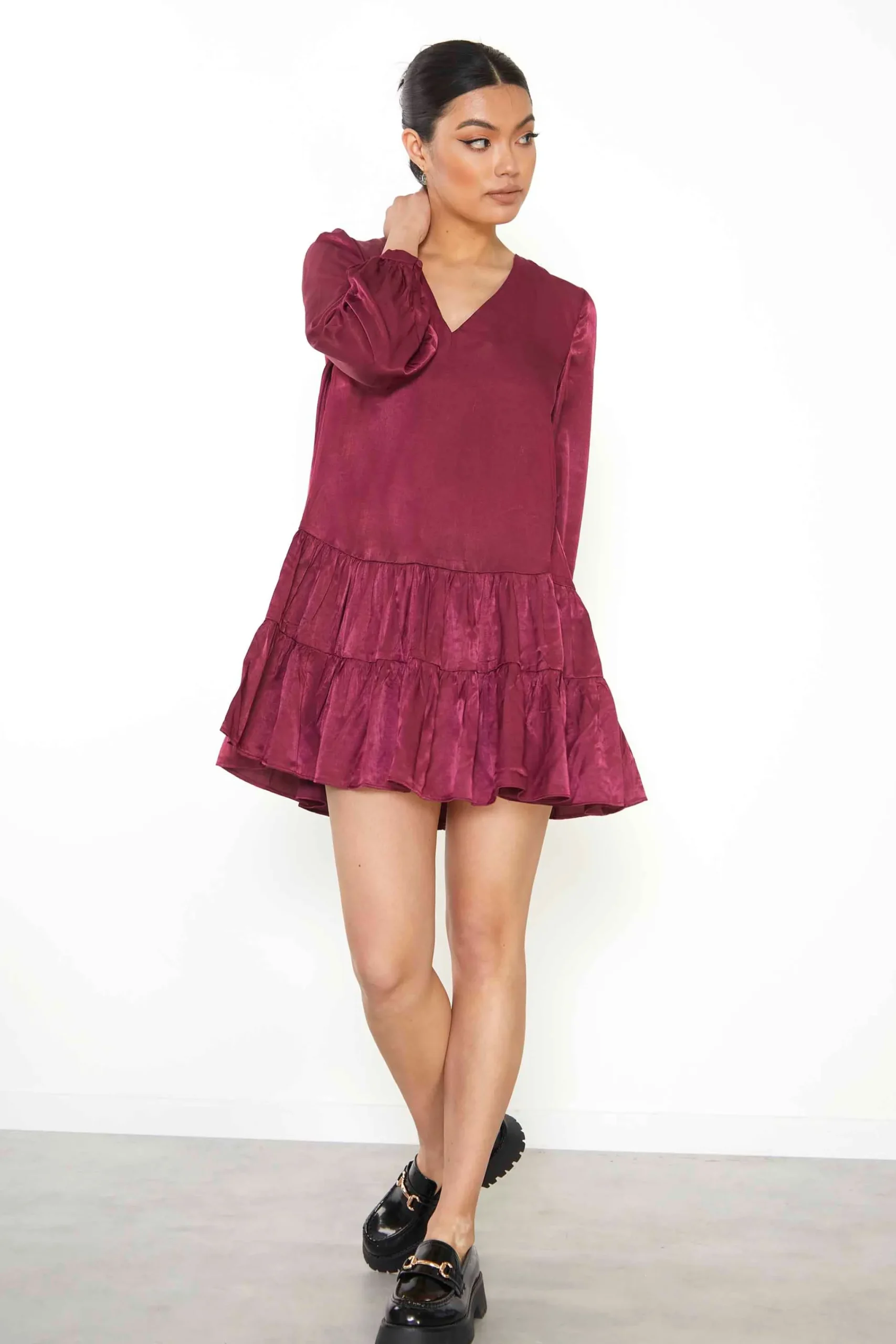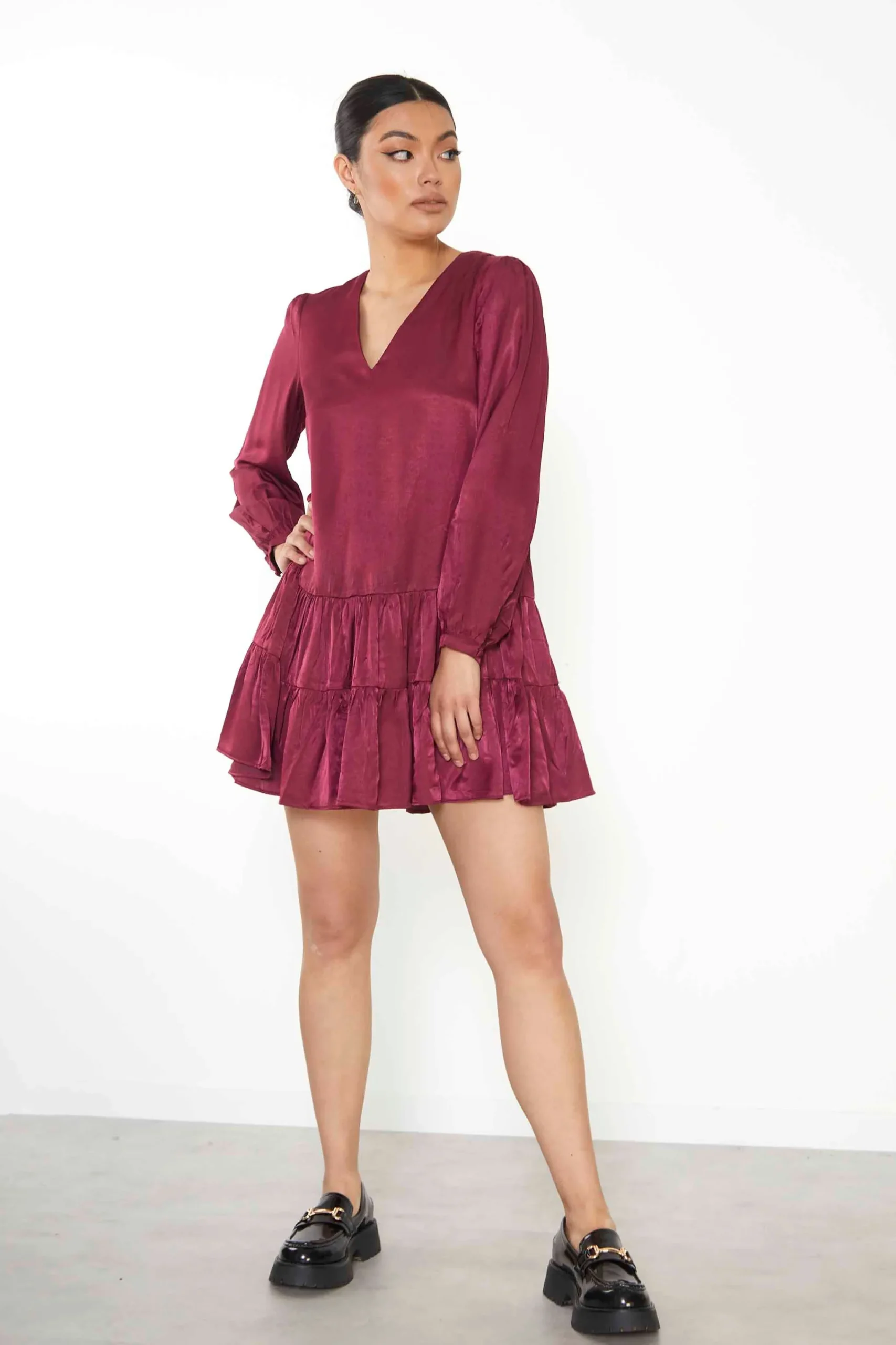 Glamorous Burgundy Shift Mini Dress. This super flattering dress features a v neck, tiered skirt detail and flattering fit. Style with boots for the daytimes and heels for the evening!