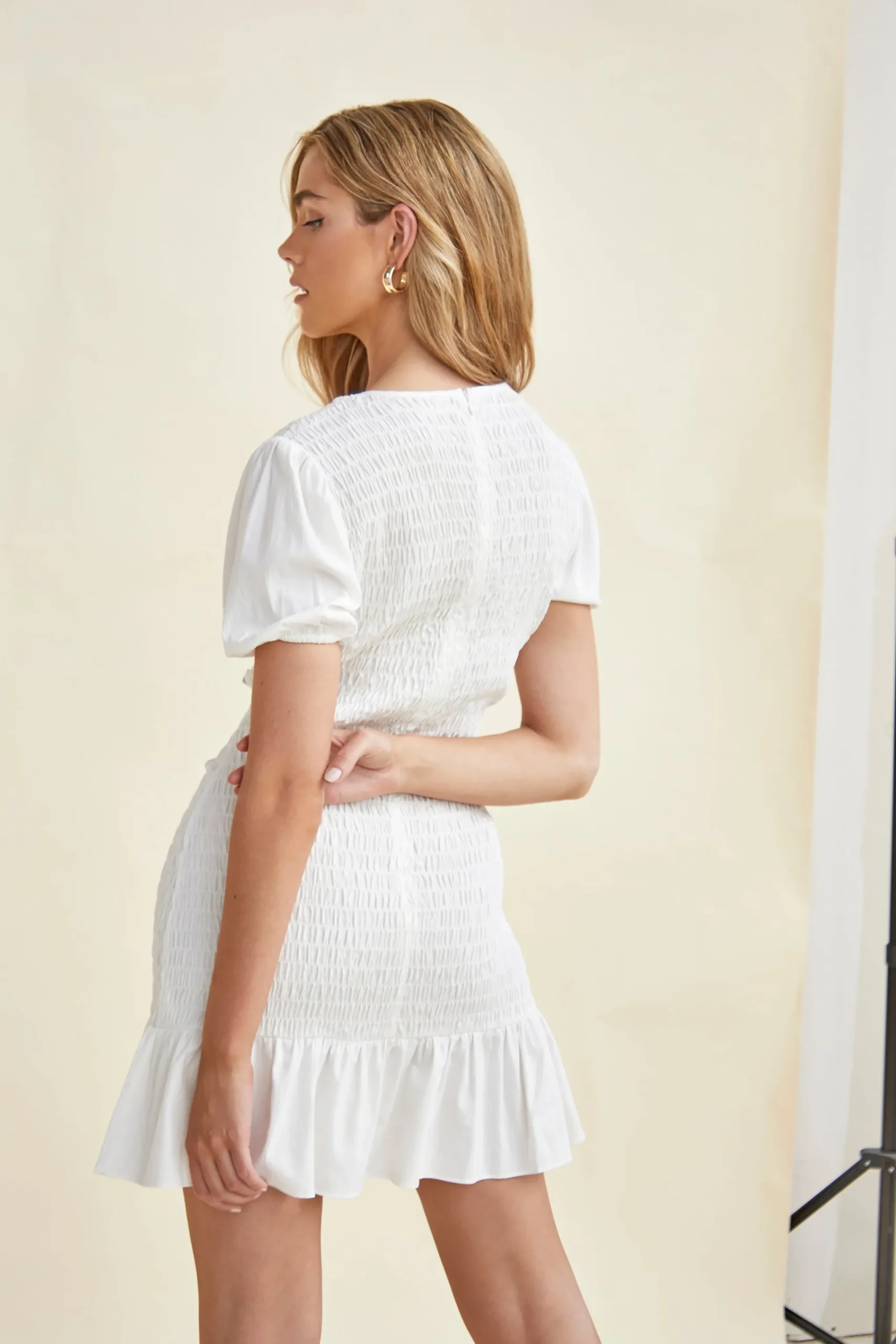Glamorous Off-White Crew Neck Smocked Mini Dress. This super flattering crew neck mini dress is a must have staple piece this season. Featuring puff sleeves, a fully smocked body and fun ruffle hem. Dress this look up with your favourite heels.