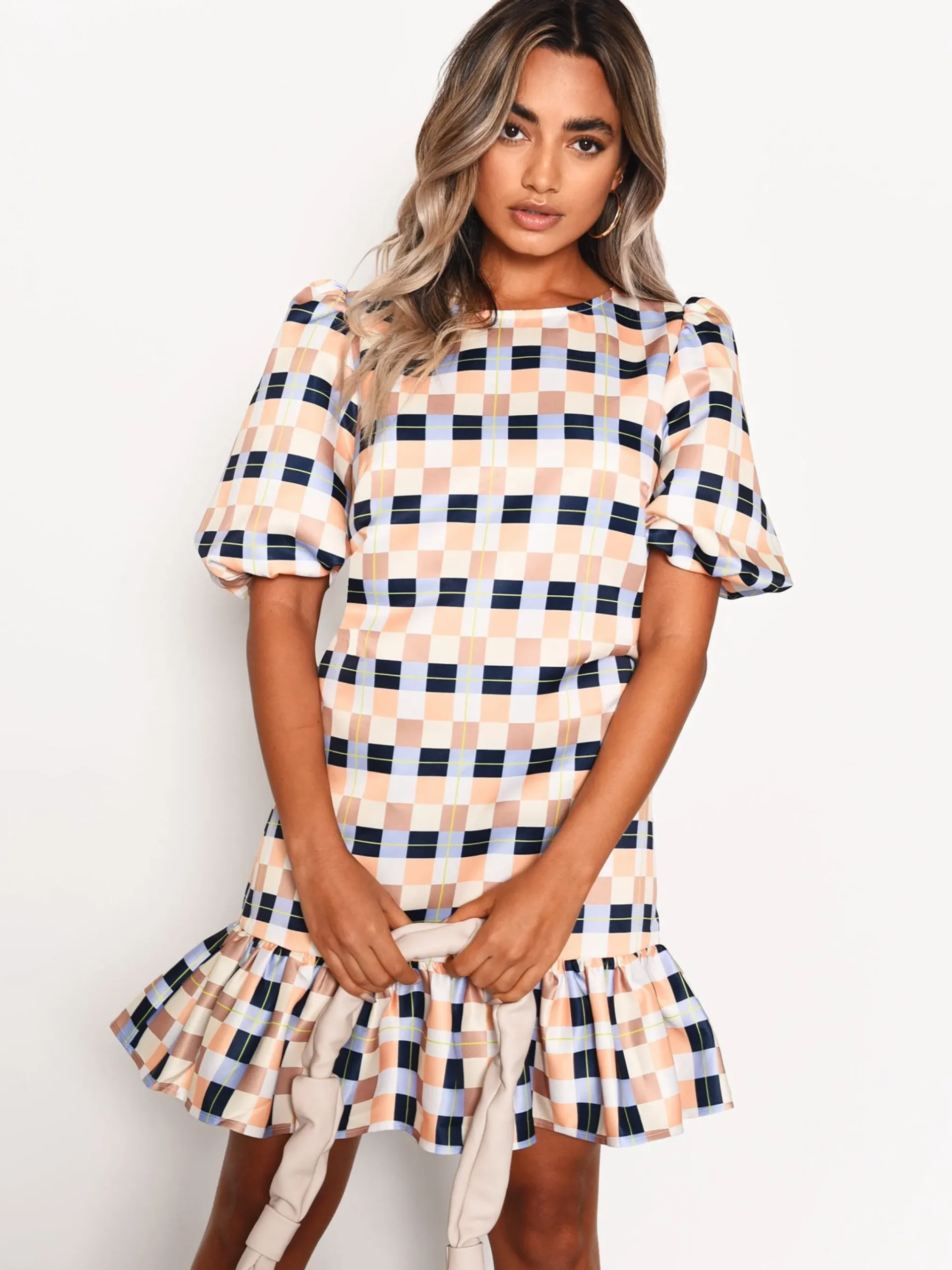 Glamorous Womens Peach Multi Check Ruffle Hem Mini Dress. Add some fashionable check print to your wardrobe with this gorgeous mini dress. Featuring stylish puff short sleeve and a frill bottom detail, this dress will be your new go-to for every occasion! Look great styled with boots for a chic day to night look.