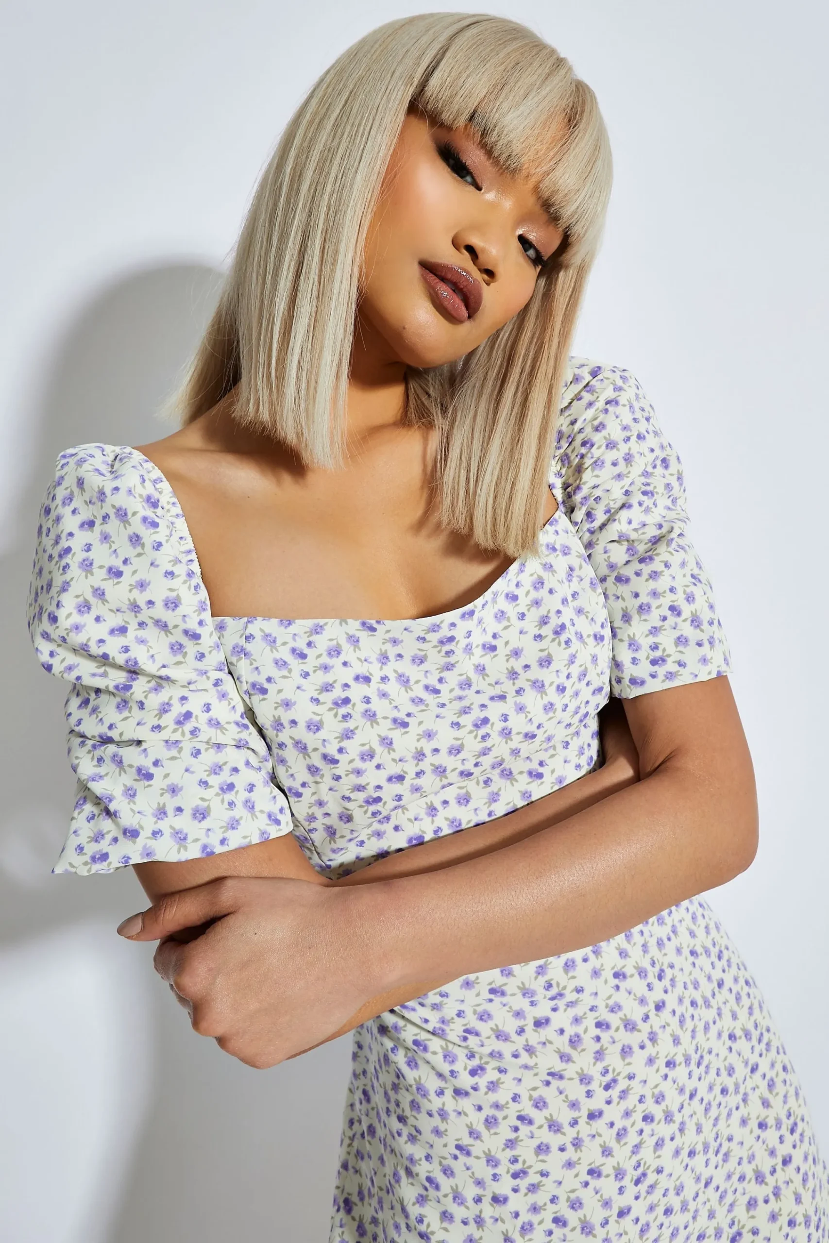 Glamorous Womens Purple Floral Ditsy Bardot Puff Shoulder Mini Dress. Opt for a floral style with this flattering shift mini dress. This super flattering dress features a flattering style and short sleeves. Style with strappy sandals for the daytimes and heels for the evening!