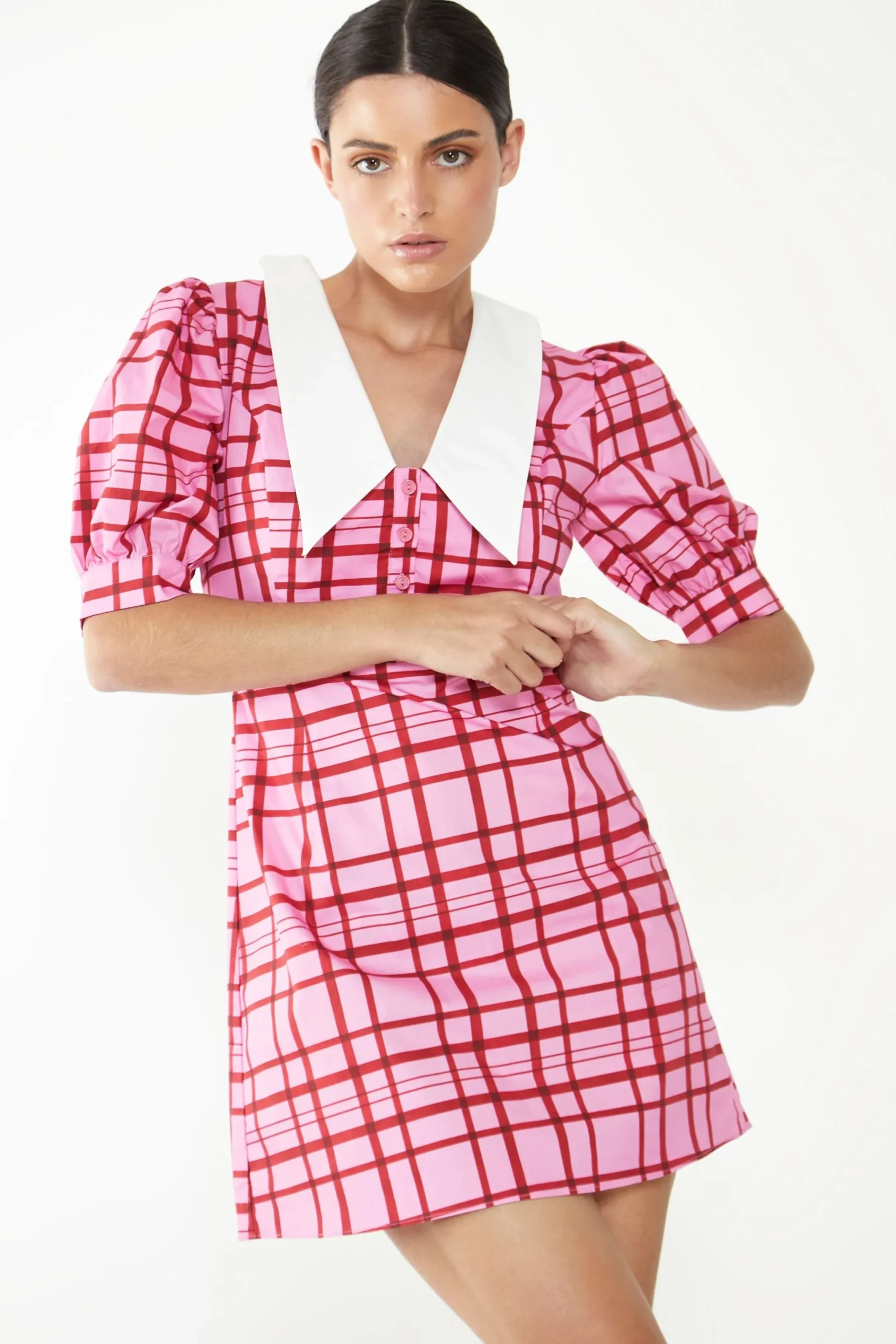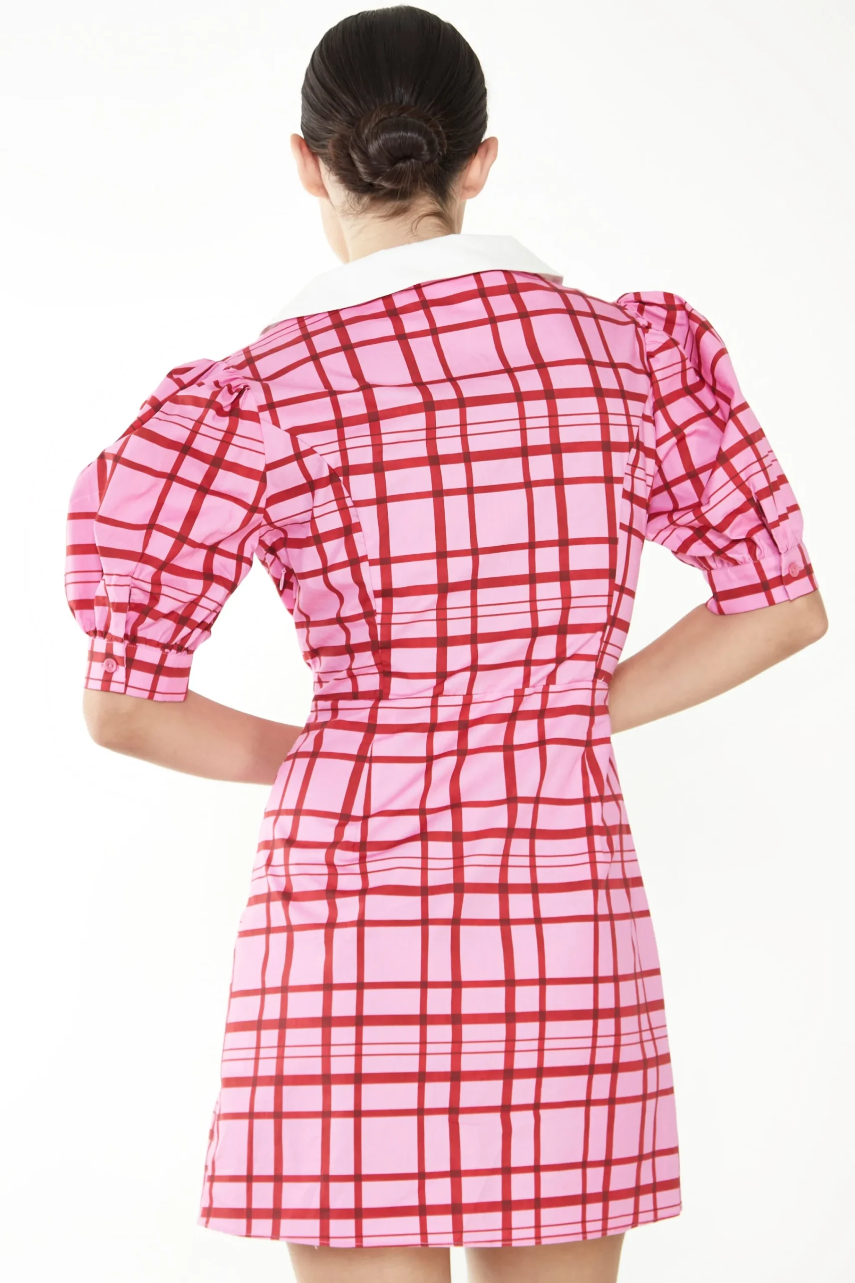 Glamorous Mini Dresses|Mini Dresses|Short Puff Sleeve Pink Red Grid Check Mini Dress with Collar –
