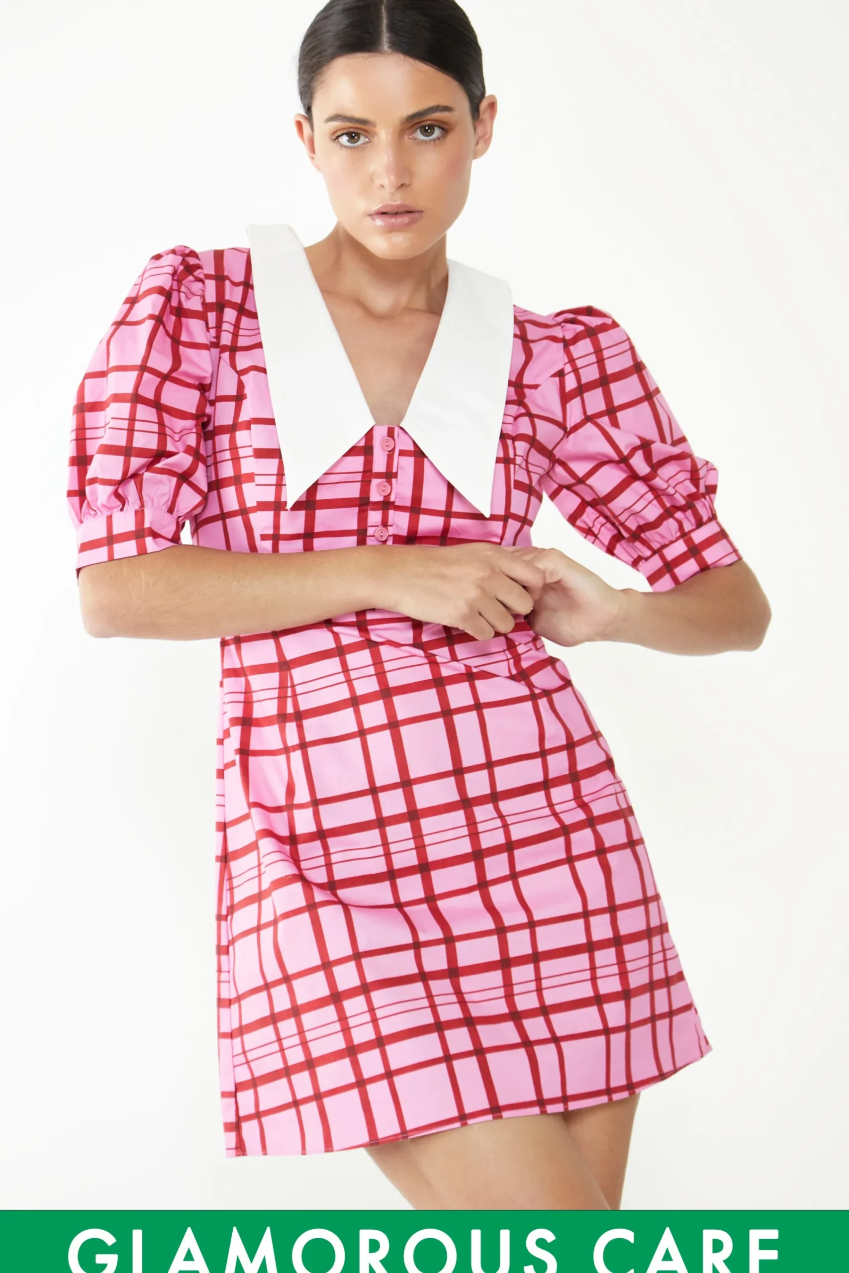 Glamorous Short Puff Sleeve Pink Red Grid Check Mini Dress with Collar Detail