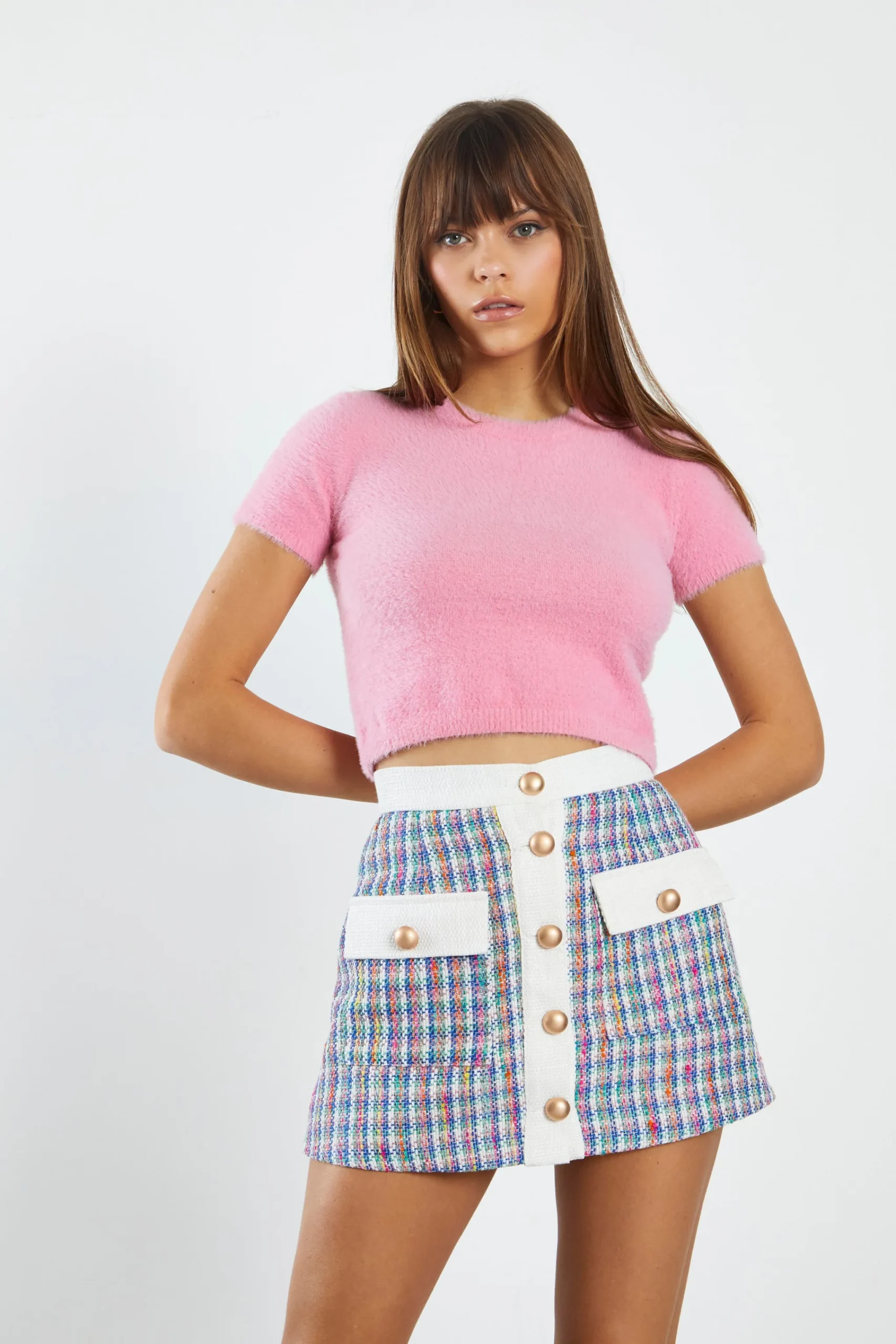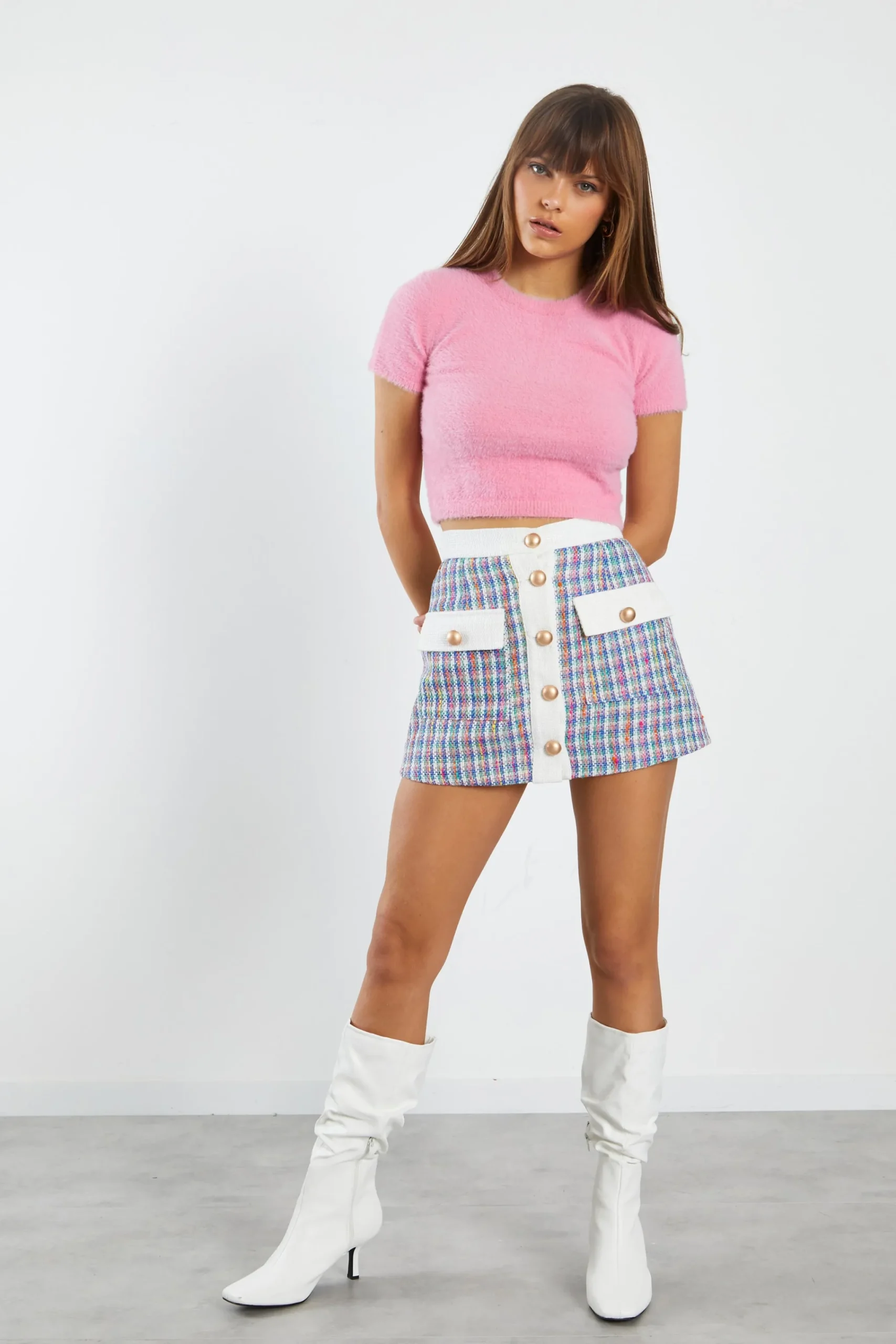 Glamorous Multi Tweed White Mini Skirt with Contrast Pockets & Waistband. This classic tweed mini skirt is destined for your wardrobe this season. With a high waisted fit, contrasting pockets and waistband detailing and gold buttons, you wont regret adding this piece to your wardrobe. Pair with a cute jumper, chunky boots and a shoulder bag for the ultimate fashion forward sustainable look.