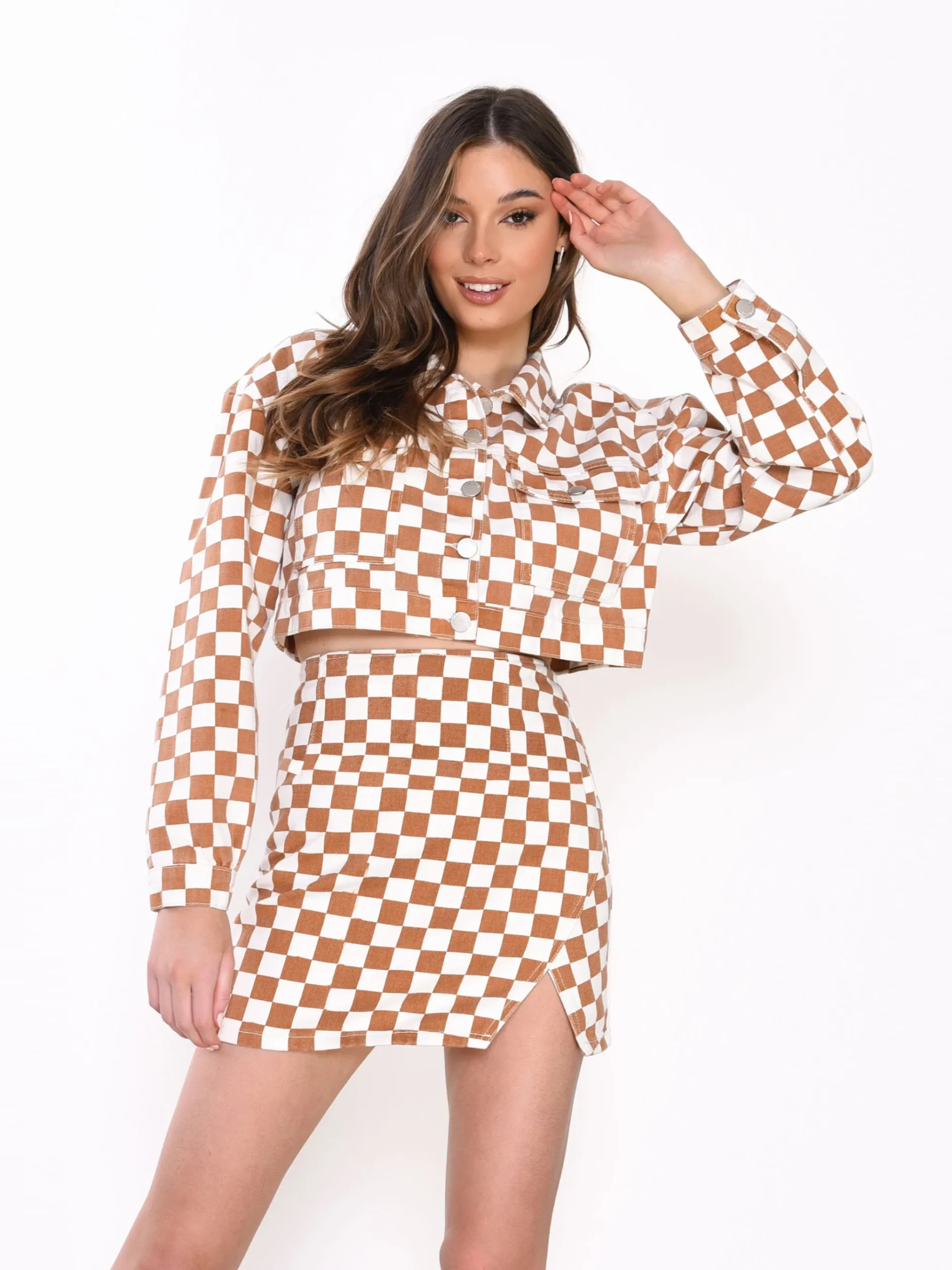 Glamorous Womens Tan Checkerboard Side Split Mini Skirt. This on trend skirt will look amazing on you! We love this skirt here at Glamorous, featuring a checkerboard pattern finish and flattering style, this skirt will stand out from the crowd. Style with matching co-ord top and some high knee boots for the ultimate look.