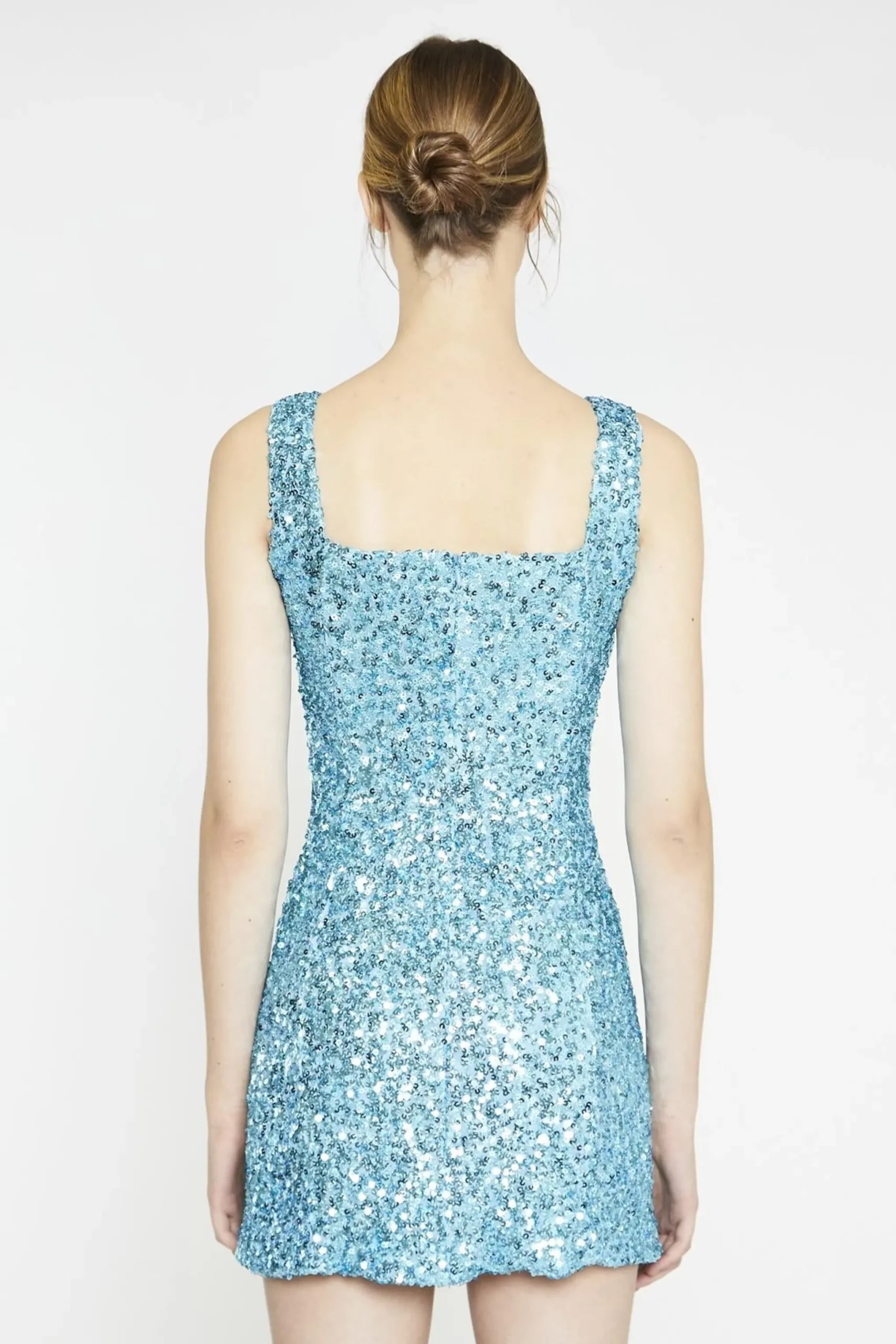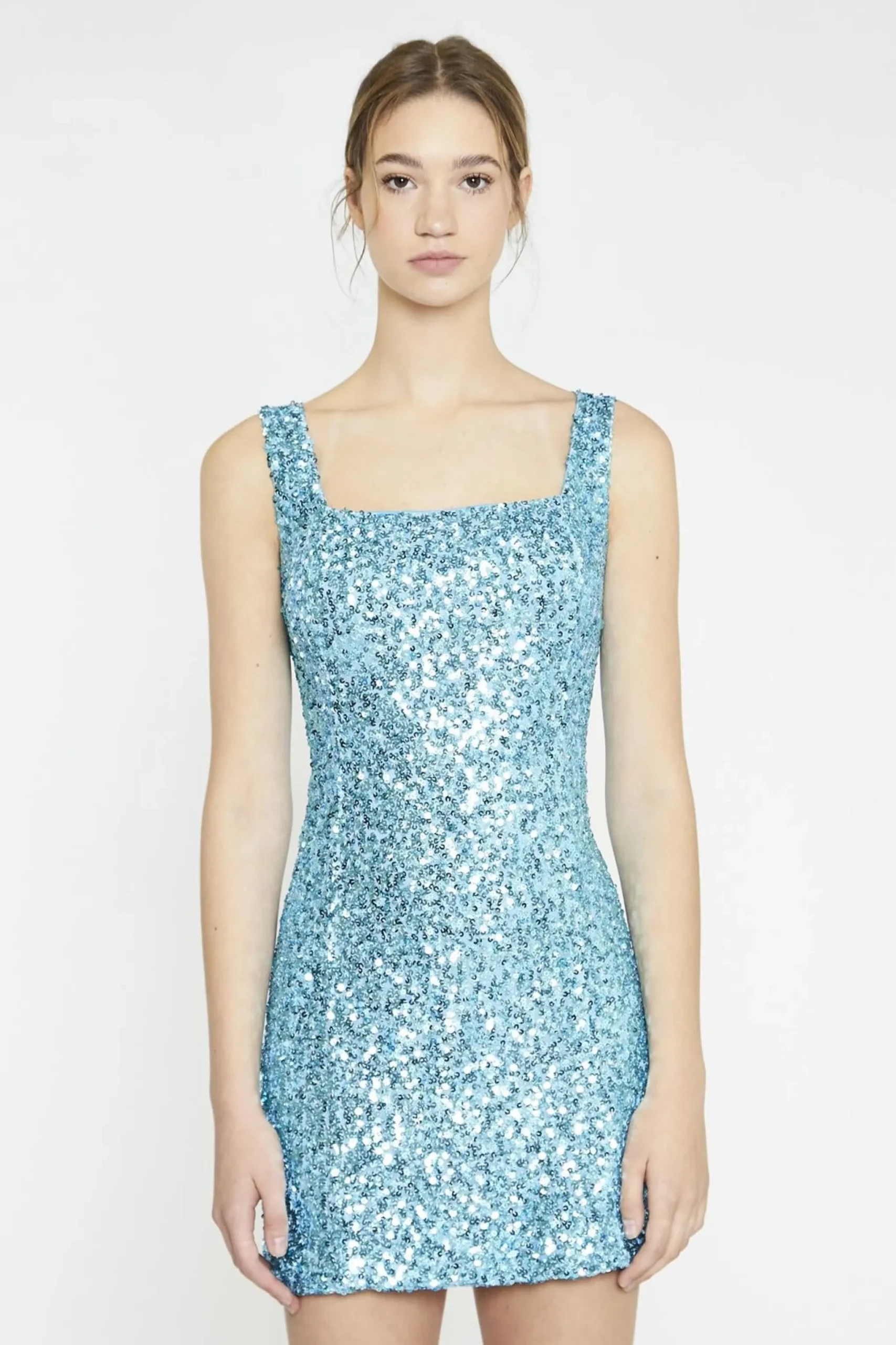 Glamorous Aquamarine-Sequin Square-Neck Mini-Dress. Shine bright in our Aquamarine-Sequin Square-Neck Mini-Dress, a show-stopping piece that’s perfect for your next night out. This dazzling dress features an all-over sequin fabric that catches the light with every move, creating a mesmerizing effect that’s sure to turn heads. The square neckline adds a modern touch, framing your face beautifully and offering a unique twist on the classic party dress. The mini length shows off your legs, making it ideal for dancing the night away. Don’t worry about comfort – this dress is fully lined, ensuring a smooth feel against your skin despite the sparkly exterior. The aquamarine colour is reminiscent of tropical waters, bringing a fresh and vibrant energy to your look. Pair it with strappy heels and minimal jewellery to let the dress take center stage, or add a faux fur jacket for a touch of glamour on cooler evenings. Easy to style and impossible to ignore, this Aquamarine-Sequin Square-Neck Mini-Dress is your ticket to becoming the life of the party.