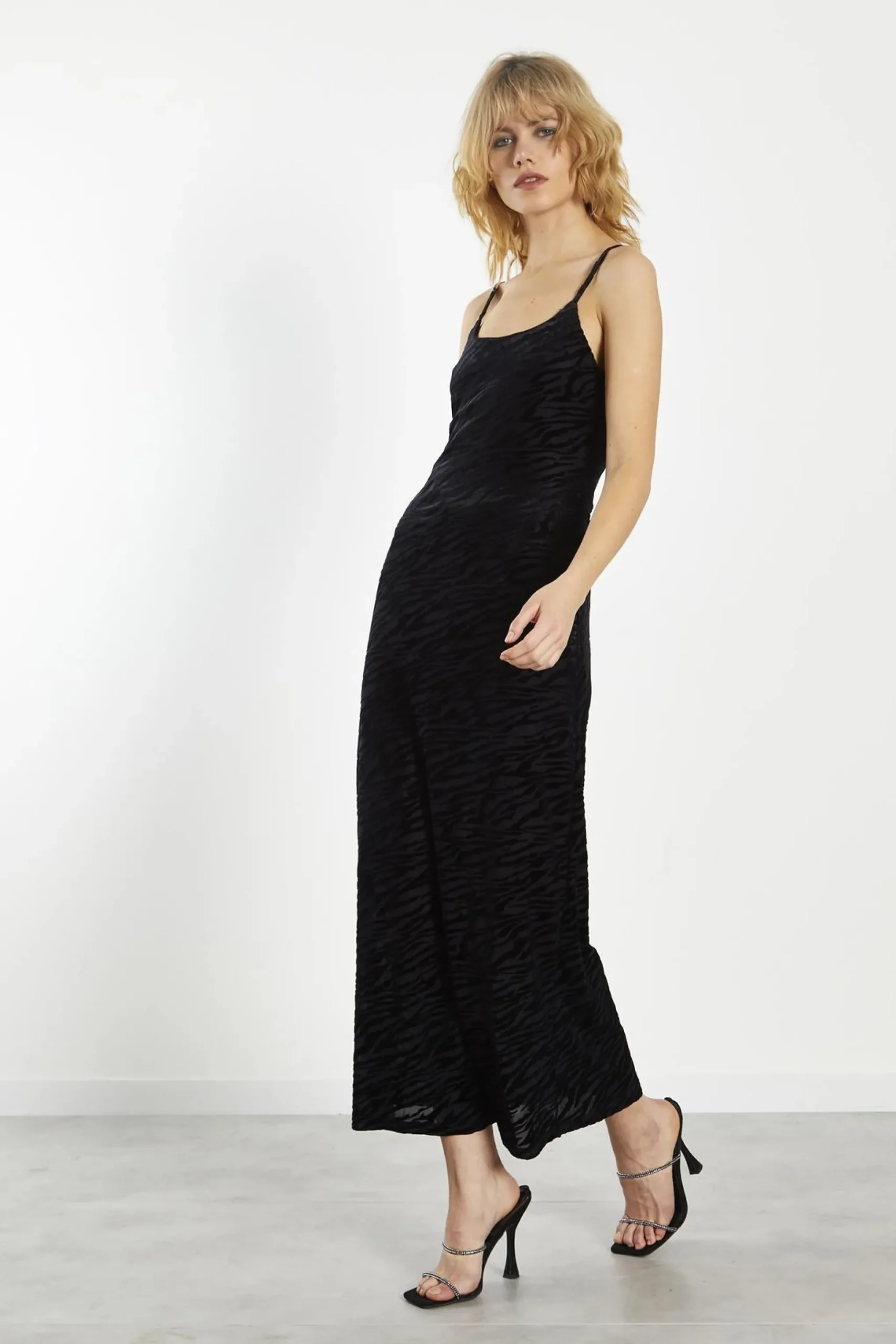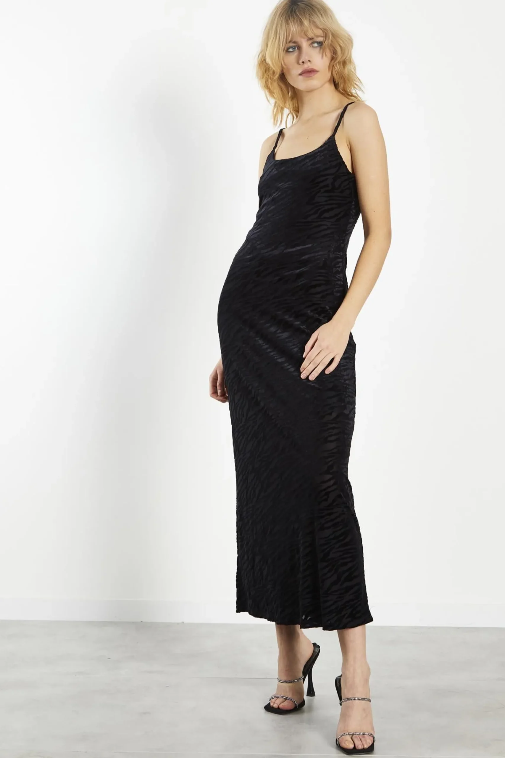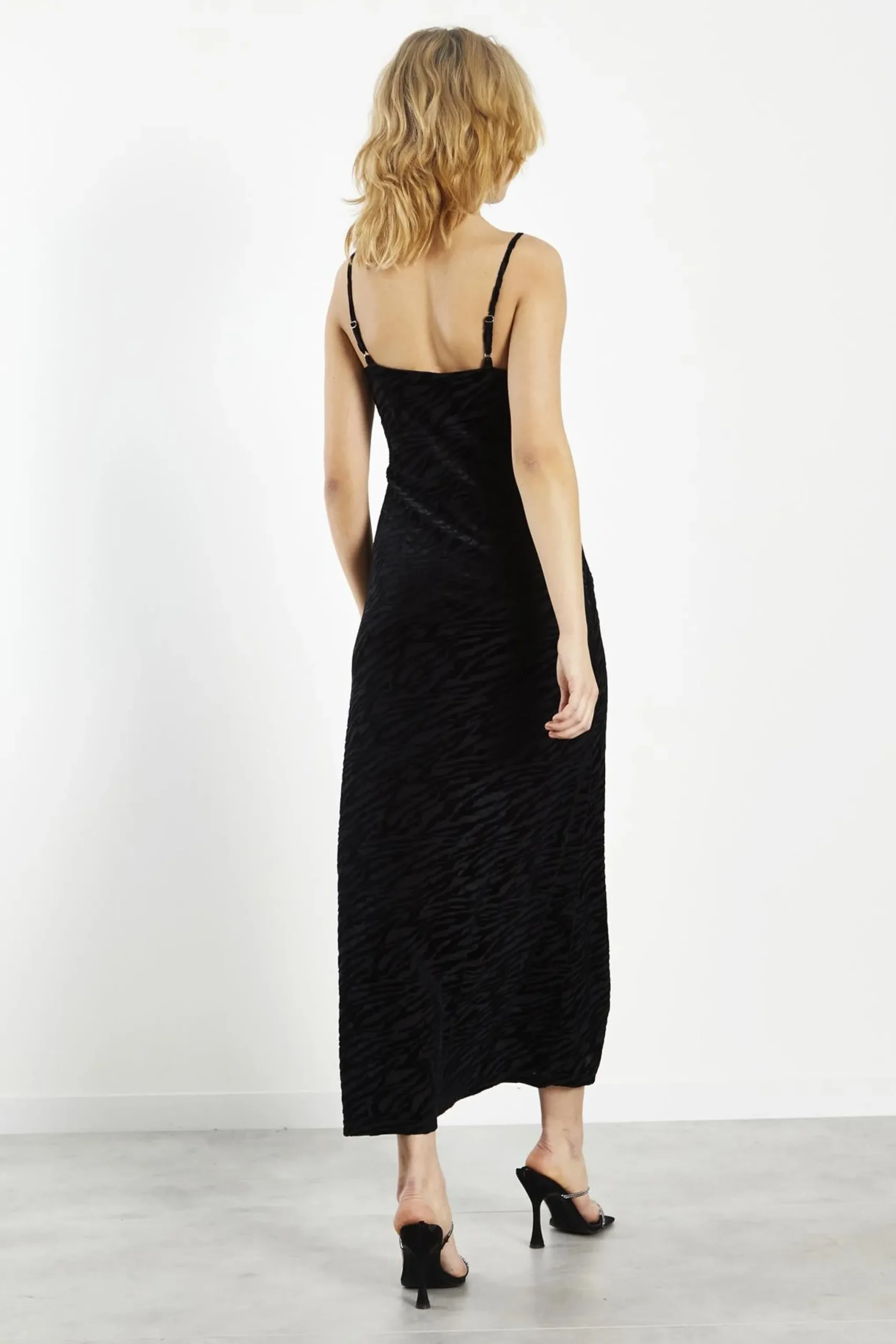 Glamorous Women’s Black Velvet Devore Bodycon Maxi-Dress . This black velvet devore bodycon maxi dress is a stunning choice for those special occasions when you want to make a statement. The luxurious velvet fabric feels soft against your skin and adds a touch of glamour to your look. With its sleeveless design, this dress is perfect for showing off your shoulders and arms, while the adjustable spaghetti straps allow you to customize the fit to your liking. The bodycon silhouette hugs your curves beautifully, creating a flattering shape that enhances your confidence. Ideal for evening events or upscale gatherings, this maxi dress pairs wonderfully with strappy heels and statement jewellery for a complete look. You can also layer it with a chic jacket or shawl for added warmth without sacrificing style. The rich texture and timeless black colour make this dress a versatile piece that you’ll reach for again and again, ensuring you feel fabulous every time you wear it.