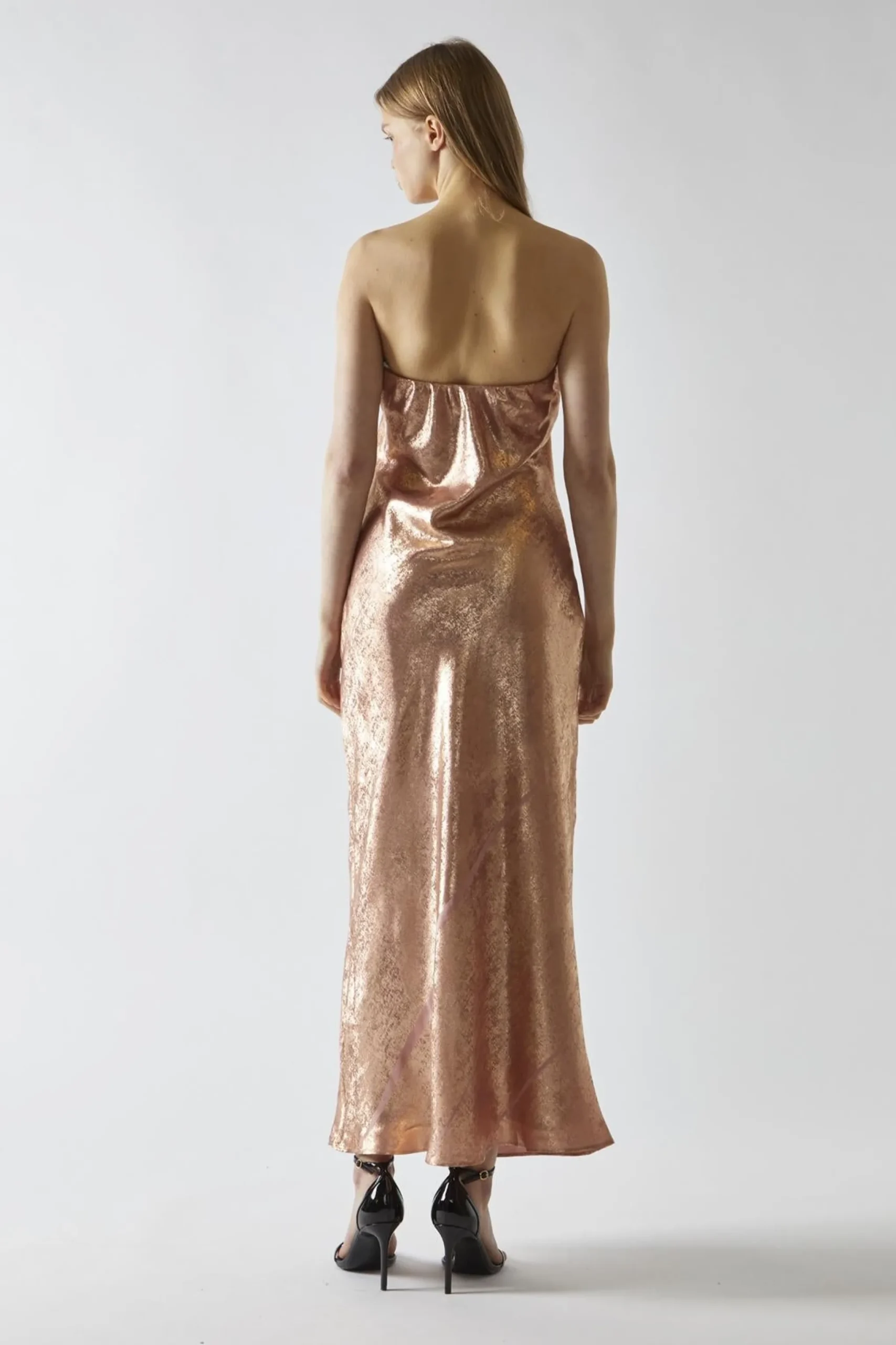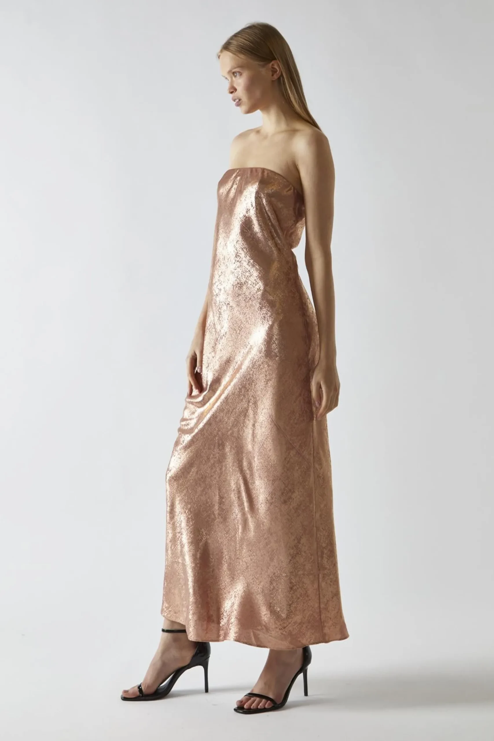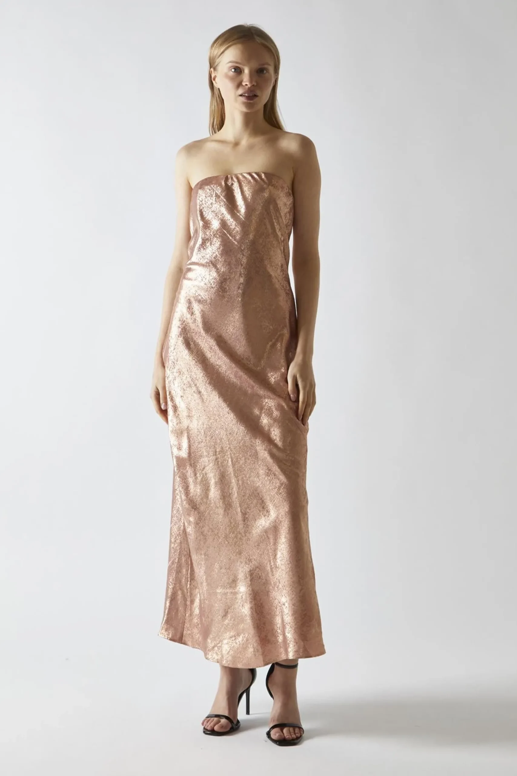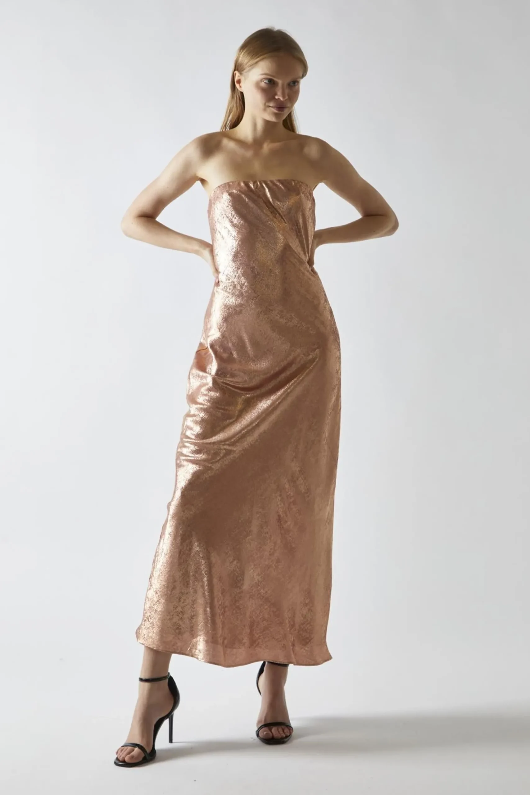 Glamorous Copper-Metallic Strapless Midi Dress. Shimmer your way through any event in this stunning copper metallic midi dress. The luxurious satin fabric feels like liquid gold against your skin, catching the light with every move you make. Its strapless design shows off your shoulders and collarbone, creating an elegant and alluring silhouette. The midi length offers a perfect balance of sophistication and style, making it suitable for a variety of occasions. This dress is a true showstopper that can take you from cocktail parties to wedding receptions with ease. Pair it with strappy heels and minimalist jewellery to let the dress do the talking, or add a bold clutch for an extra pop of personality. It’s comfortable enough to dance the night away but glamorous enough to make you feel like you’re walking the red carpet. This midi dress isn’t just an outfit – it’s a confidence booster that’ll have you feeling like a million bucks from the moment you slip it on.