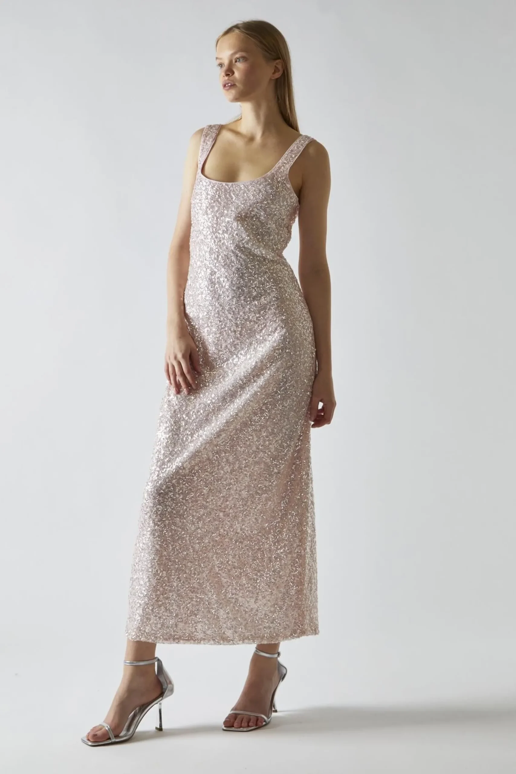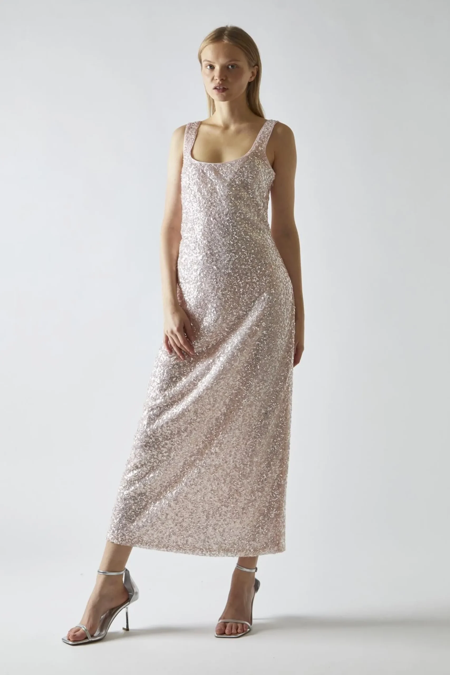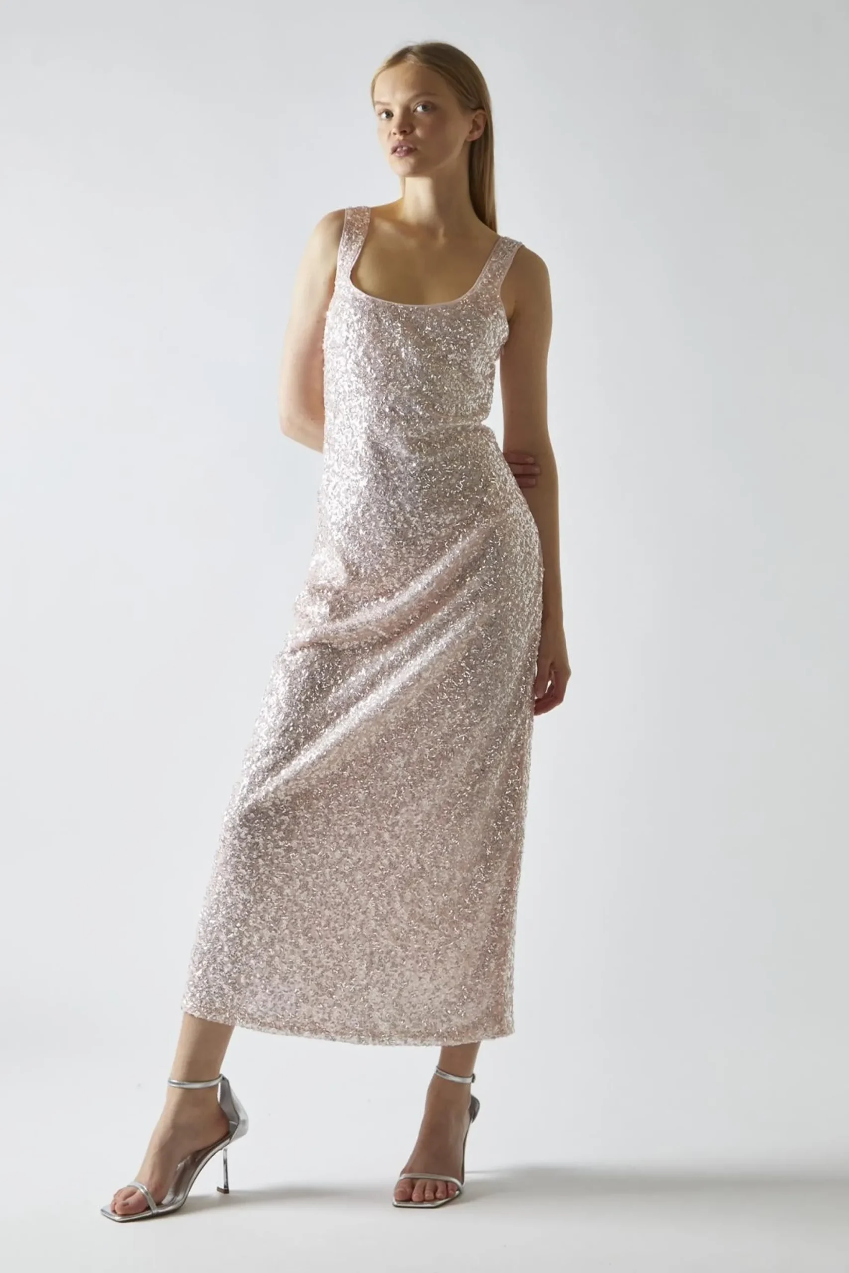 Glamorous Women’s Pink-Silver Sequin Square-Neck Bias-Cut Midaxi-Dress. Shine bright in this Pink-Silver Sequin Square-Neck Bias-Cut Midaxi-Dress. It’s the perfect blend of glamour and comfort, designed to make you feel like a star. The shimmering pink and silver sequins catch the light with every move, creating a dazzling effect that’s sure to turn heads. The bias cut drapes beautifully over your curves, while the rounded square neckline adds a touch of elegance. The sleeveless design keeps you cool on the dance floor, and the midaxi length strikes the perfect balance between flirty and sophisticated. Don’t worry about any scratchy sequins – this dress is fully lined for your comfort. It’s a versatile piece that works for everything from holiday parties to wedding receptions. Pair it with strappy heels and minimal jewellery to let the dress take center stage. With this stunner in your closet, you’ll always have something fabulous to wear for those special nights out.