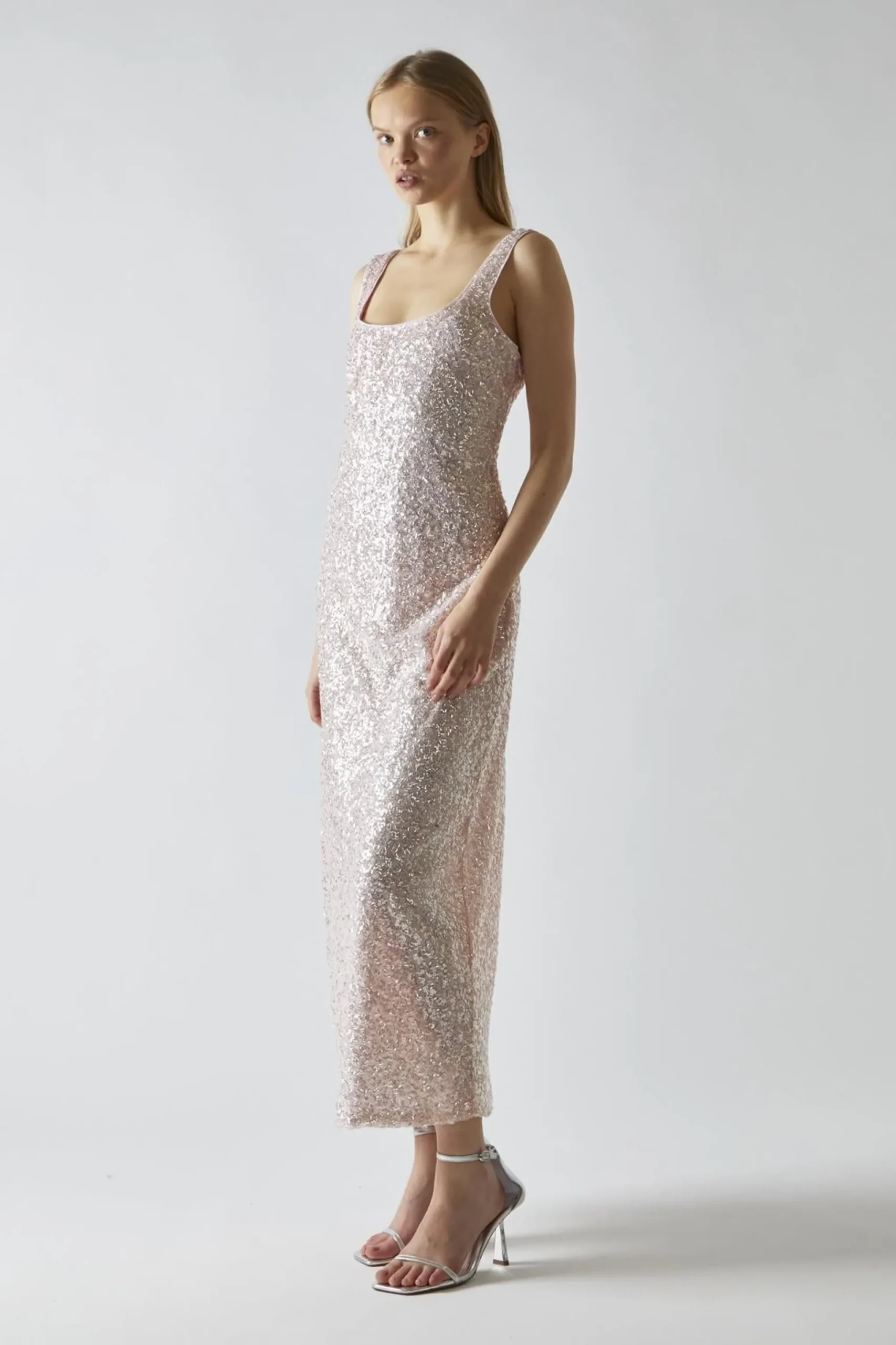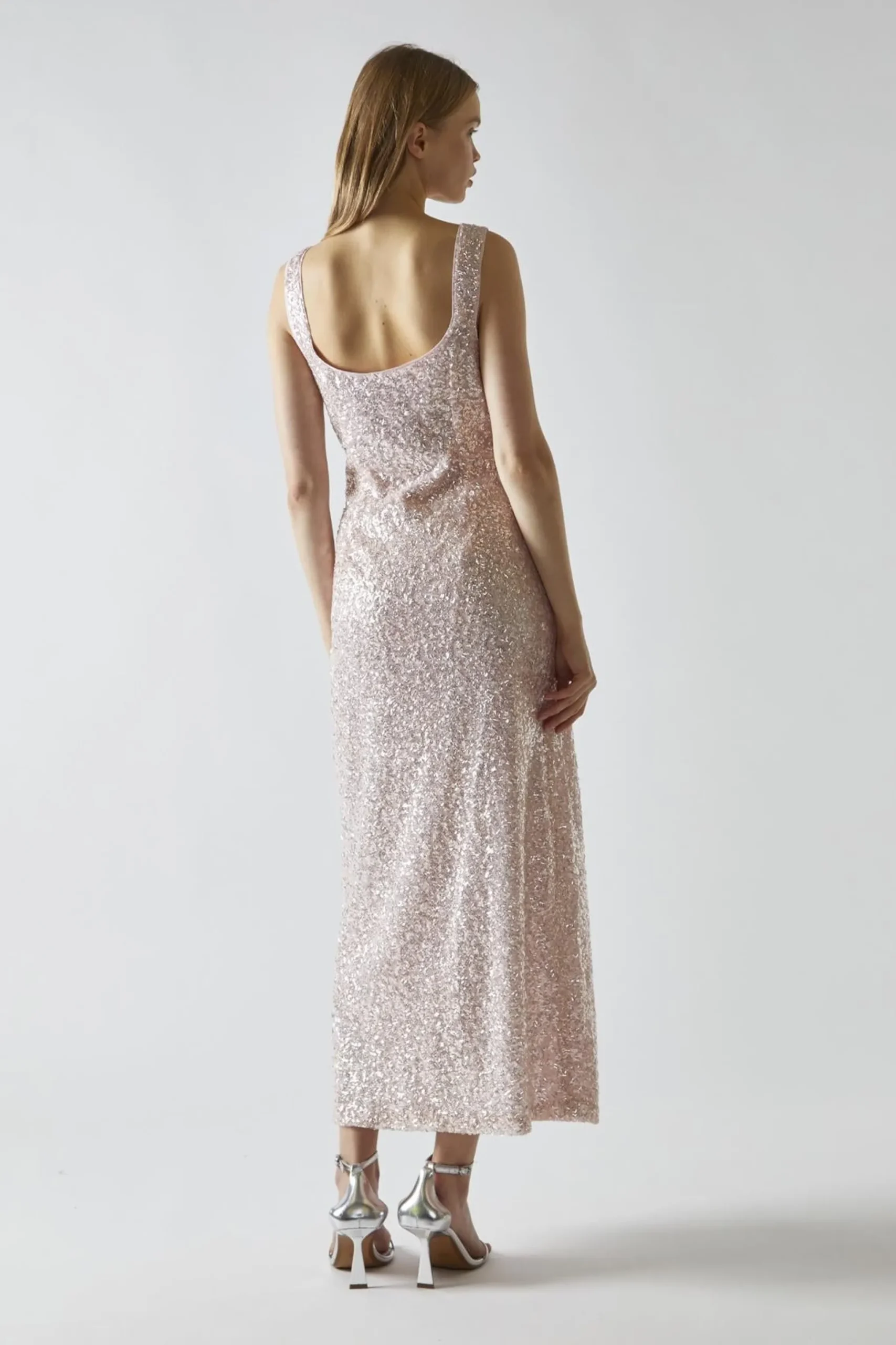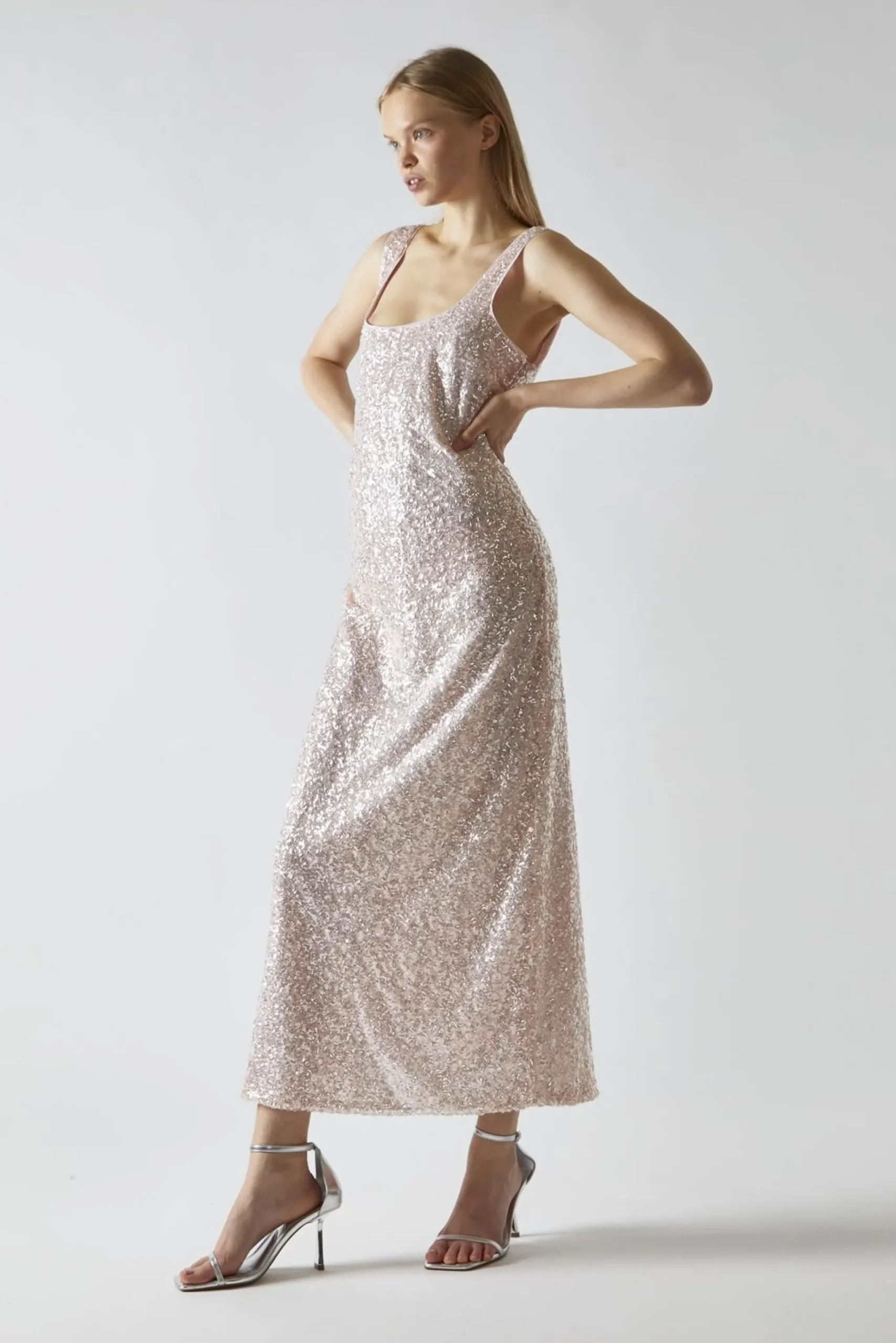 Glamorous Women’s Pink-Silver Sequin Square-Neck Bias-Cut Midaxi-Dress. Shine bright in this Pink-Silver Sequin Square-Neck Bias-Cut Midaxi-Dress. It’s the perfect blend of glamour and comfort, designed to make you feel like a star. The shimmering pink and silver sequins catch the light with every move, creating a dazzling effect that’s sure to turn heads. The bias cut drapes beautifully over your curves, while the rounded square neckline adds a touch of elegance. The sleeveless design keeps you cool on the dance floor, and the midaxi length strikes the perfect balance between flirty and sophisticated. Don’t worry about any scratchy sequins – this dress is fully lined for your comfort. It’s a versatile piece that works for everything from holiday parties to wedding receptions. Pair it with strappy heels and minimal jewellery to let the dress take center stage. With this stunner in your closet, you’ll always have something fabulous to wear for those special nights out.