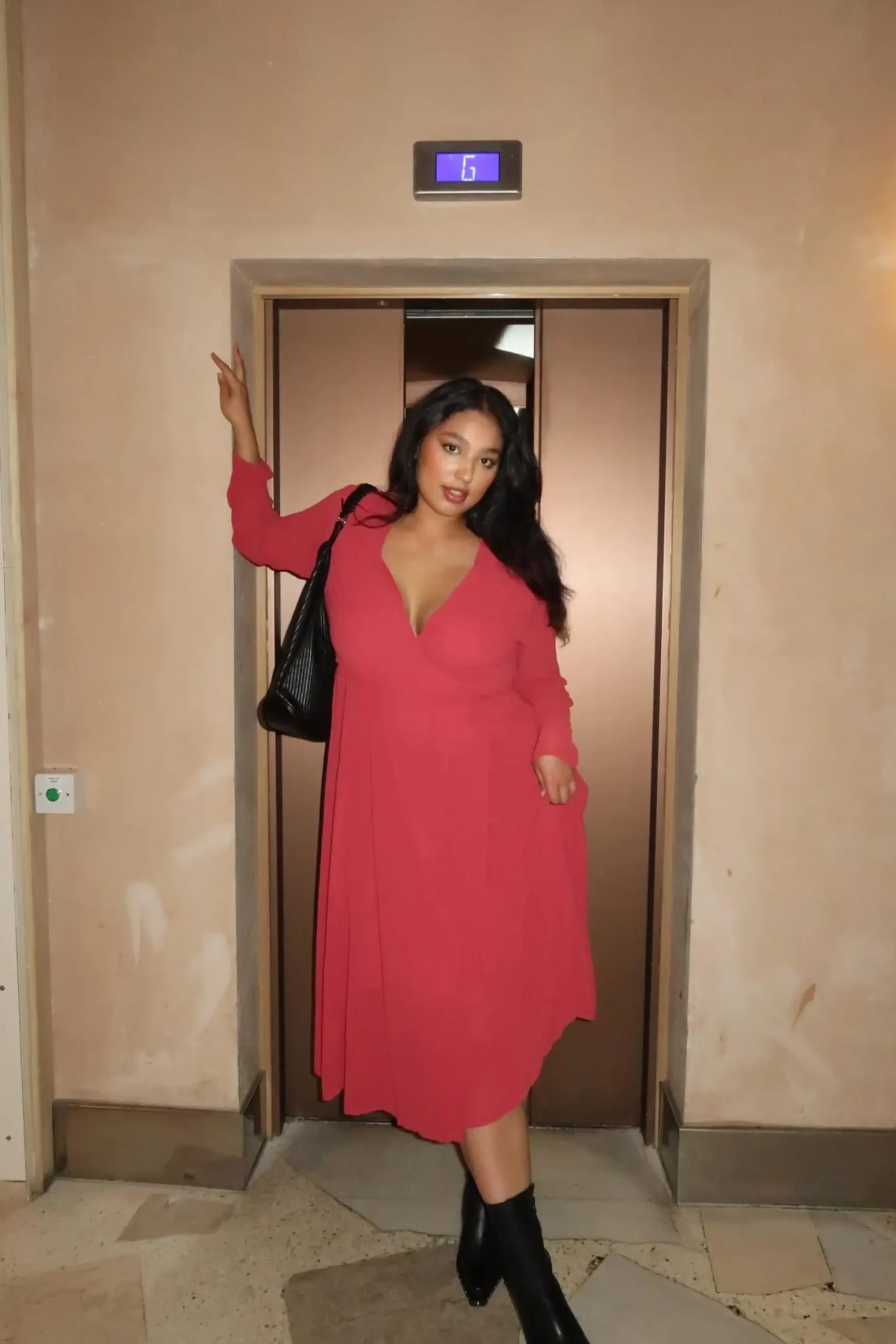 Glamorous Women’s Red Party Maxi-Night dress. The Red Party Maxi-Night Dress is designed to make a statement with its bold colour and elegant details. Featuring long sleeves for a touch of modesty and a daring plunge front for a hint of drama, this dress strikes the perfect balance between classy and playful. The flowing maxi length adds a graceful touch, making it ideal for evening parties or special occasions. Pair it with simple jewellery and your favourite heels to let the striking red colour shine on its own. This dress offers a standout look without being too fussy, perfect for those moments when you want to feel confident and stylish.