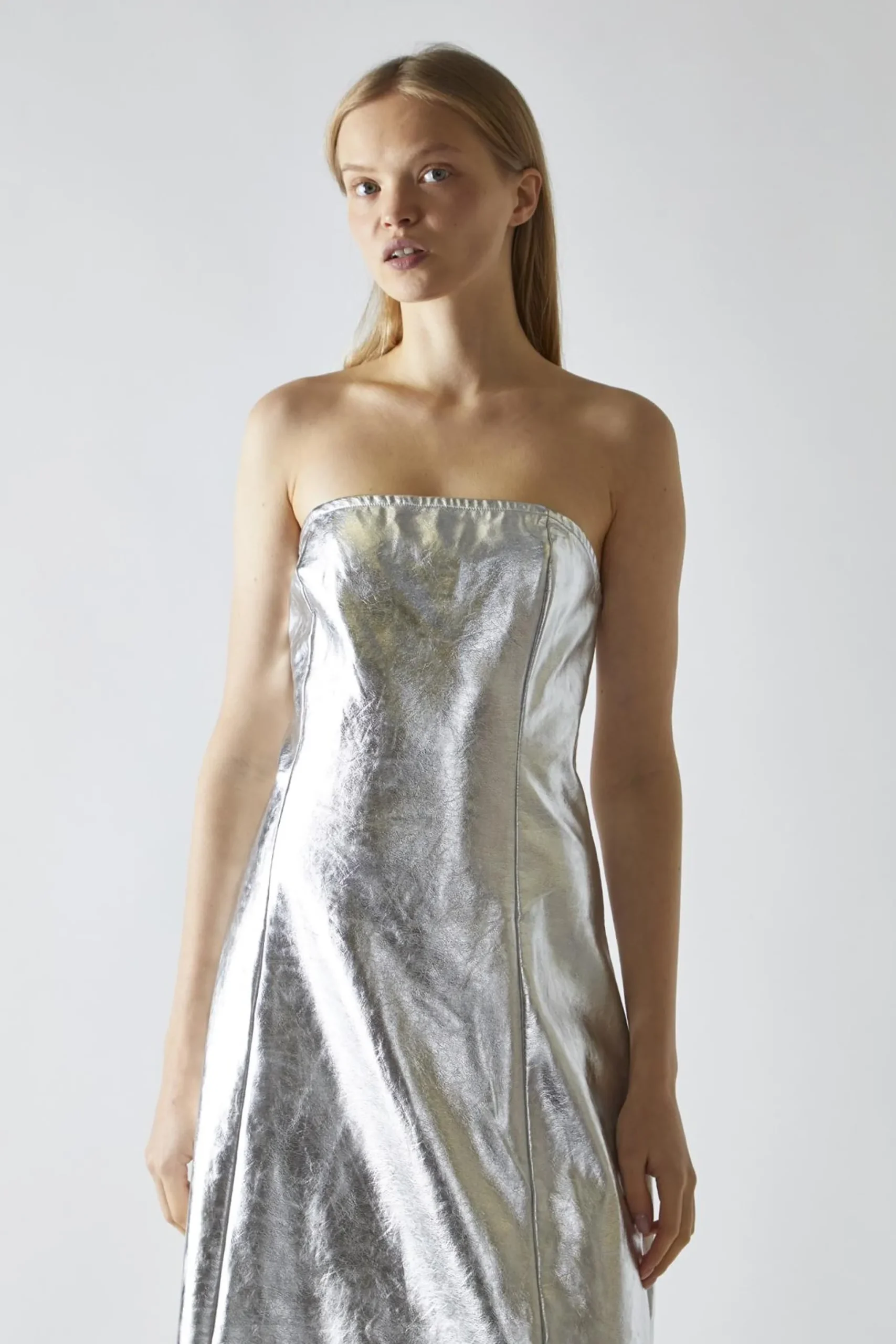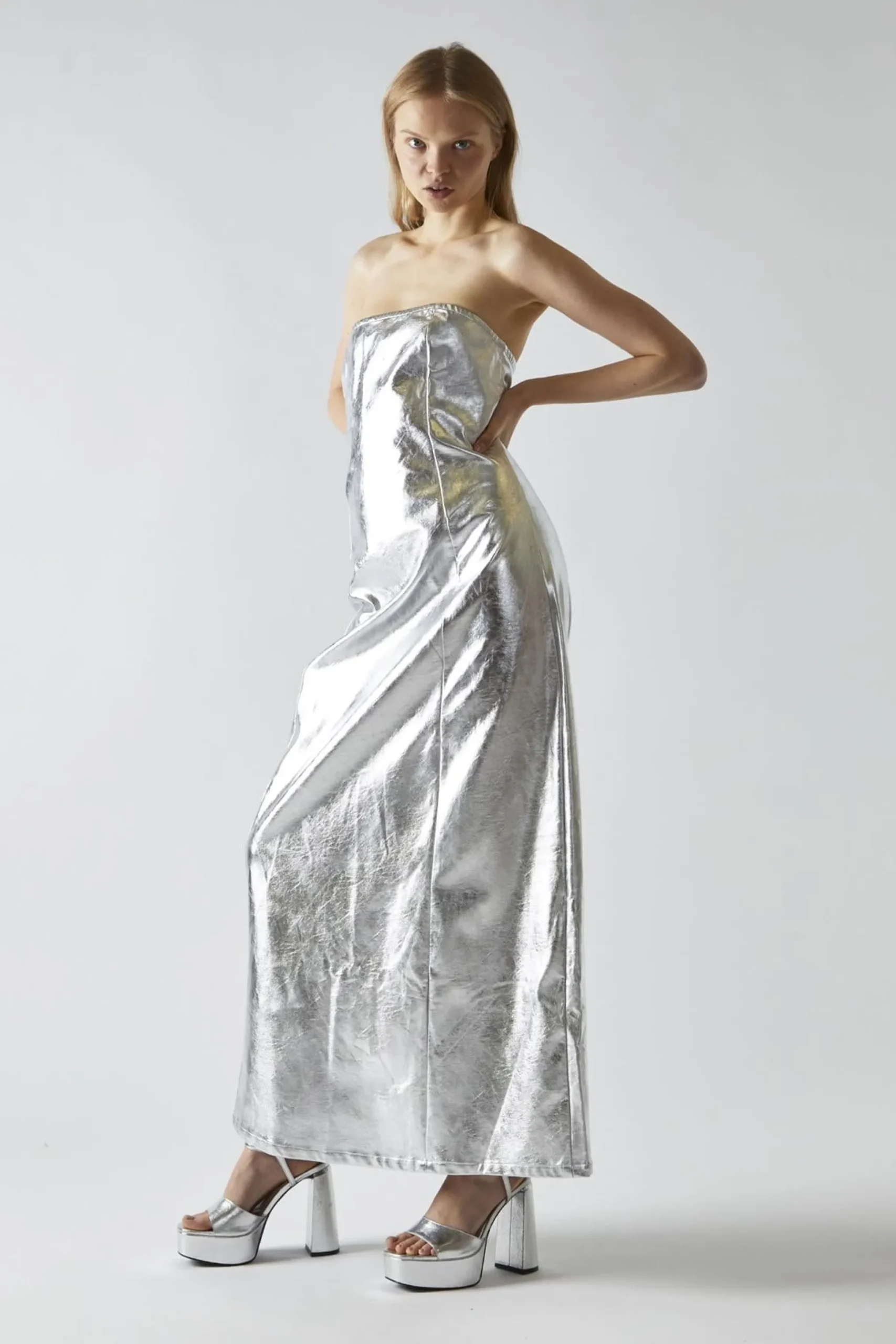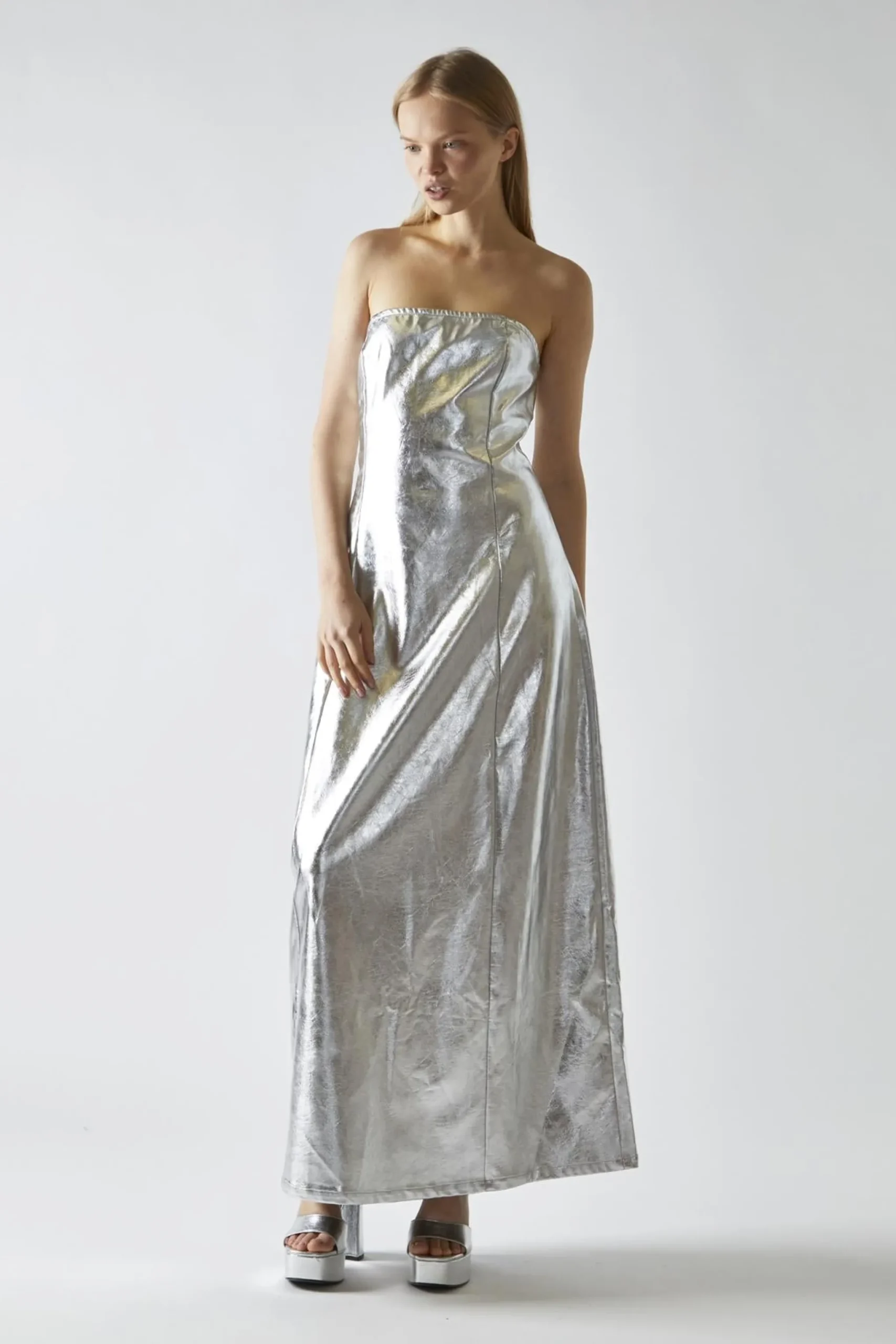 Glamorous Women’s Silver-PU Bandeau Maxi-Dress. Shine bright at your next event with this stunning silver PU bandeau maxi-dress. The sleek, straight fit flatters your figure in all the right places. The bandeau neckline adds a touch of allure, making it perfect for showcasing your favourite statement necklace or letting your natural beauty shine through. With its maxi length, this dress provides an elegant flow, while the center back split adds a playful twist and allows for easy movement. Made from high-quality PU fabric, it’s not only stylish but also comfortable for all-night wear. This versatile piece is perfect for everything from cocktail parties to special celebrations, ensuring you’ll turn heads wherever you go. With this dress in your wardrobe, you’ll always have a go-to option for making a memorable entrance..