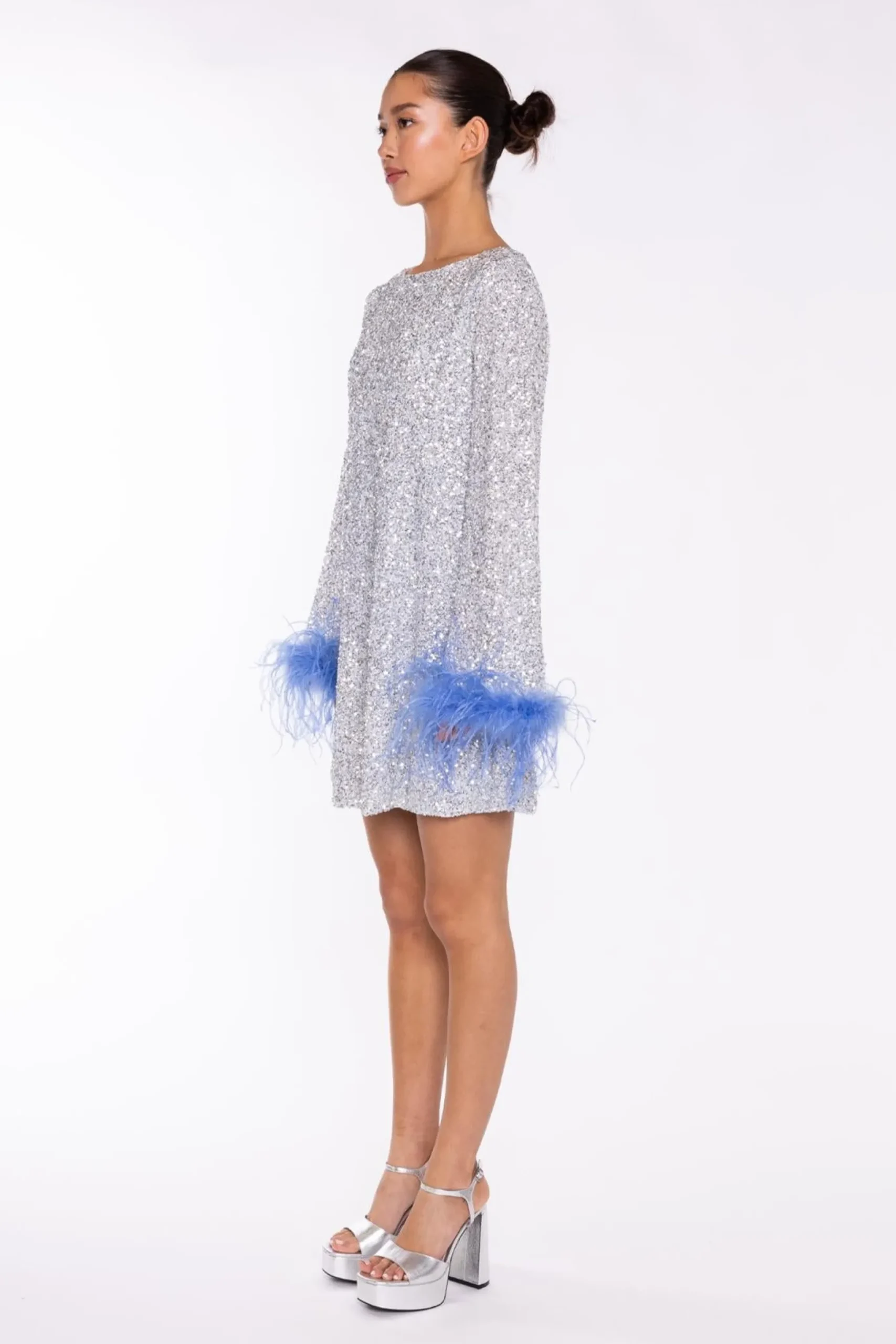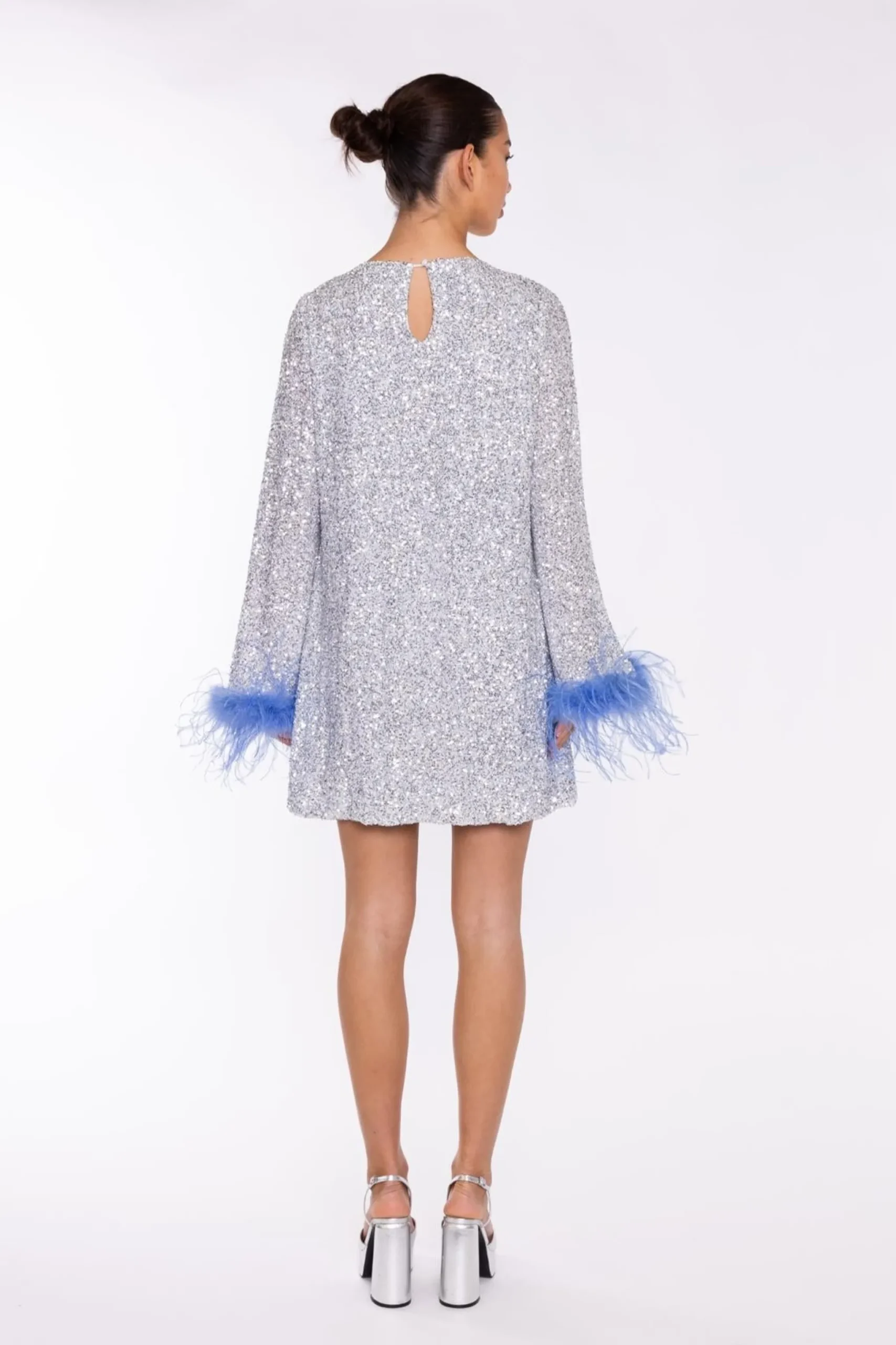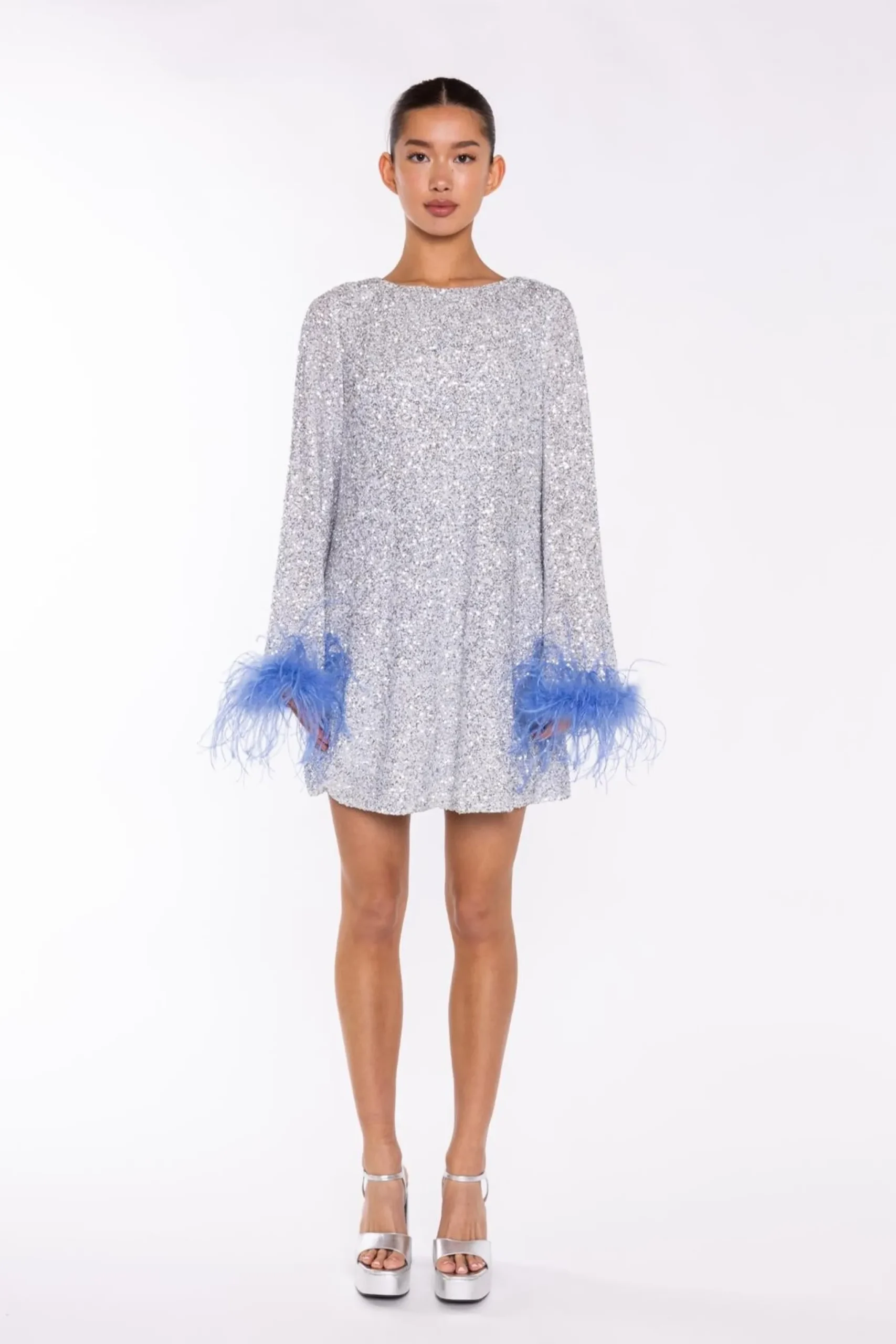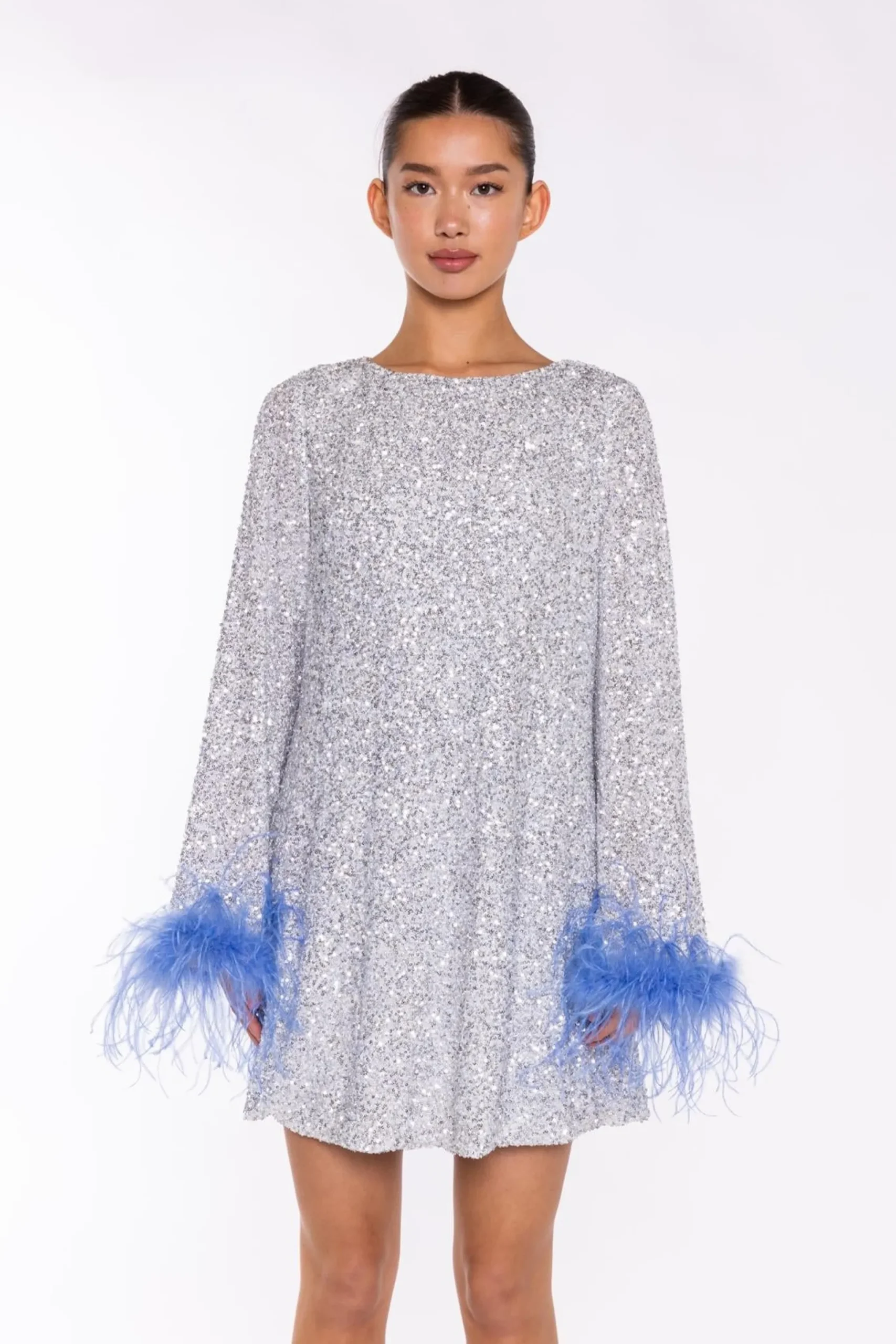 Glamorous Women’s Silver-Sequin Blue Feather-Cuff Mini-Dress. Introducing the captivating Silver-Sequin Blue Feather-Cuff Mini-Dress! This stunning piece is a true showstopper, with its mesmerizing silver sequins and delicate feather-trimmed cuffs. The long, flared sleeves add a touch of drama, while the crew neck and mini length create a chic, effortless silhouette. Slip into this dress and let the feathers dance with every step, turning heads wherever you go. Whether you’re attending a glamorous event or simply want to add a touch of sparkle to your day, this dress is sure to make you feel confident and fabulous. Embrace your inner diva and let the Silver-Sequin Blue Feather-Cuff Mini-Dress be the star of the show.