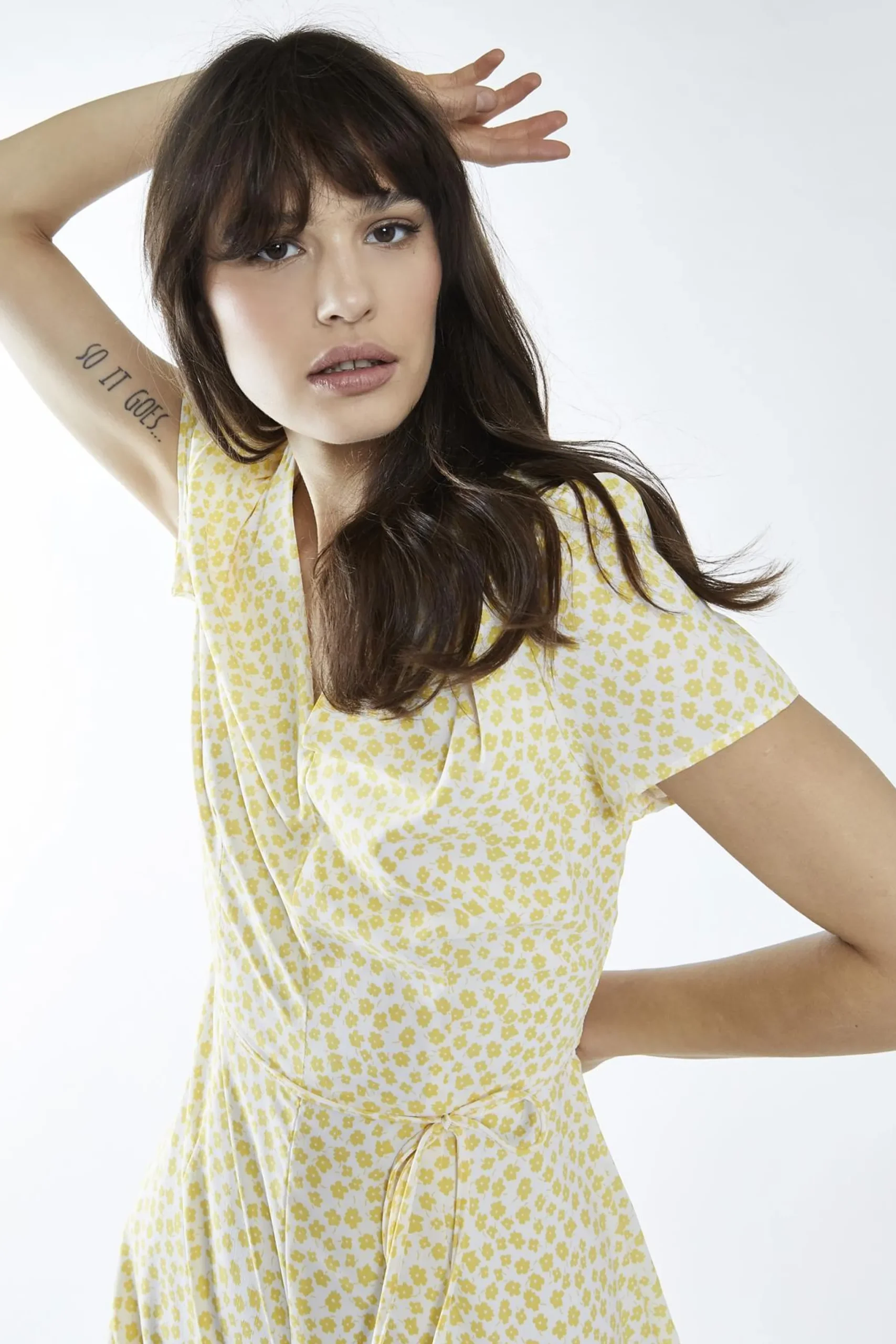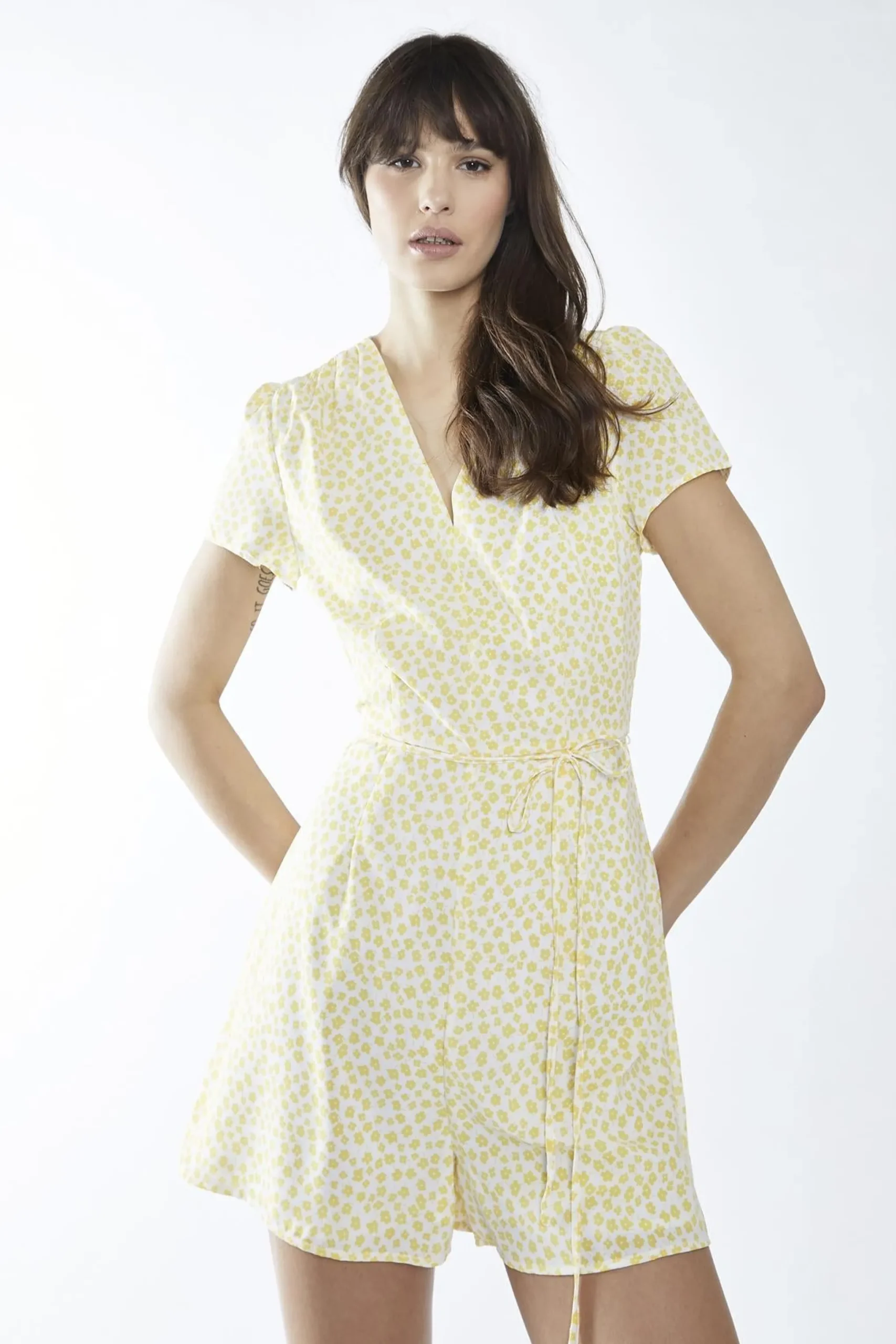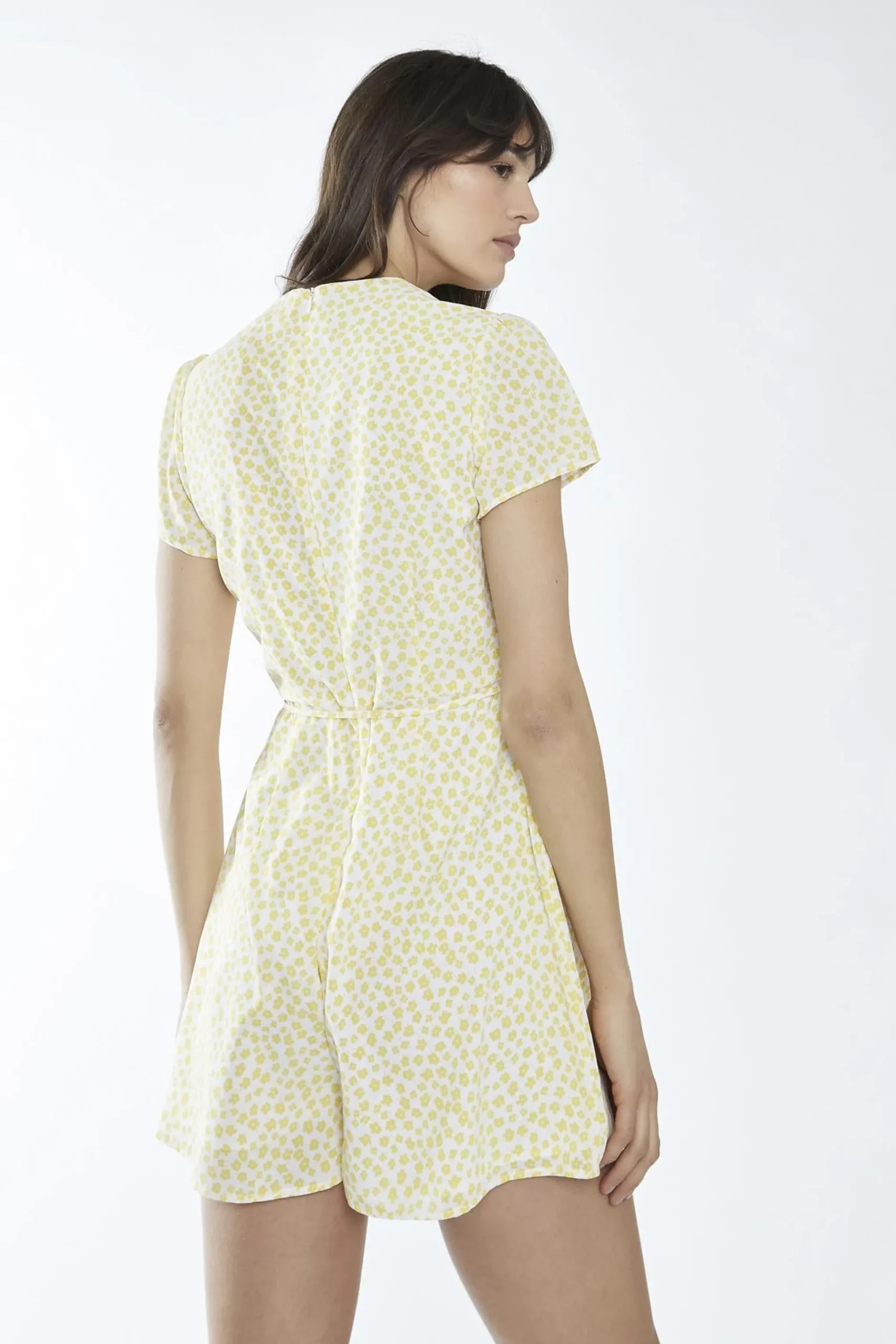 Glamorous Women’s White-Yellow Ditsy V-Neck -Playsuit. Introducing the White-Yellow Ditsy V-Neck Playsuit – your new go-to for effortless style and comfort. This playsuit features a flattering v-neck, perfect for showcasing your best features. The waist tie allows you to cinch in your waist for a more defined silhouette, while the short sleeves keep you cool and breezy. The relaxed fit ensures you can move freely, whether you’re running errands or enjoying a day out. With a fully lined interior and a concealed zip fastening at the back, this playsuit offers both style and practicality. Embrace the carefree charm of this white and yellow ditsy print and let your personality shine through.