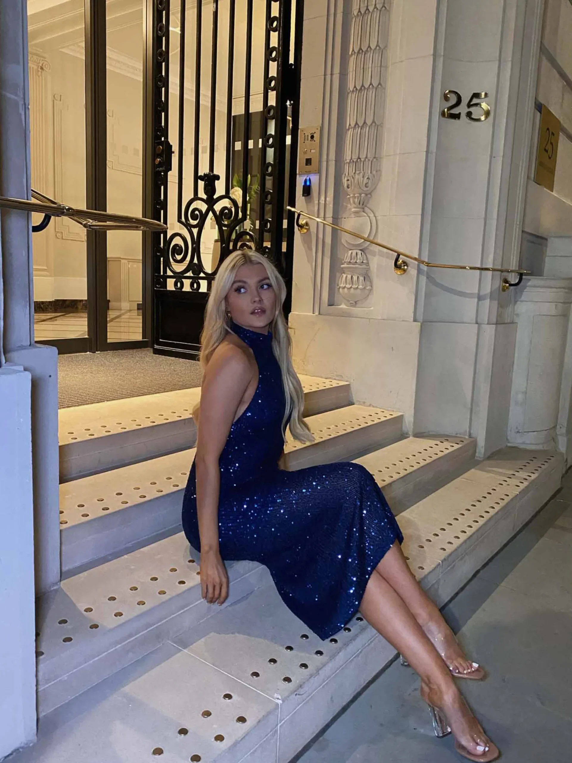 Glamorous Navy Peony Sequin Halter Neck Midi Dress. Perfect for those special occasions, this stunning piece features a halter neck design, and midi length, all in this beautiful sequin fabric. Pair with some strappy heels to create a show stopping look.