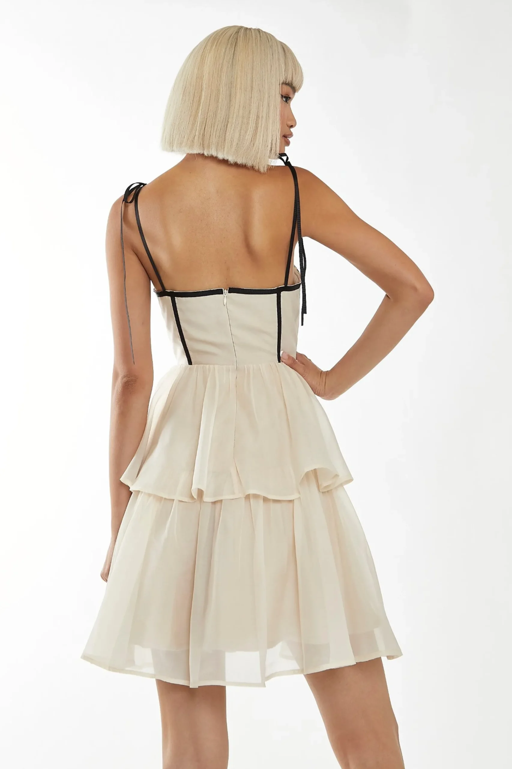 Glamorous Studio Womens Nude-Black Tiered Corset Mini-Dress. Perfect for drinks with the girls or a date night, this mini dress featuring a tired skirt and corset top with contrast binding details will have heads turning.