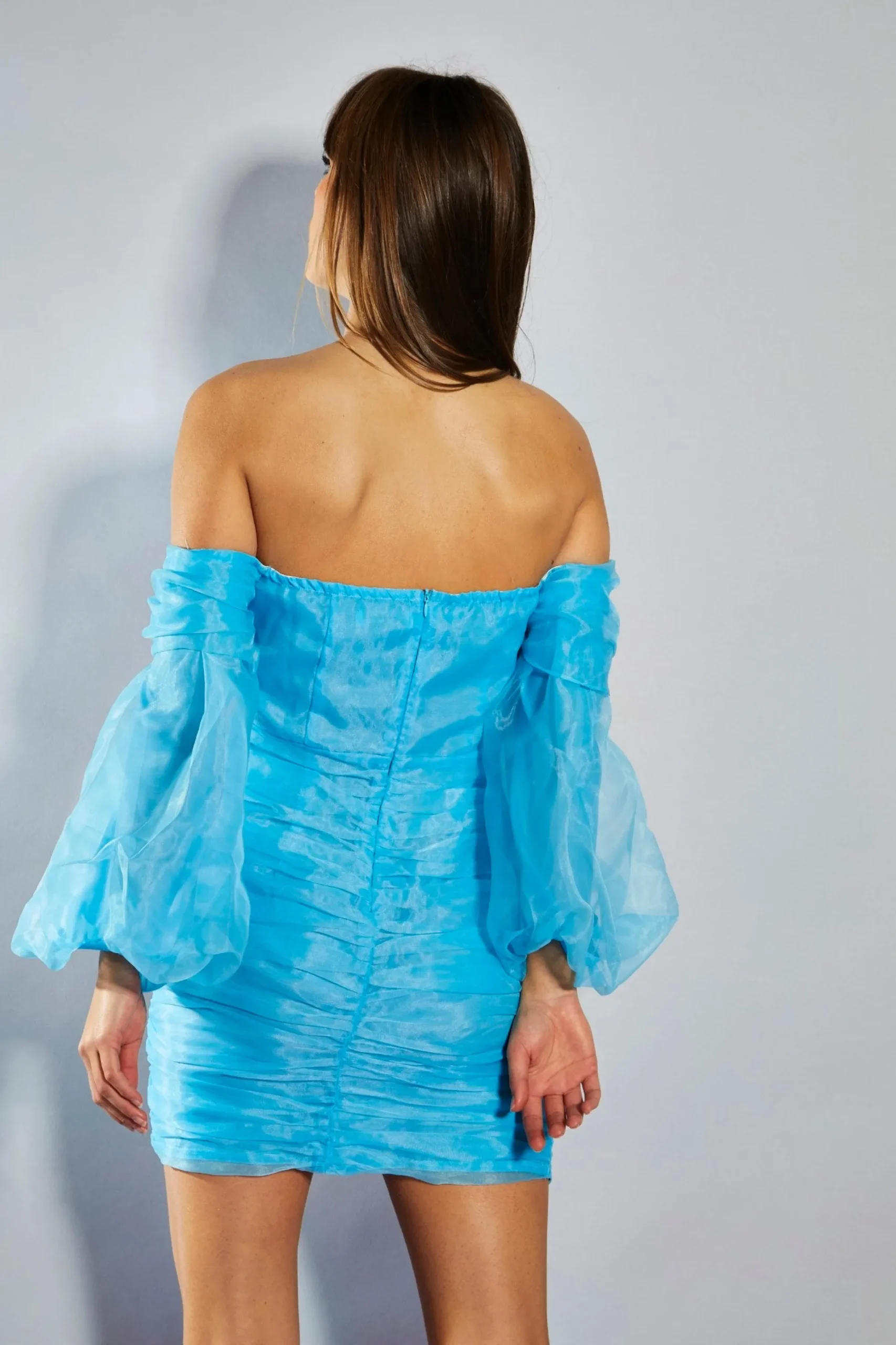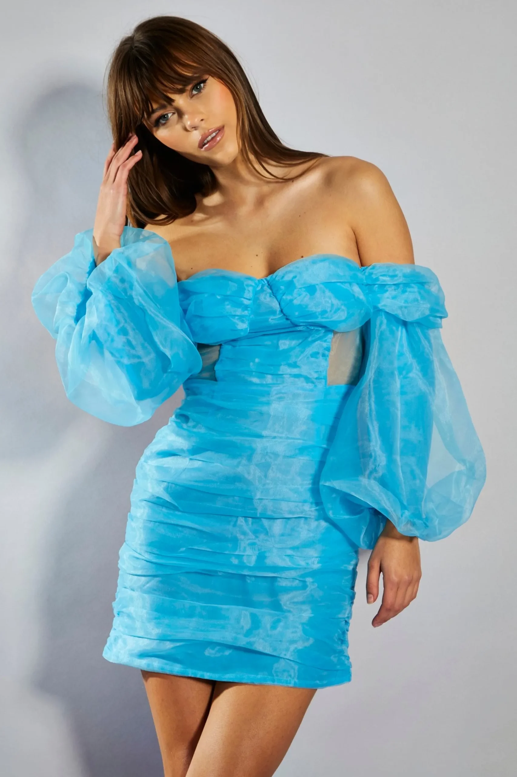 Glamorous Collection Teal Bardot Corset Mini Dress. Add one of this seasons biggest trends to your wardrobe with this corset dress. Featuring a bardot neckline, sheer side panels, voluminous long sleeves, corset style bodice and all over gathers, this luxe mini dress is the perfect way to elevate your look for autumn.
