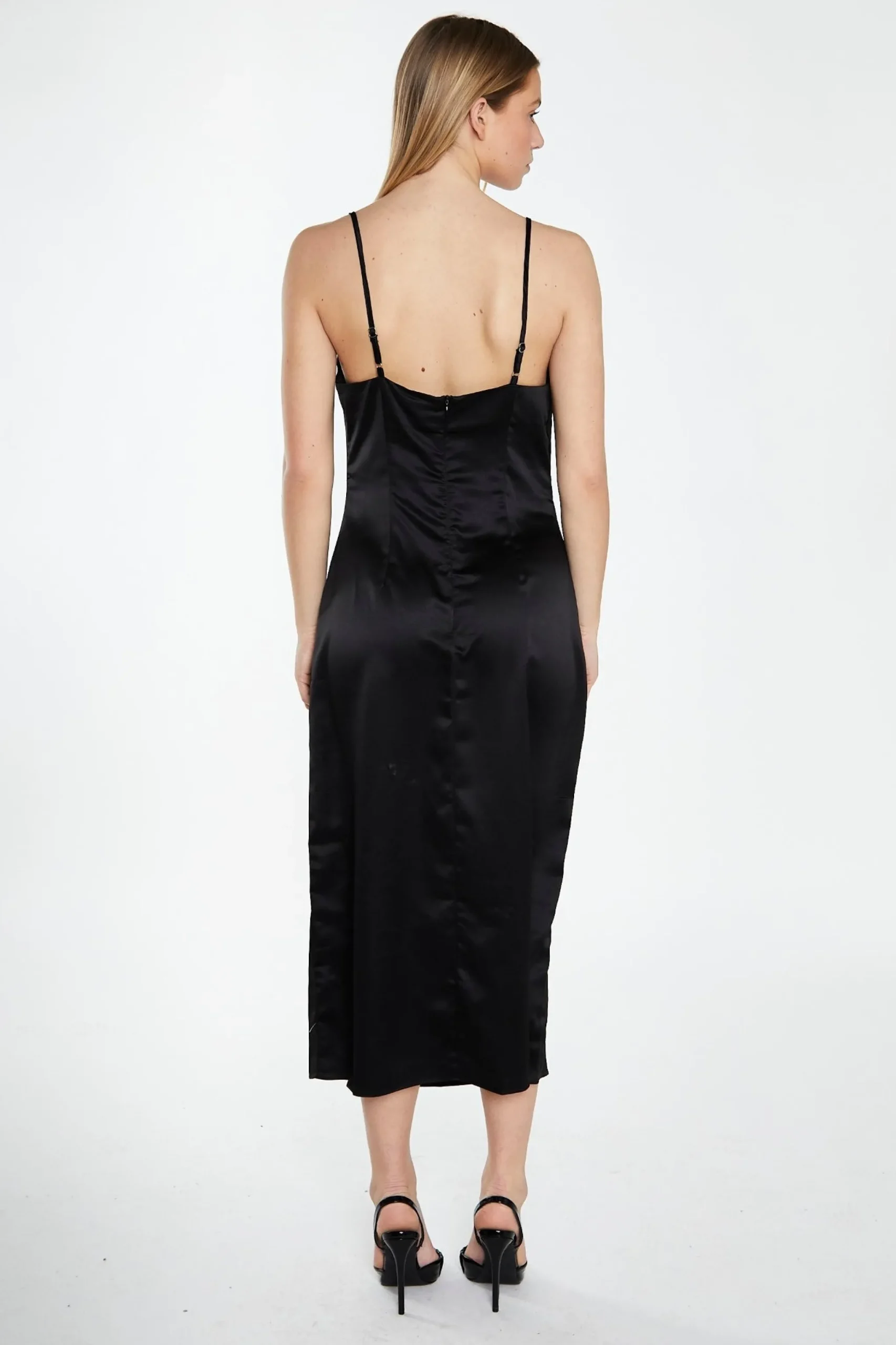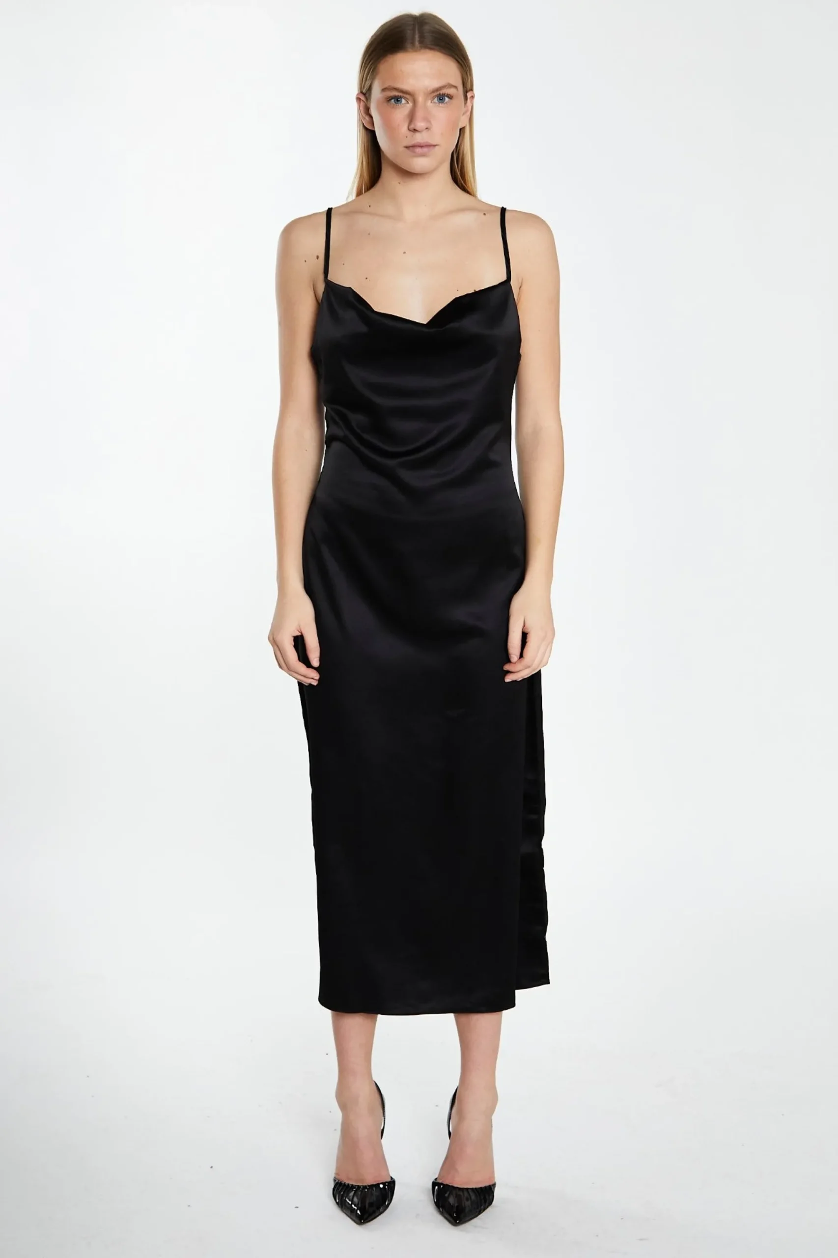 Glamorous Womens Black Satin Cowl Neck Midi Dress. This dress is perfect for a special occasion. Featuring a sophisticated cowl neckline in a flattering midi fit, this dress will have heads turning. Pair with your favourite strappy heels for an elegant evening look.