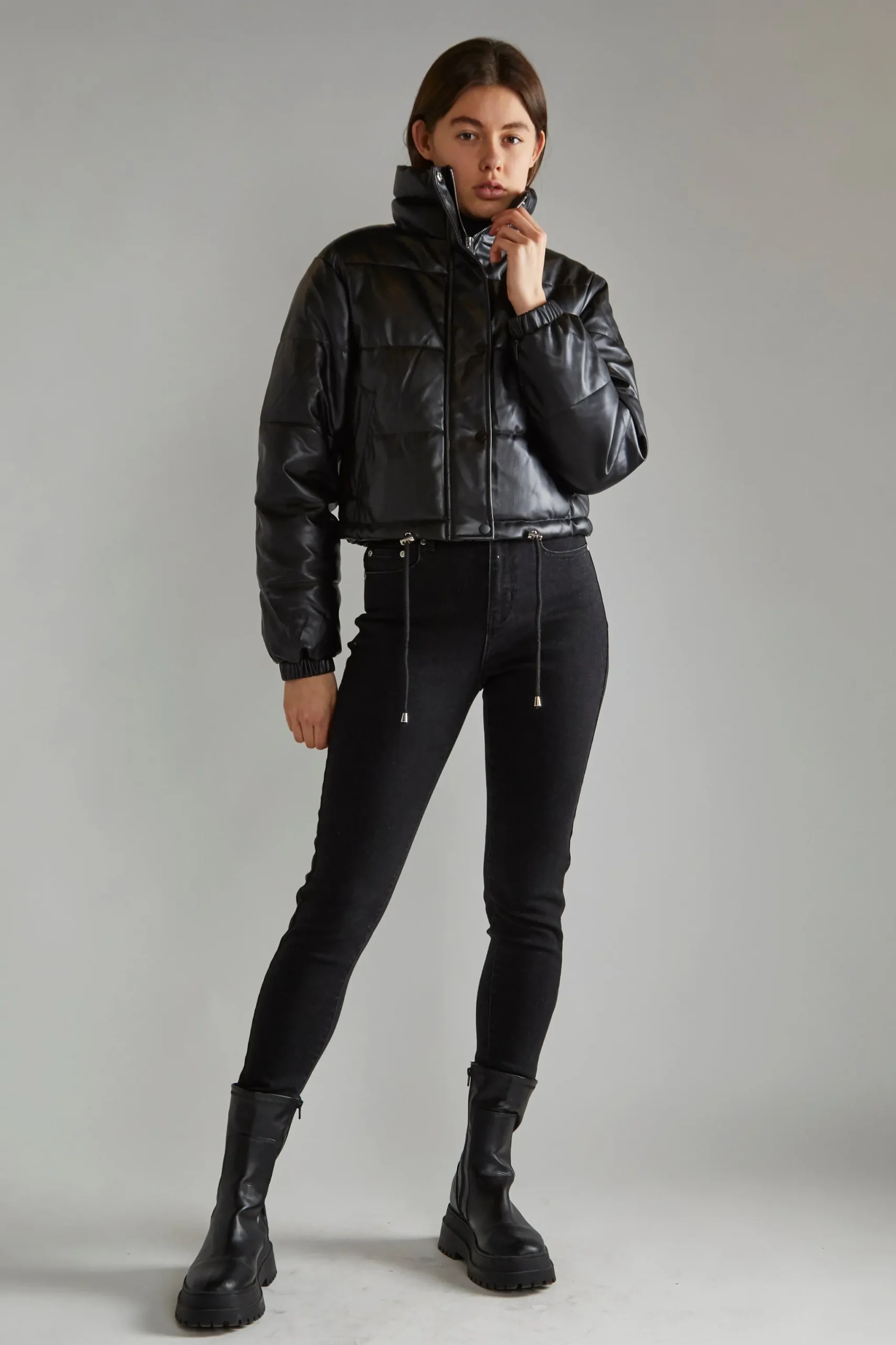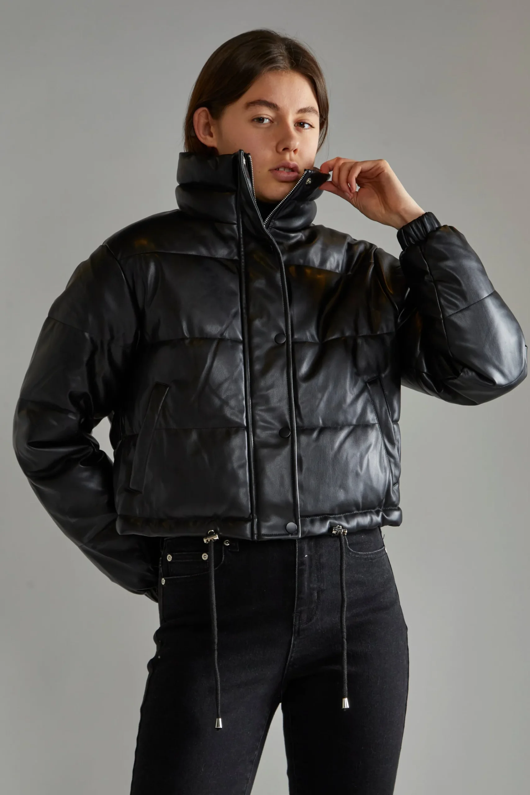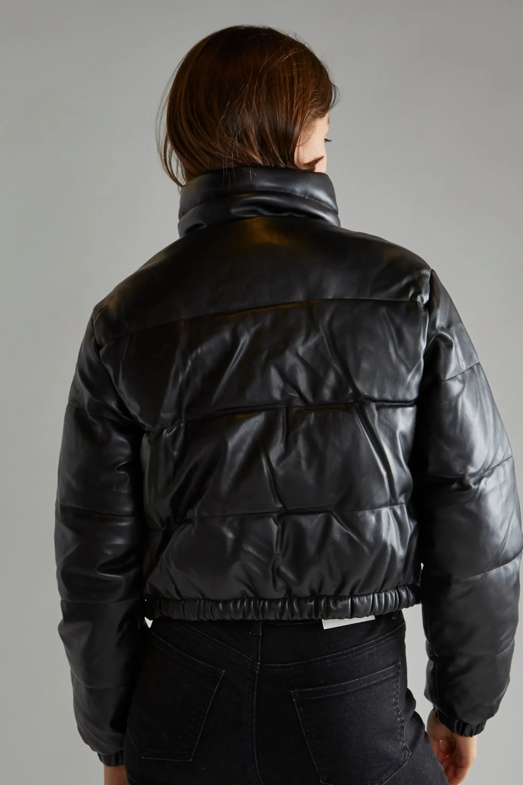 Glamorous Womens Black PU Puffer Cropped-Jacket. Stay chic and cozy on cold days with our Black PU Puffer Cropped-Jacket. This stylish puffer jacket features PU fabric, toggle details, and a cropped fit to keep you warm and looking your best. Fully lined, this piece is a must-have for any fashion-forward winter wardrobe!