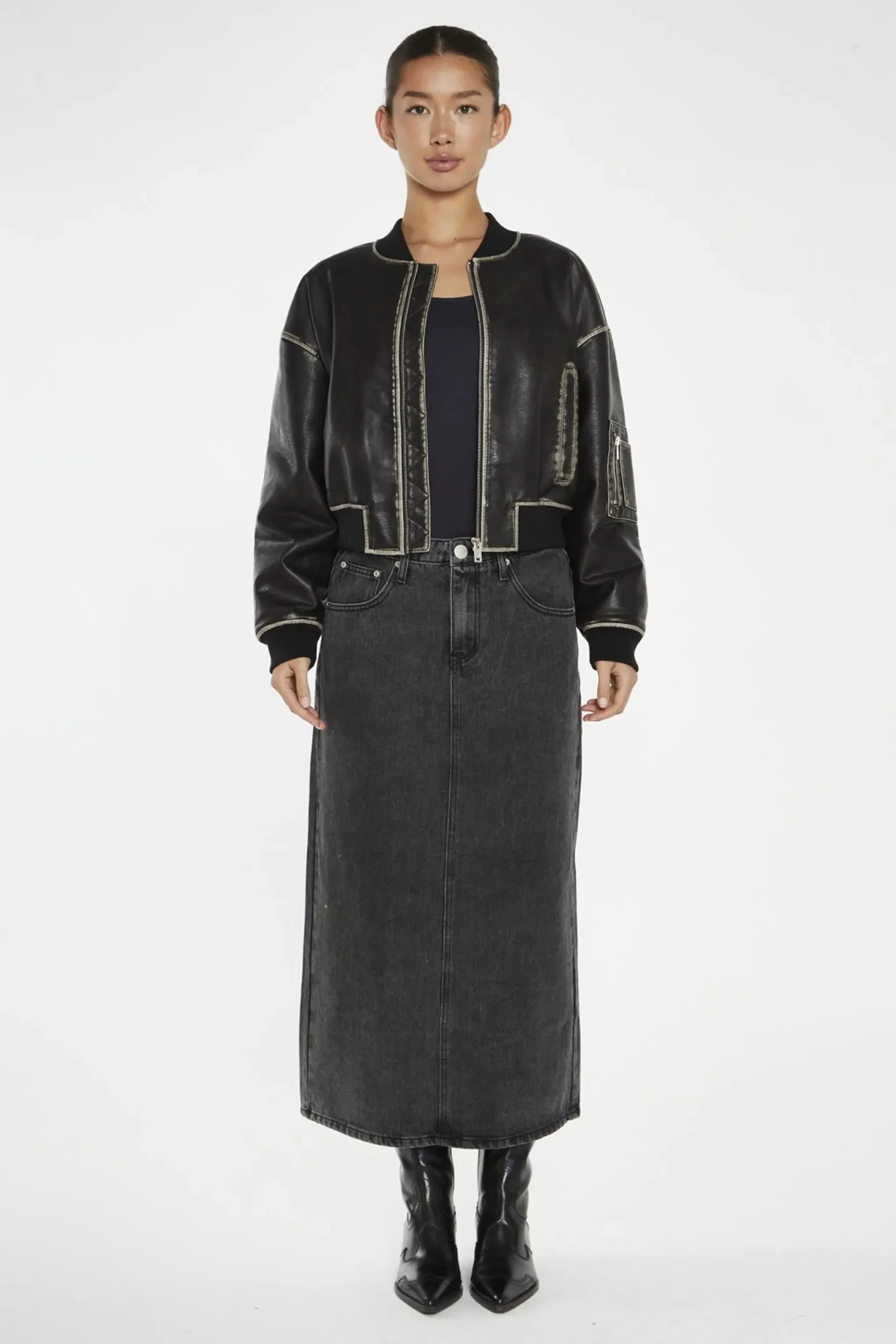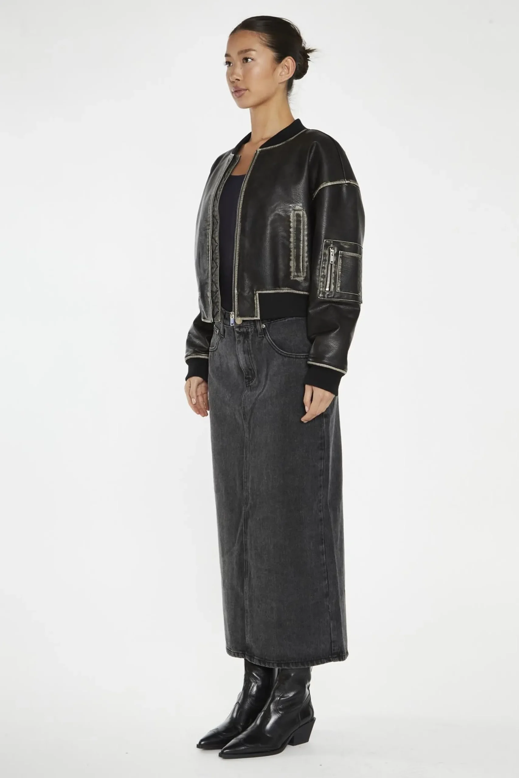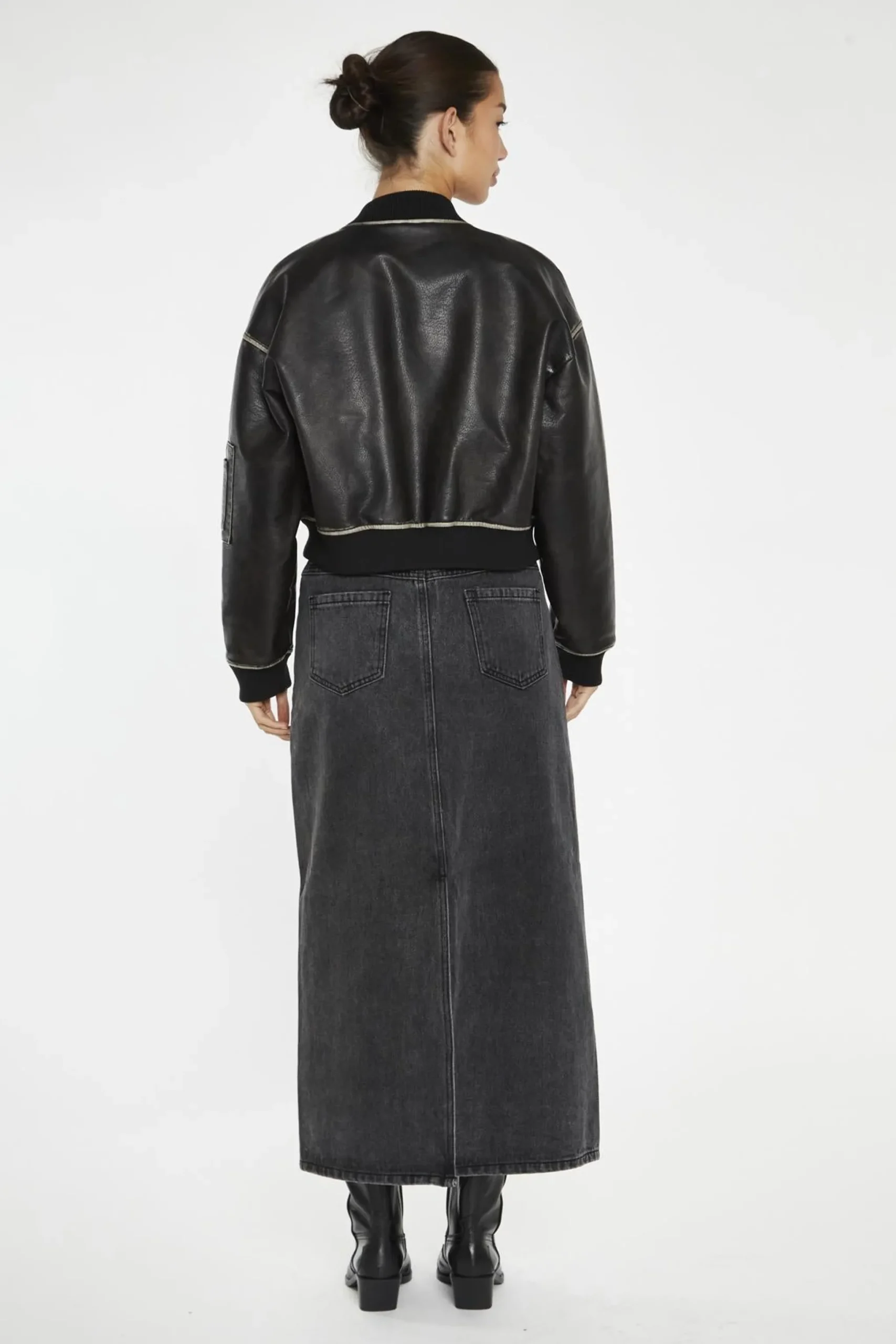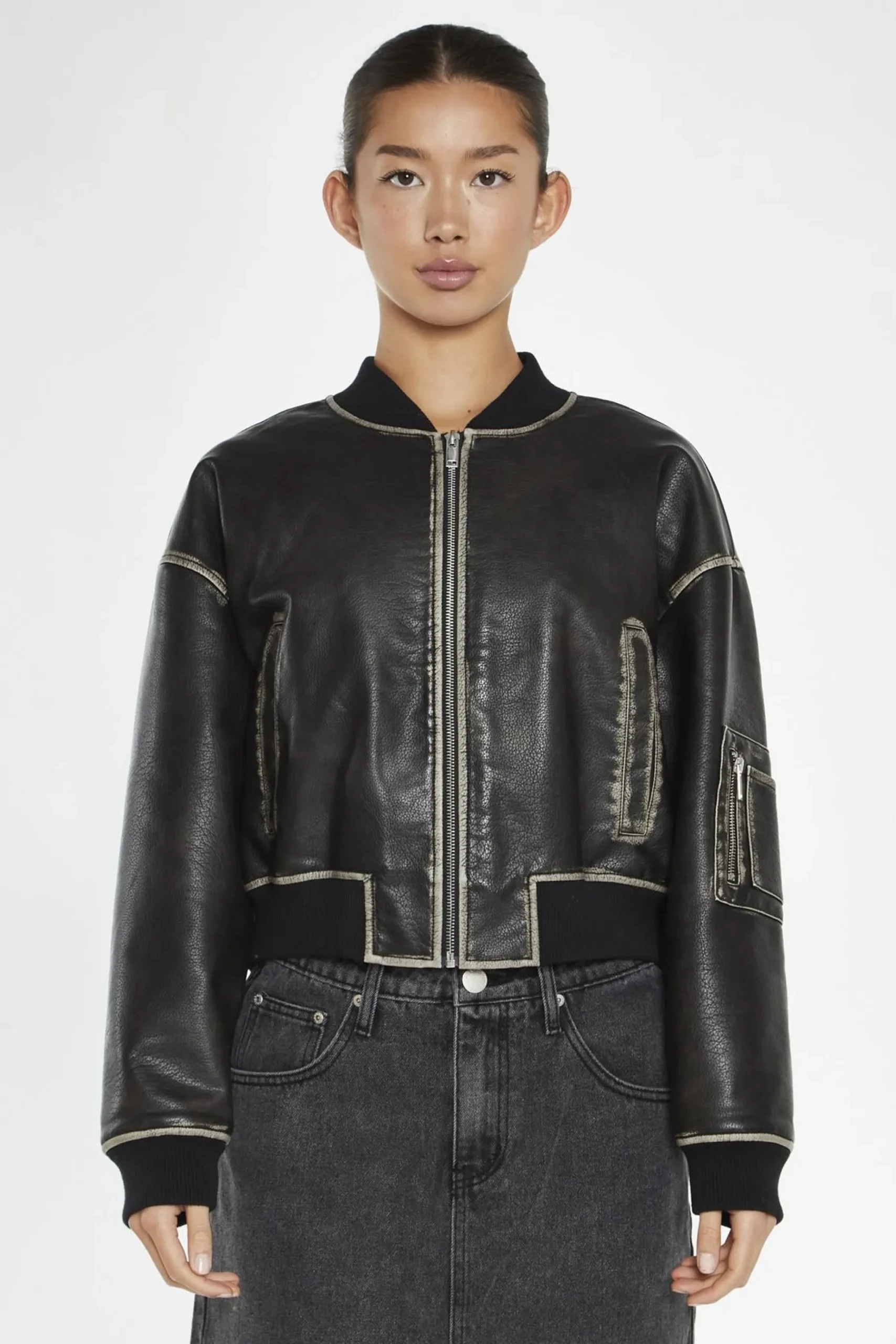Glamorous Women’s Washed-Black Padded Bomber-Jacket. Looking for a cool jacket that’s both practical and stylish? Check out this washed-black bomber jacket. It’s made from PU fabric, giving it a sleek look that’s also easy to clean. The padded lining keeps you warm when the temperature drops, making it perfect for those chilly evenings or brisk mornings. The ribbed cuff and hem add a classic touch while helping to keep the cold air out. One of the coolest features is the utility patch pocket on the sleeve – it’s not just for show, it’s actually super handy for keeping small items close at hand. This jacket is versatile enough to pair with jeans for a casual look or dress up with slacks for a night out. It’s the kind of piece that becomes a go-to in your wardrobe, ready to add a bit of edge to any outfit..