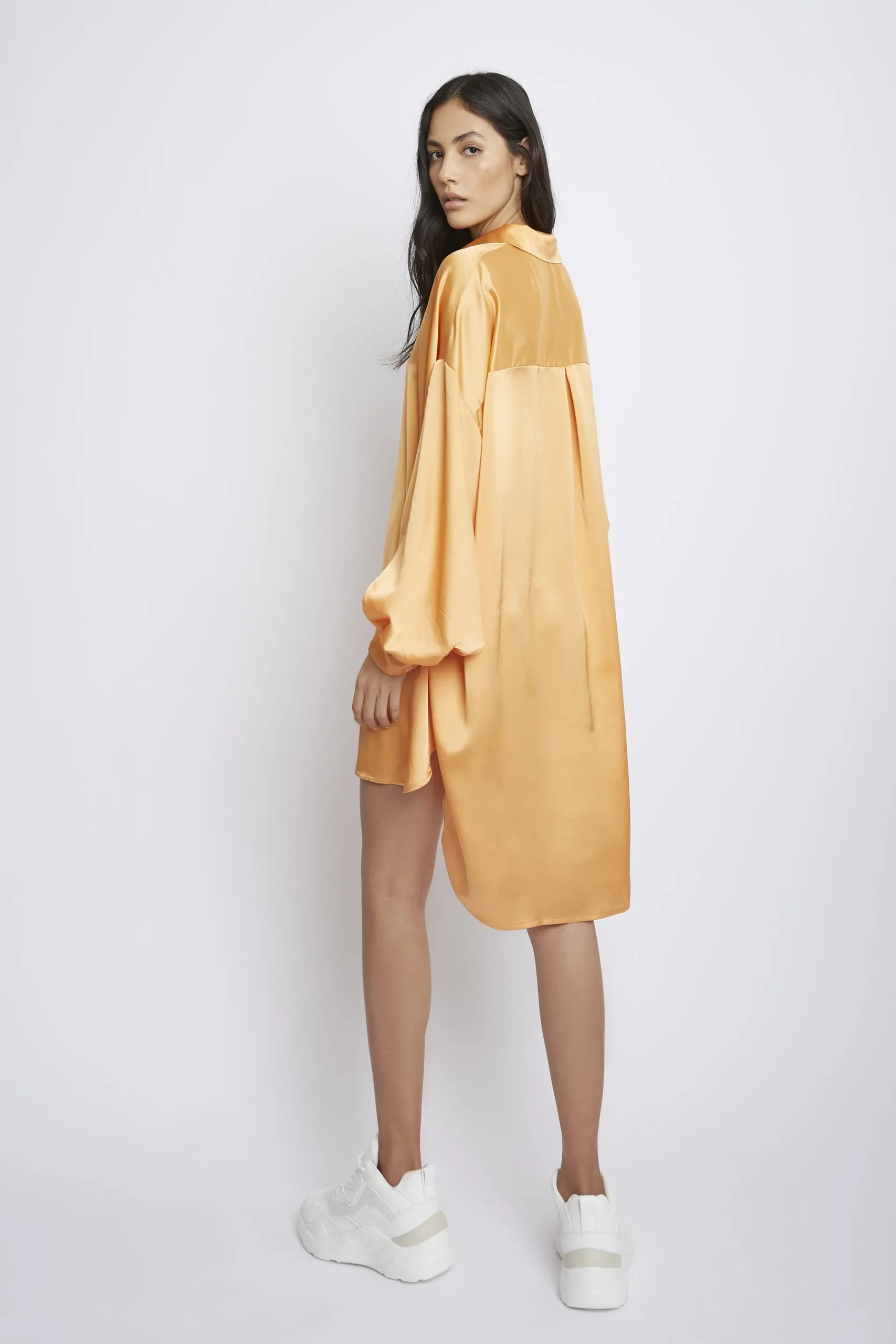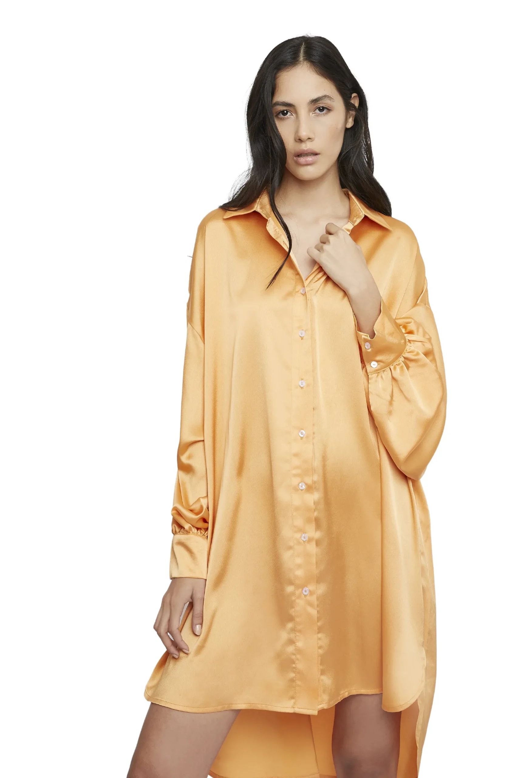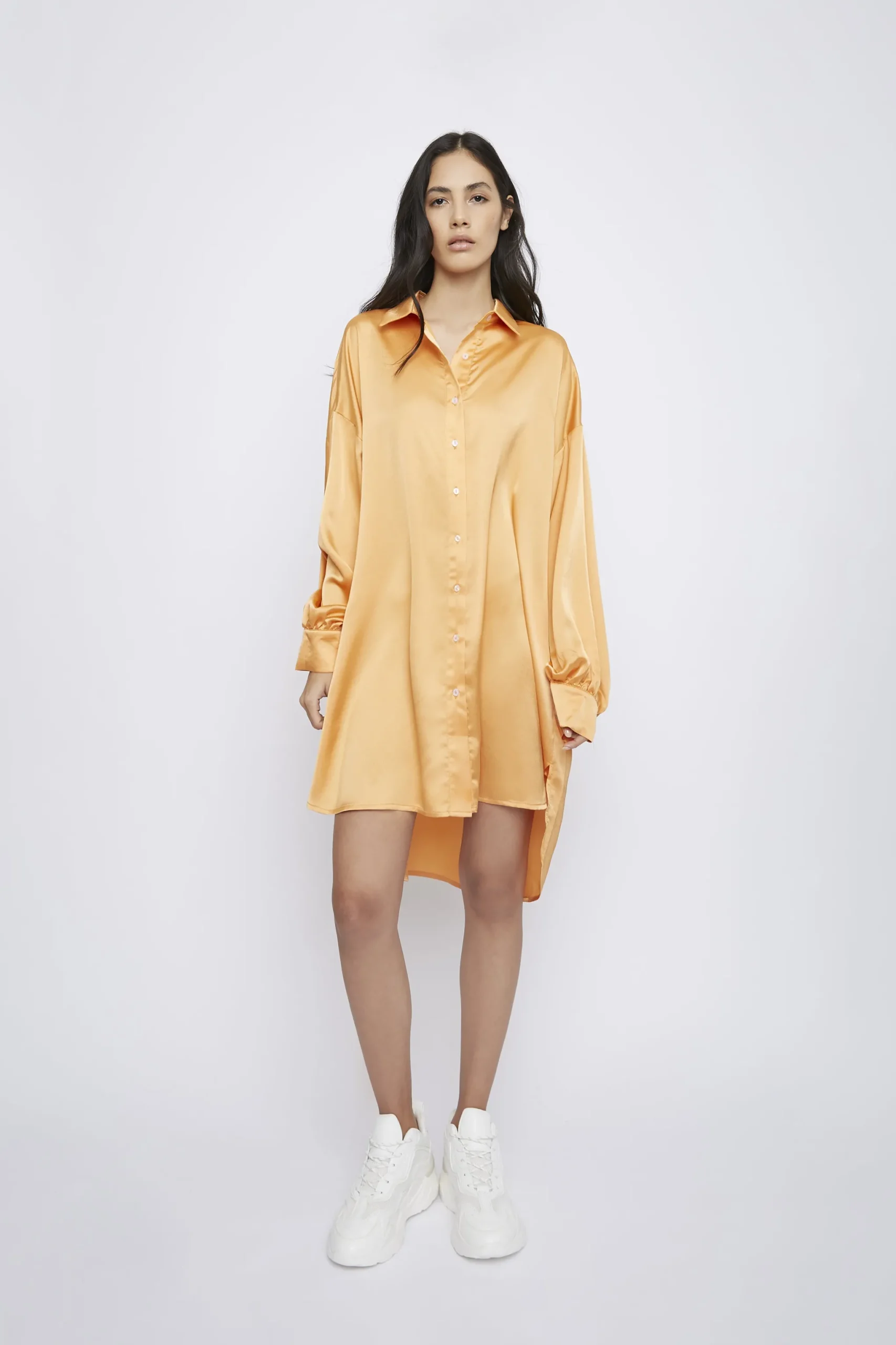 Glamorous Womens Light Orange Oversized Satin Shirt Dress. Opt for an on trend piece with this satin shirt mini dress. This super flattering dress features a button front oversized style and flattering fit. Style with high knee boots for the daytimes and heels for the evening!