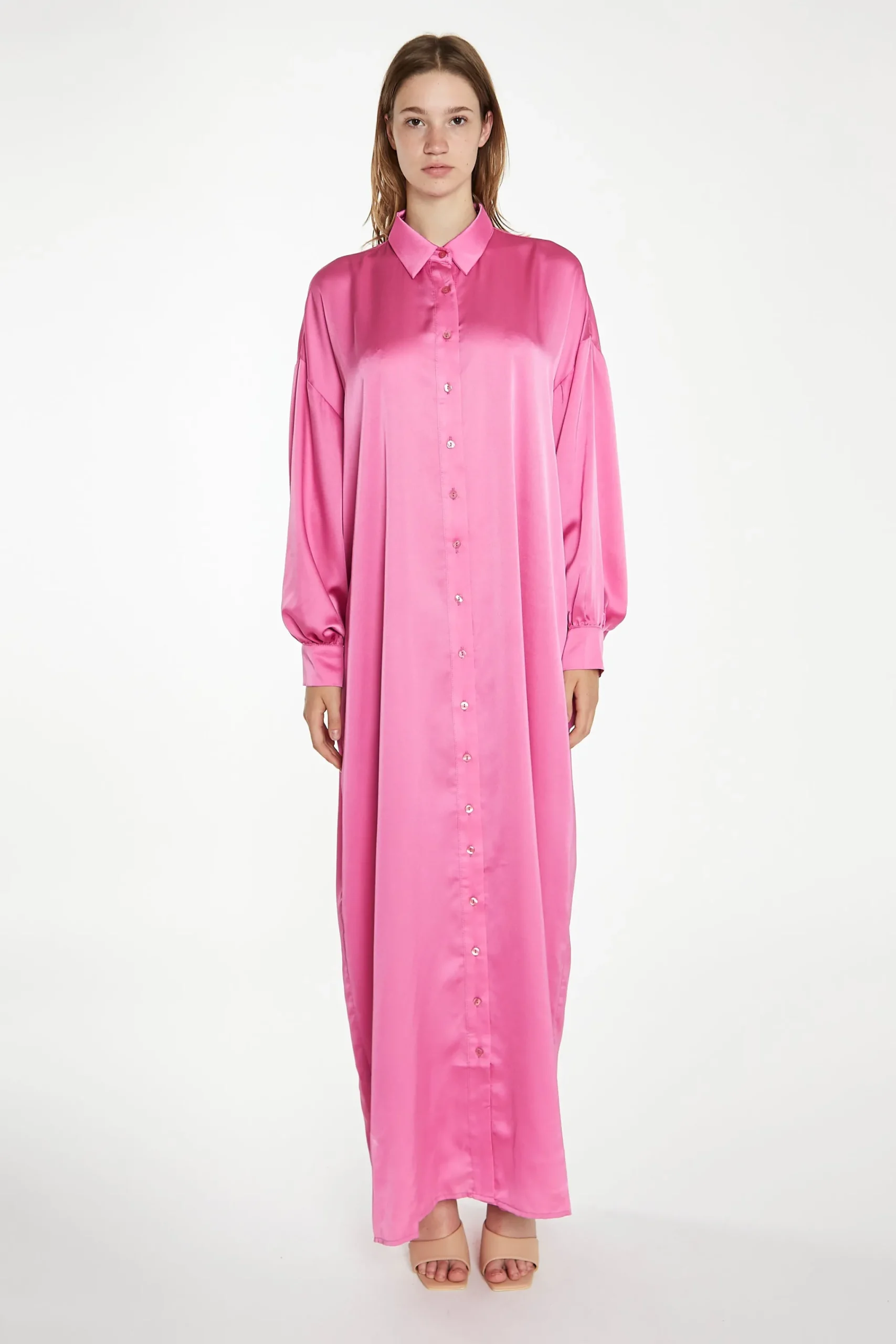 Glamorous Modesty Womens Pink Satin Oversized Maxi Shirt Dress. This classic shirt dress in a refreshing pink Satin fabric is the perfect Spring staple. Featuring button front detail with long sleeves and a flattering oversized relaxed fit in a maxi length, this shirt dress is the perfect way to elevate your look this season. Make sure to pair with some chunky trainers for that chic daytime look.