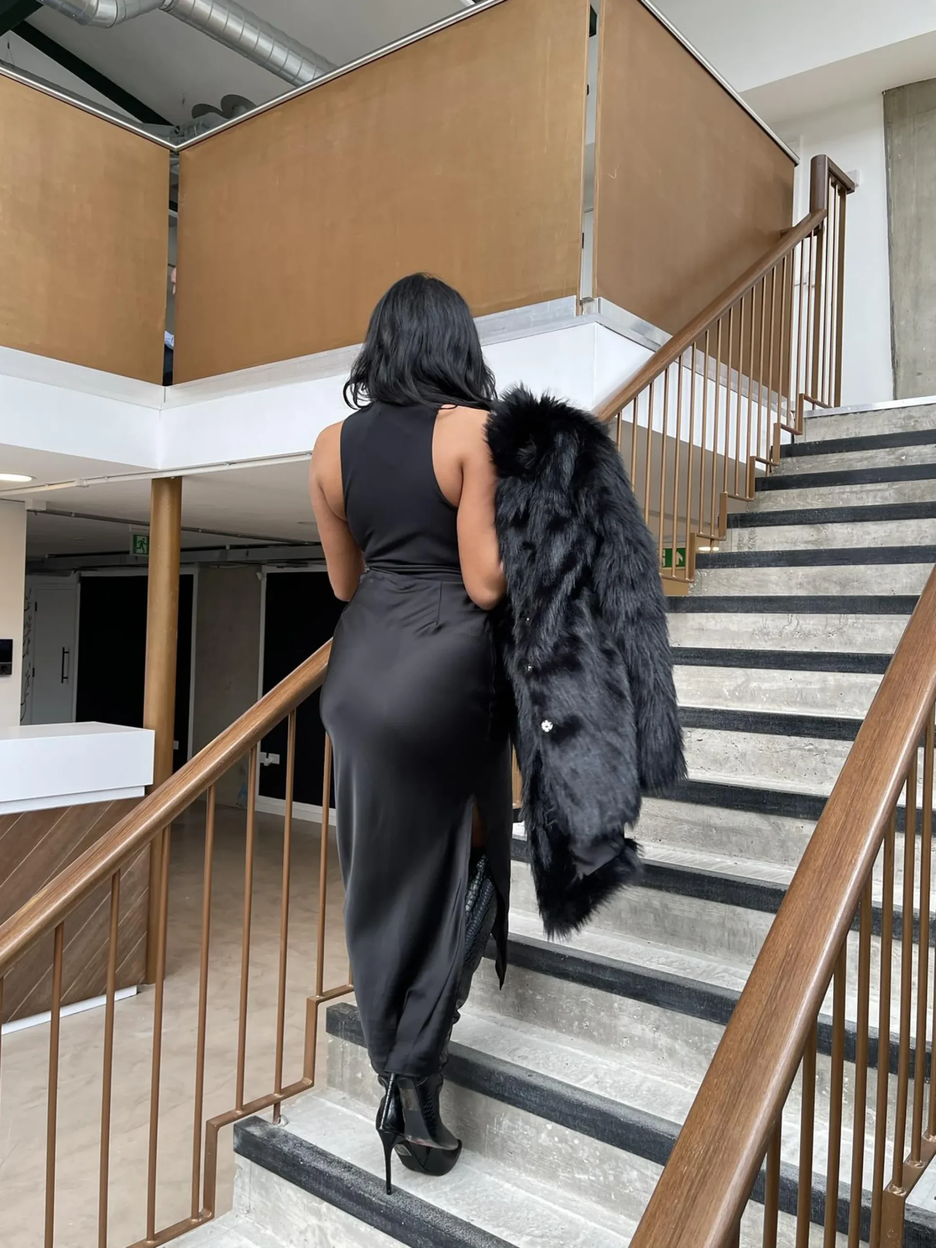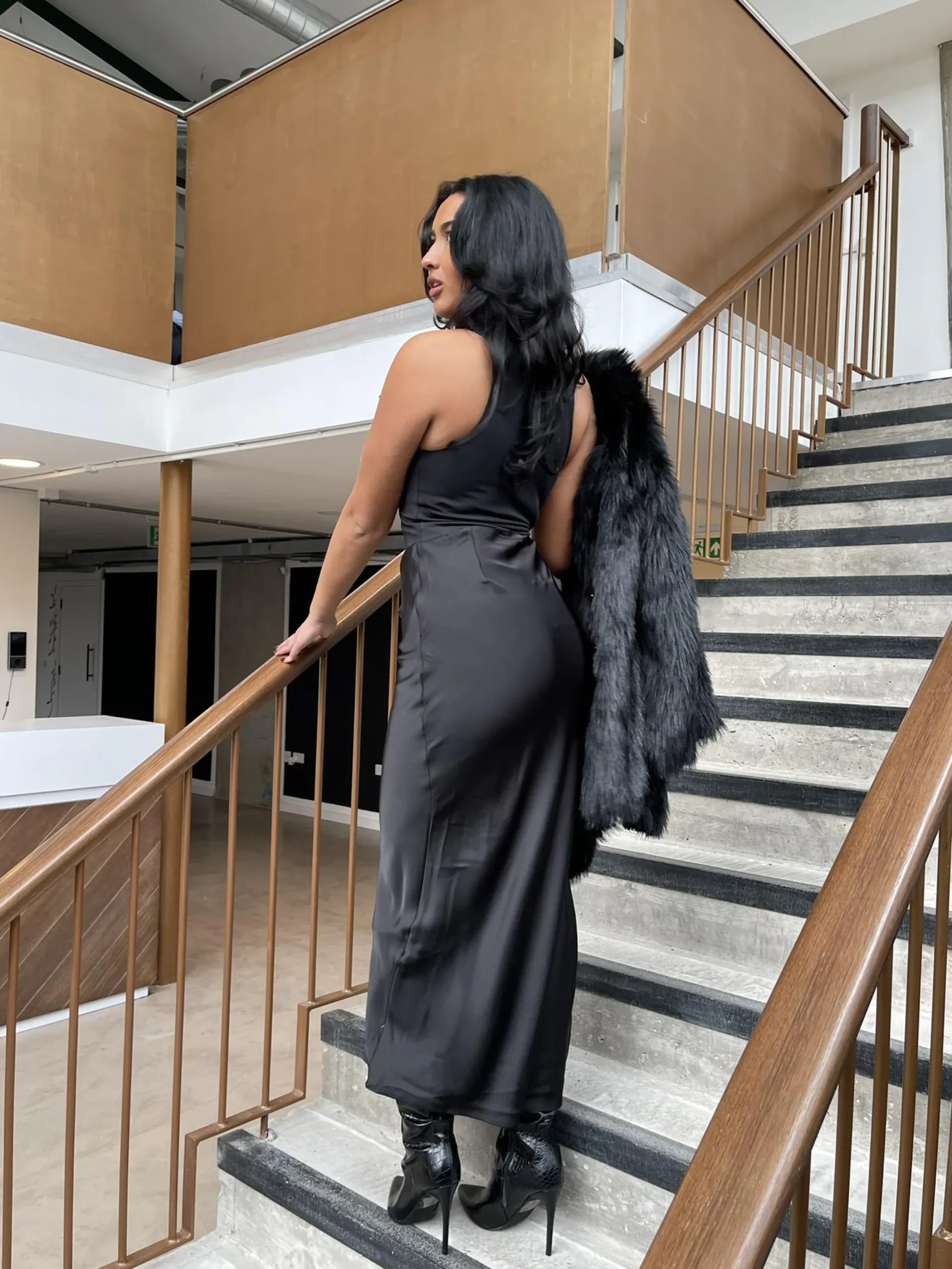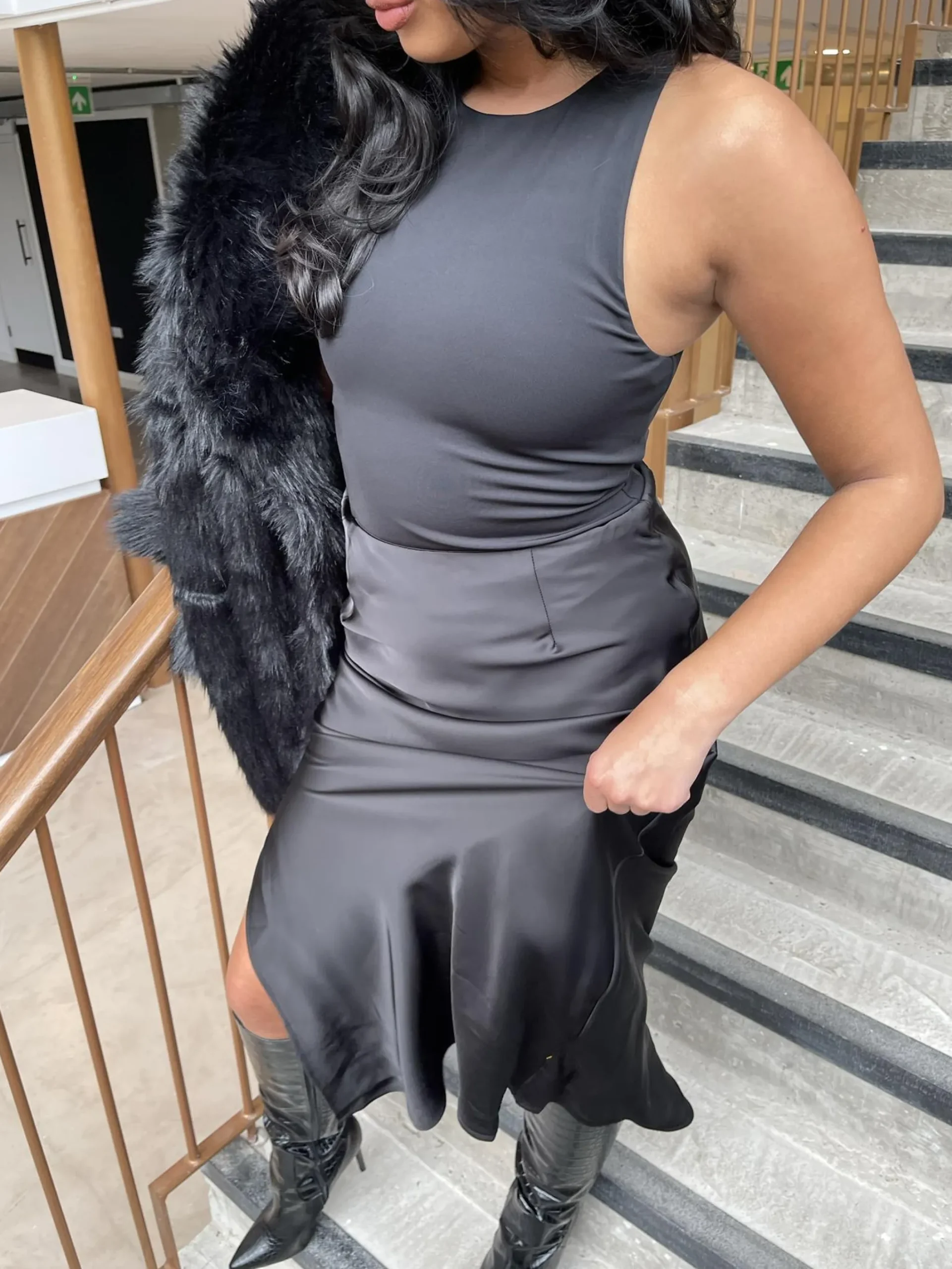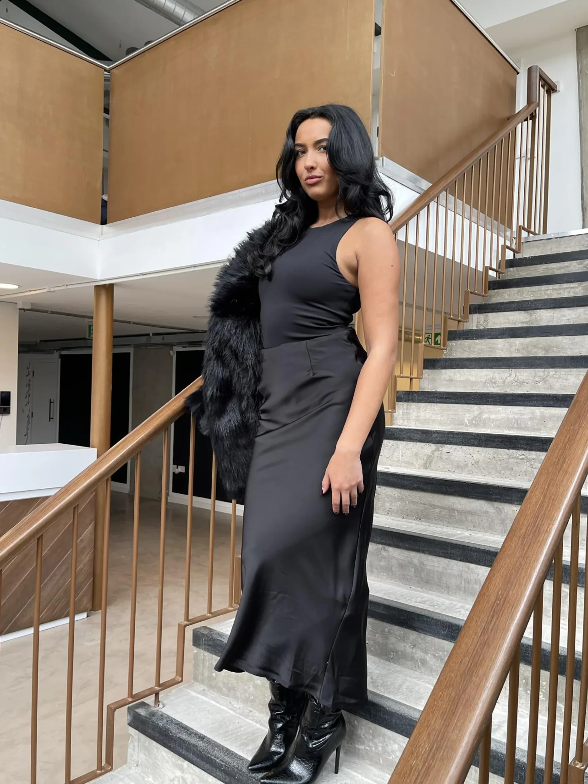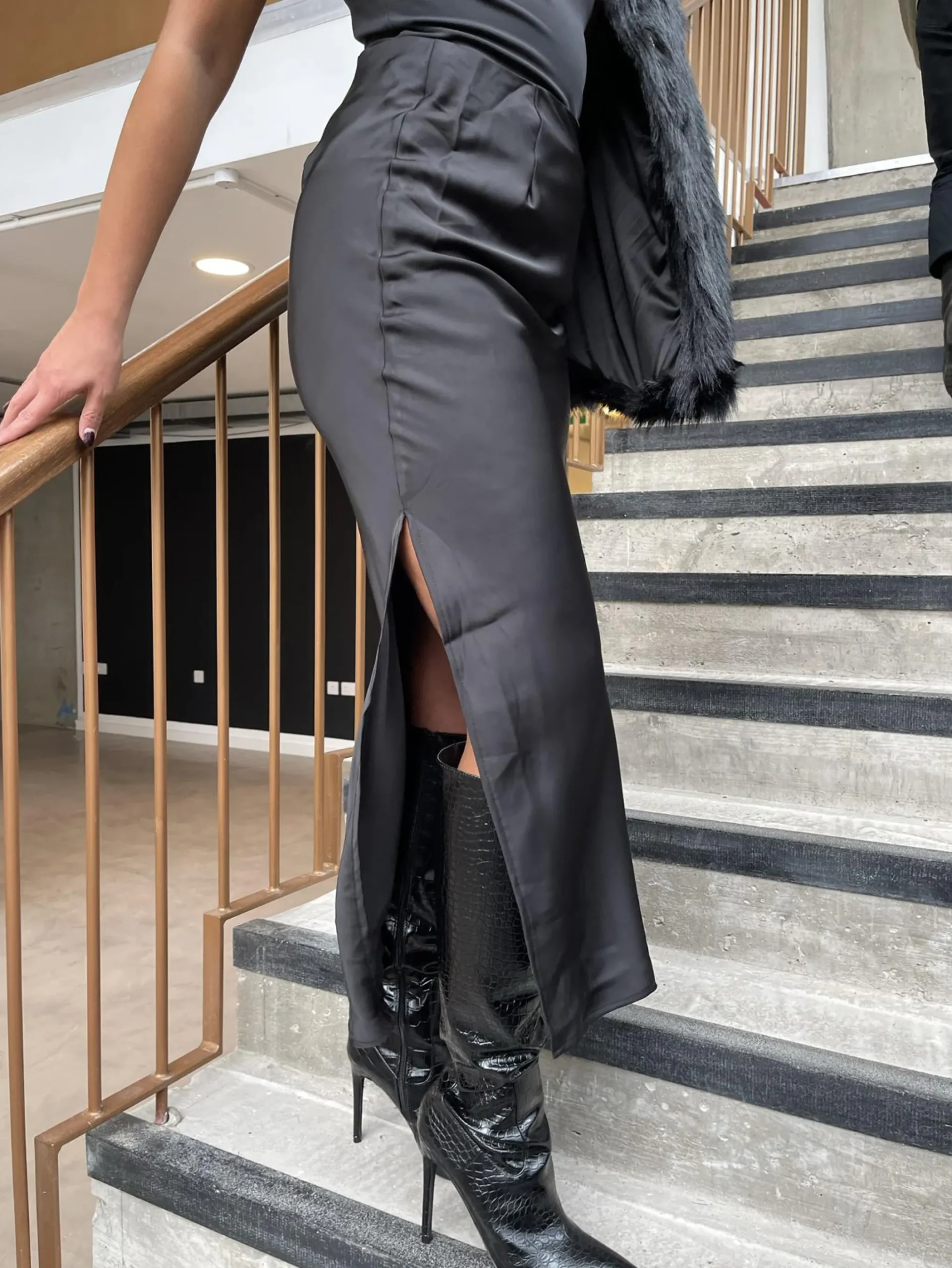 Glamorous Women’s Black Satin Maxi-Skirt. Bring a touch of elegance to your wardrobe with our Black Satin Maxi-Skirt. Made from luxurious satin fabric, this skirt feels smooth and lightweight, giving your outfit a polished, sophisticated look without sacrificing comfort. The high-waisted design is flattering and pairs beautifully with tucked-in tops, while the maxi length creates a graceful silhouette that flows with every step. Dress it up with a fitted blouse and heels for a night out, or keep it casual with a soft sweater for a cozy yet chic vibe. It’s a versatile piece that adds just the right amount of shine and drama to your day or evening looks.