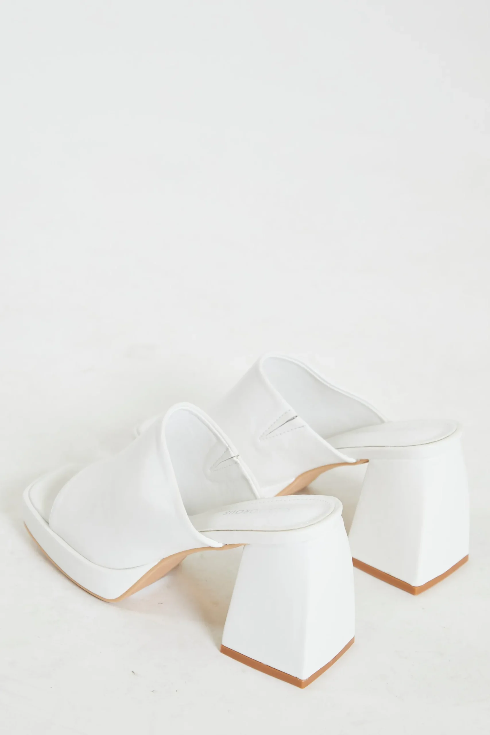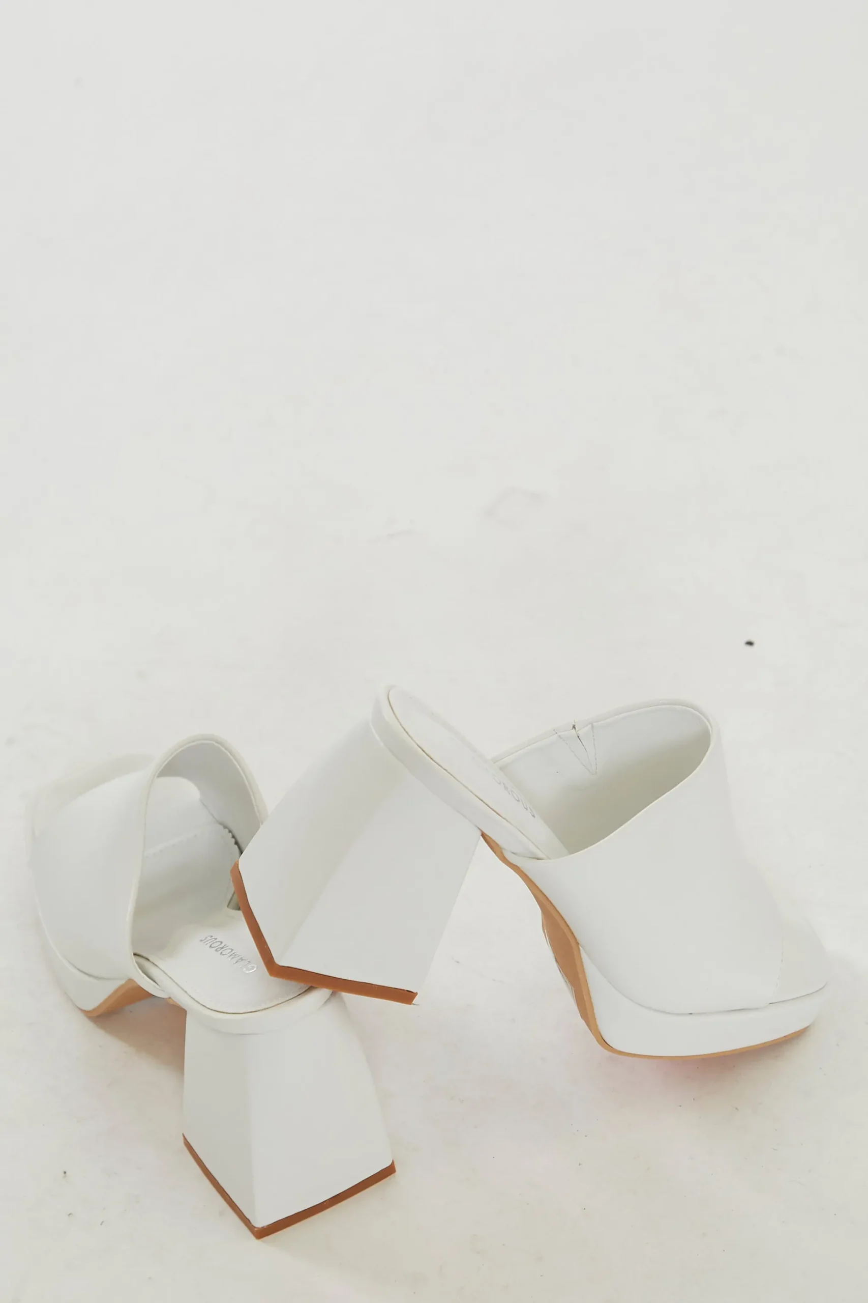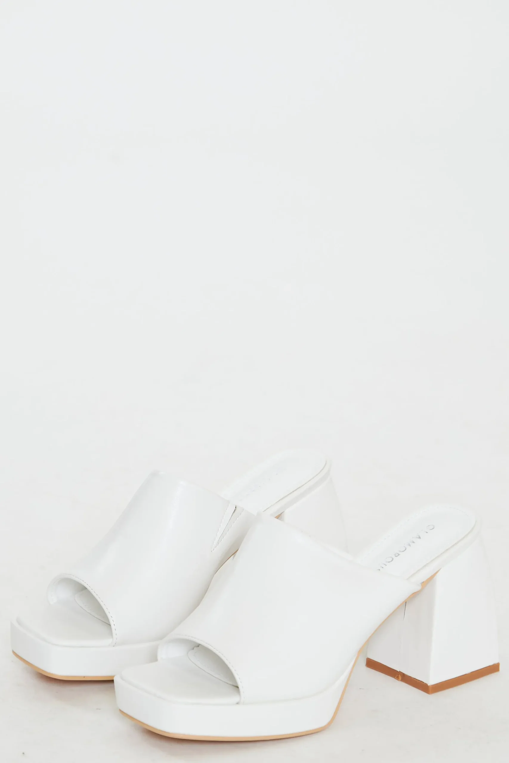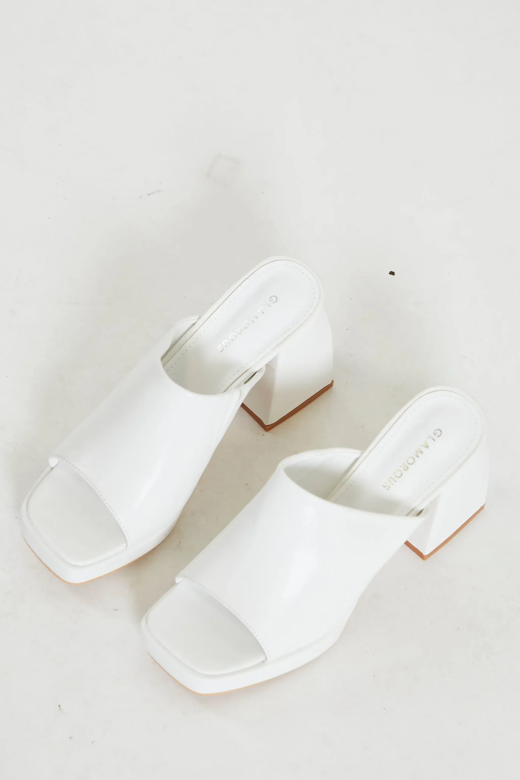 Glamorous White PU Block Heel Mules. These chic heeled mules will be your go to this summer season. Featuring a block heel with a slip-on mule style in a luxe PU finish, theyre our new season must-have. Style with denim jeans and a patterned blouse for the ultimate on trend look!
