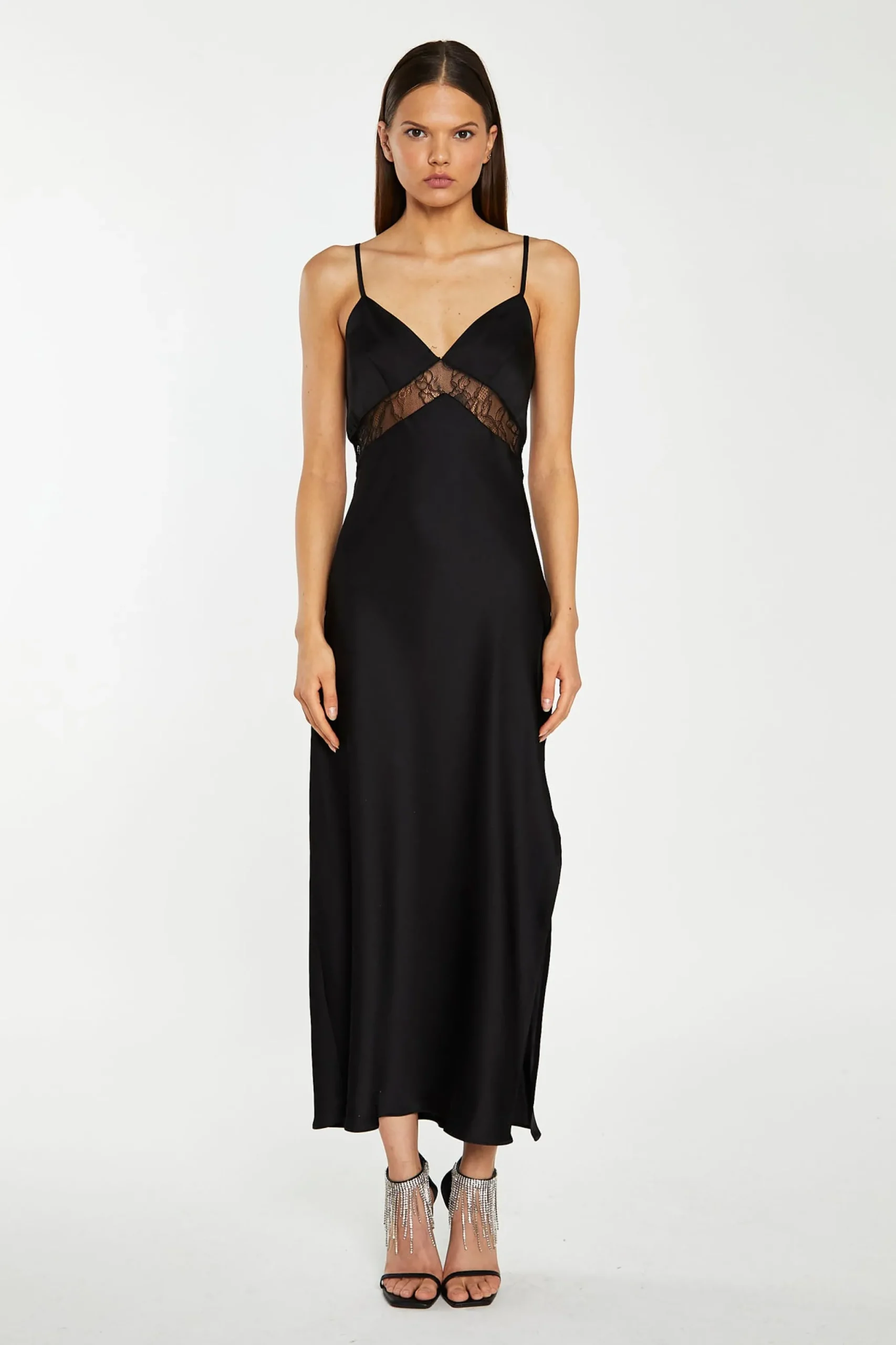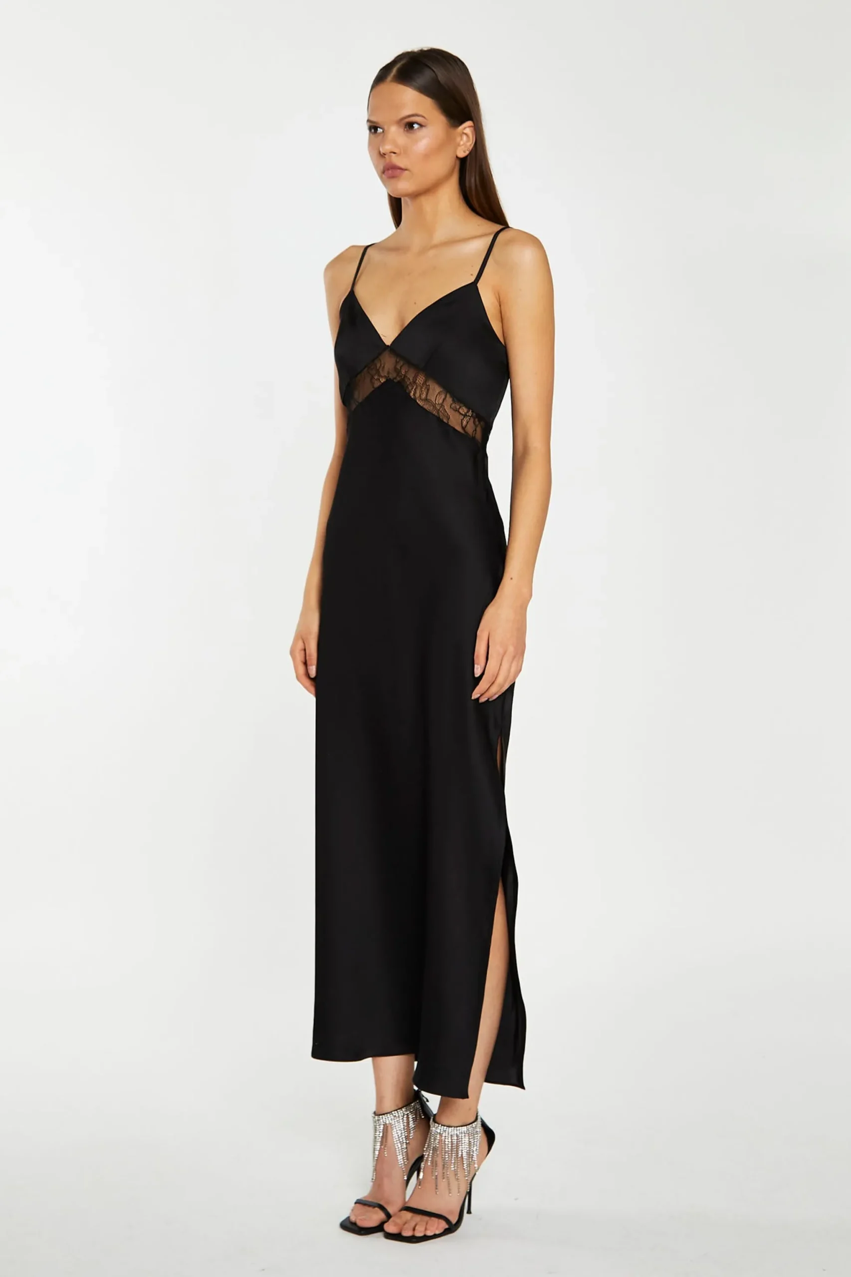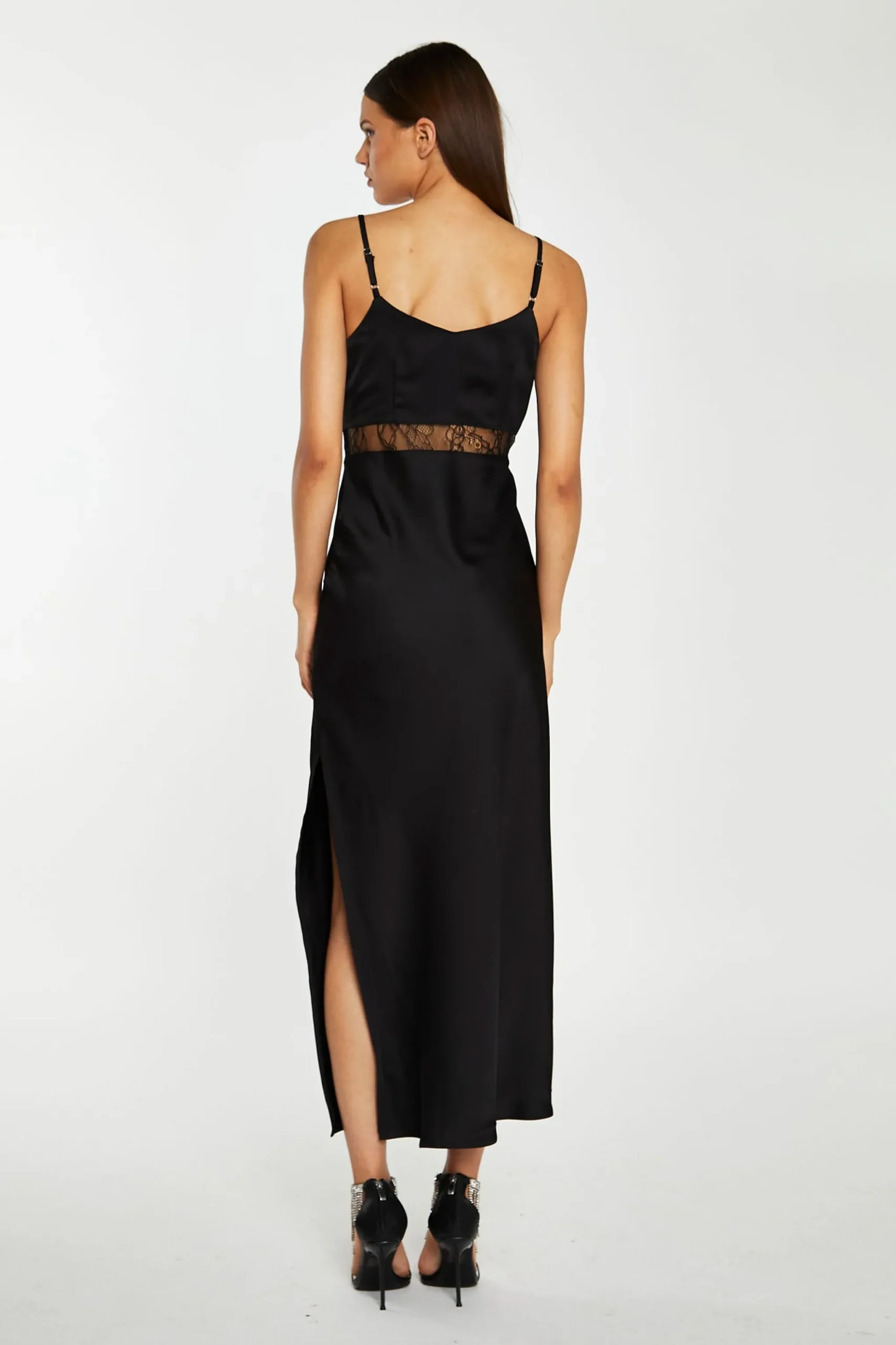 Glamorous Womens Black Lace Trim Cami Midaxi-Dress. Glam up your wardrobe with this elegant cami midaxi-dress with lace trim detailing, adjustable spaghetti straps and a flattering bias-cut fit. Its side-split design adds an effortless touch to your look. Get ready to stun and make a statement in this gorgeous dress.