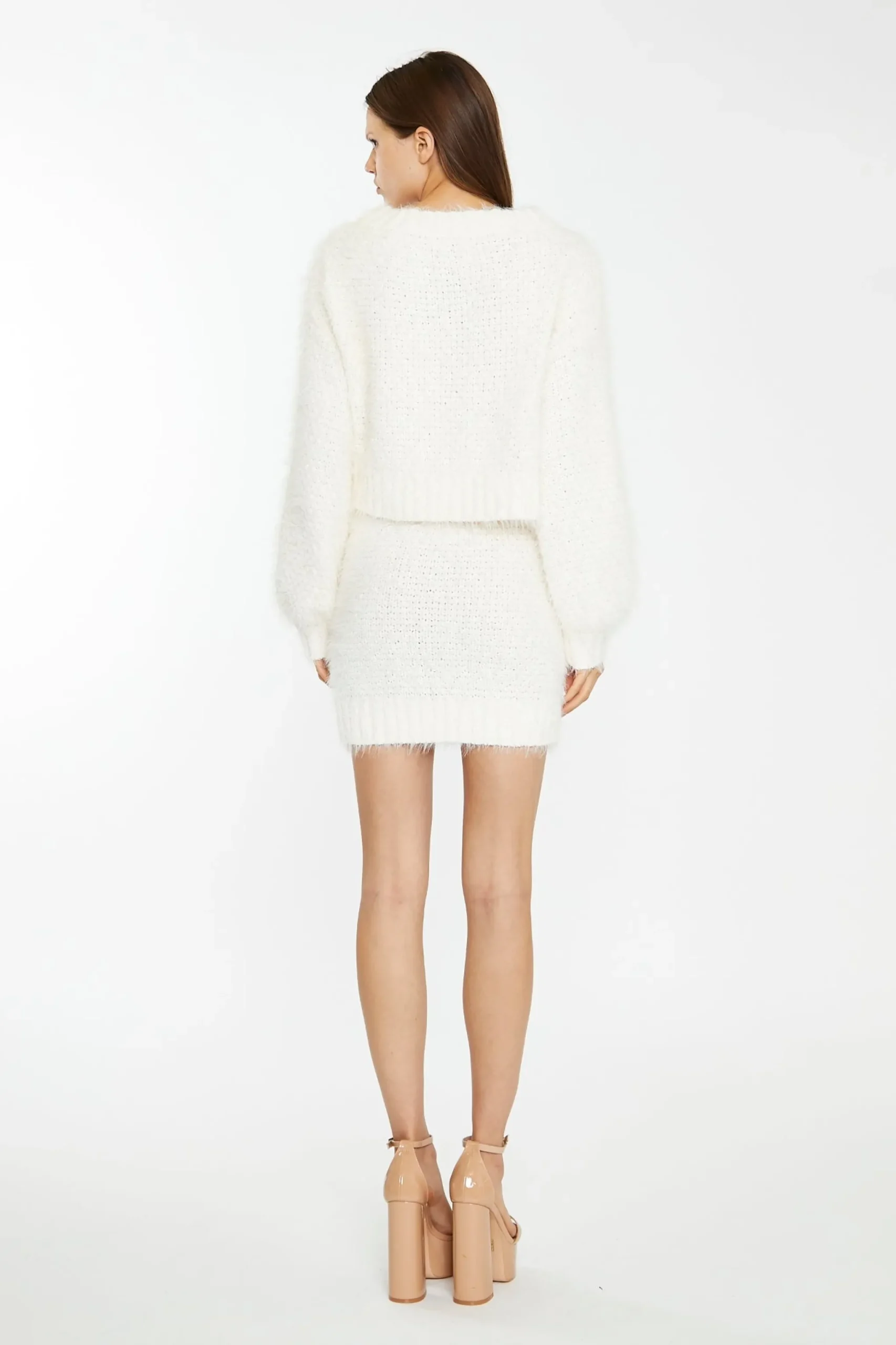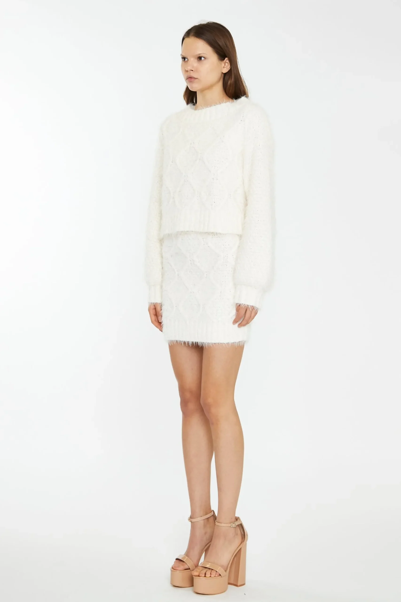 Glamorous Off White Knit Long Sleeve Jumper. This cosy jumper is sure to elevate your Winter wardrobe. Featuring a flattering fit with long sleeves in a cable knit style, this jumper is perfect for you! Team with our matching co-ord mini skirt for an effortless, yet on-trend look this season.