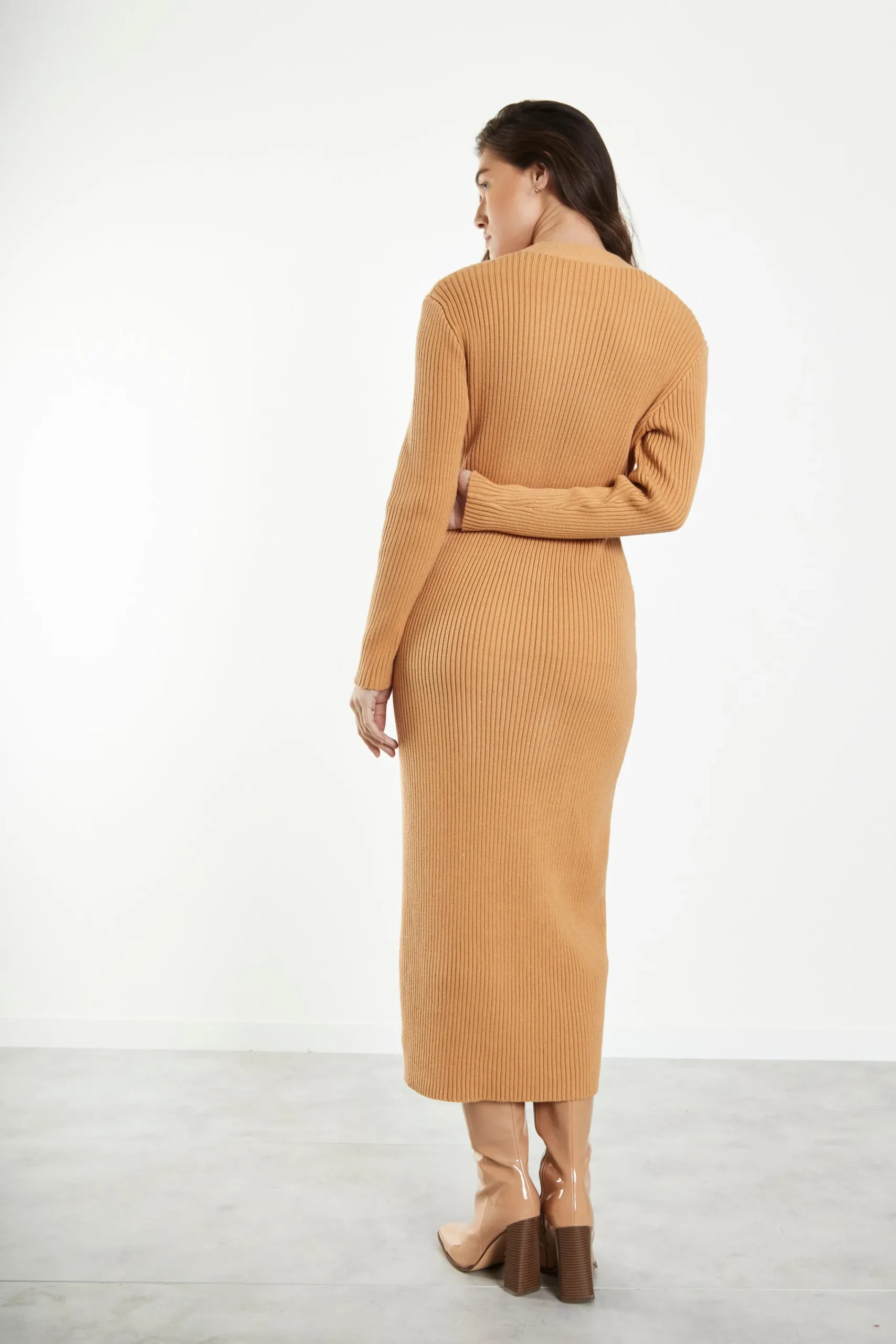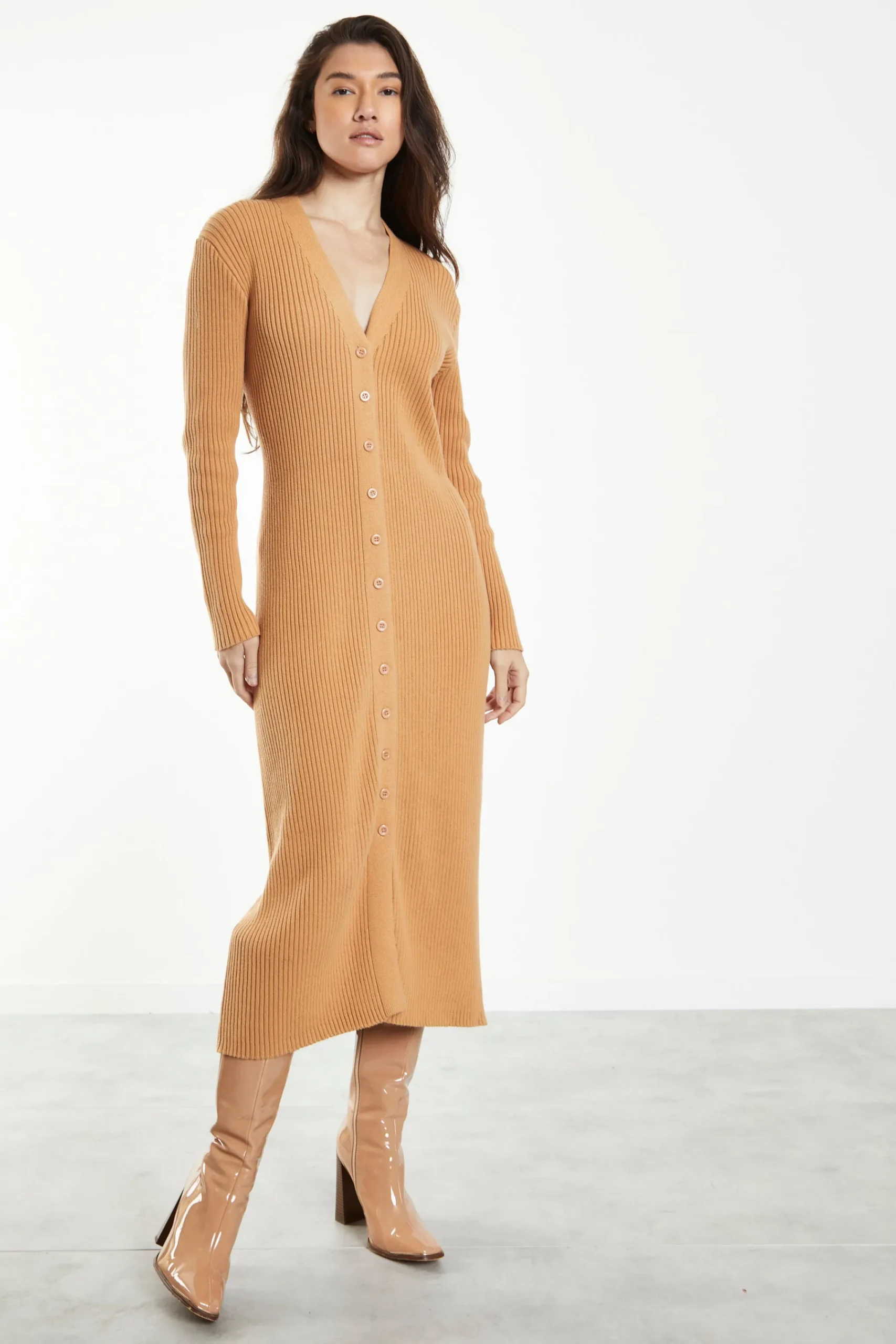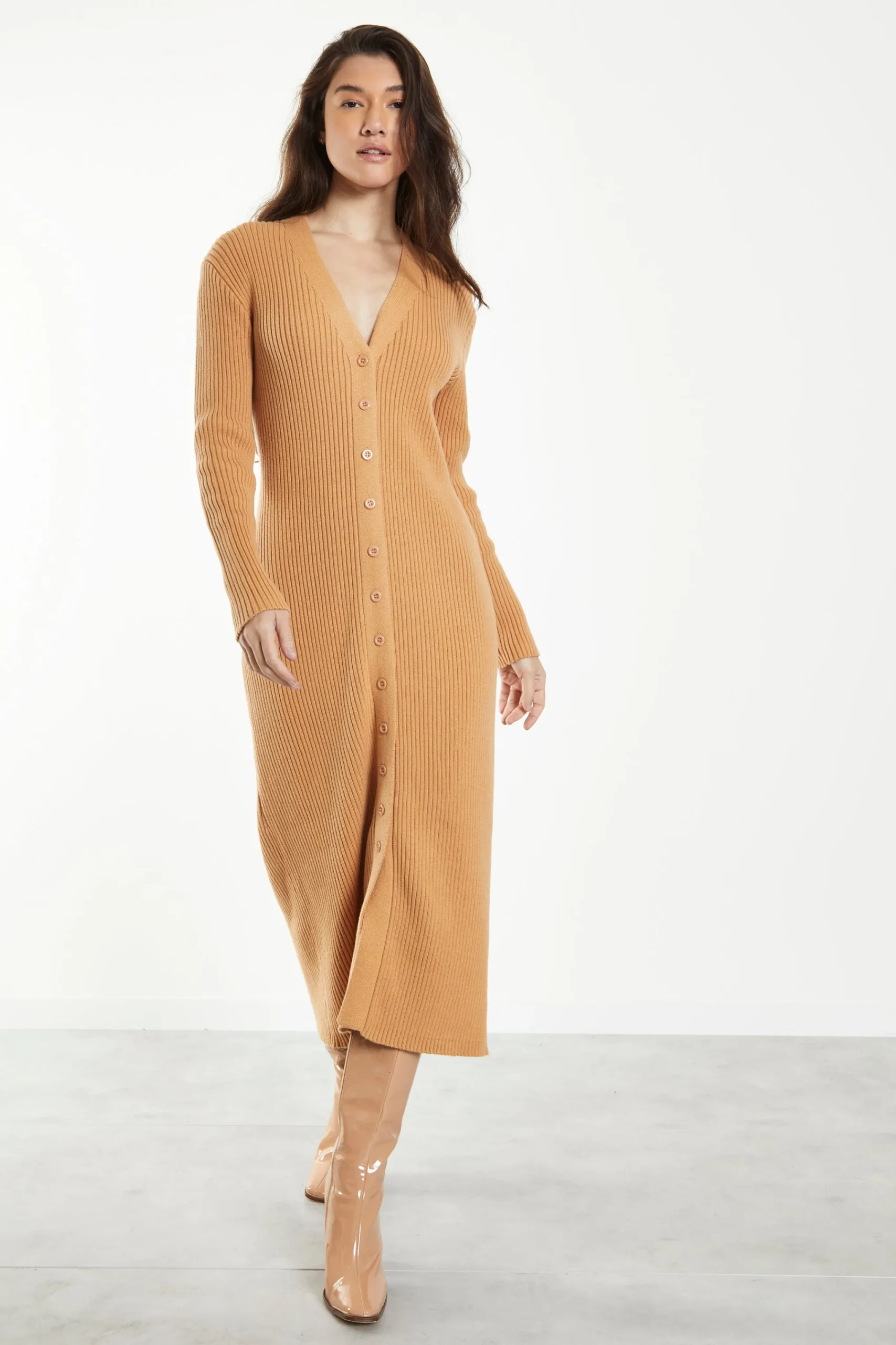 Glamorous Caramel Knitted Skinny Fit Midi Dress with Long Sleeves & V Neck. This midi dress is perfect for your wardrobe this season! Featuring long sleeves, V neckline in a skinny fit, we love this piece here at Glamorous. Dress this gorgeous piece up or down with trainers or heels, its a must have for your season wardrobe.