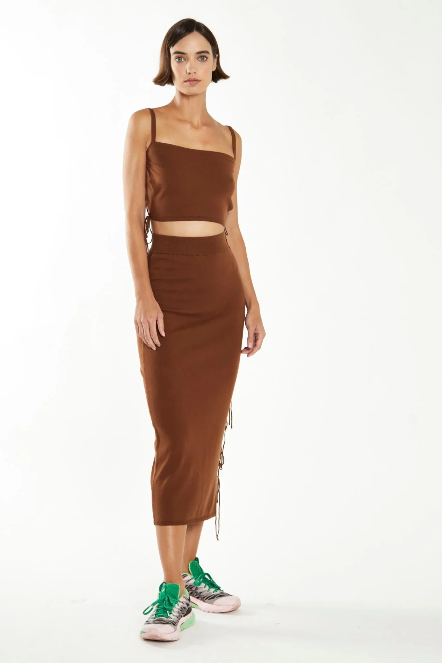 Glamorous Care Womens Mahogany-Brown Side Tie Knitted Crop-Top. This is a sustainable knitted look thats sure to turn heads! Featuring side tie details, we are loving this unique take on a knit crop top. Pair with the matching midi skirt and sleek autumn look!