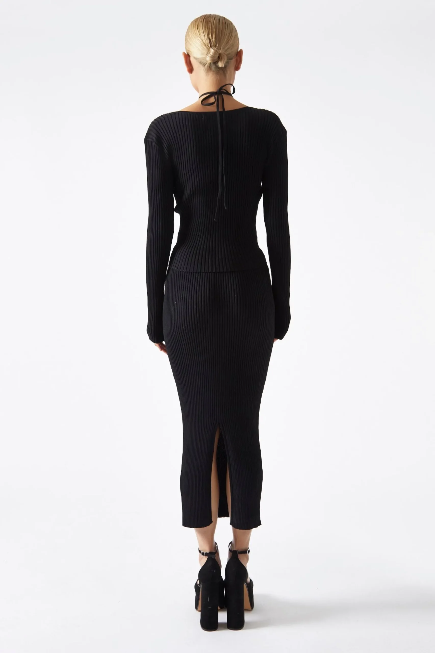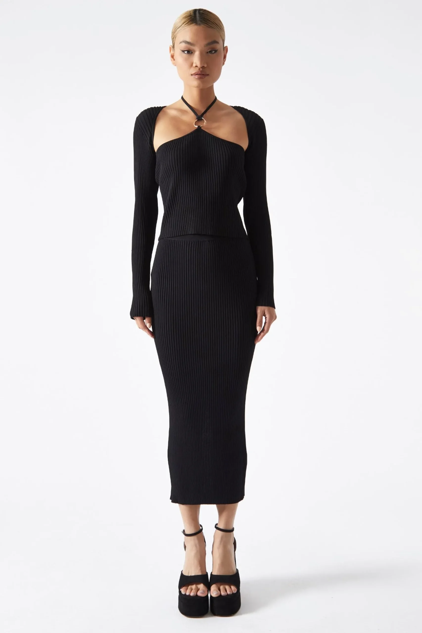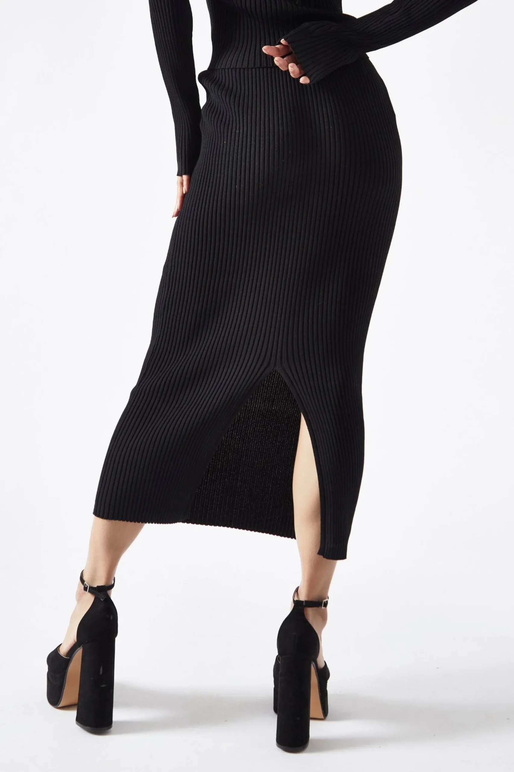 Glamorous Studio Womens Black High-Waist Knit Midaxi-Skirt. Look stylish and put-together in this versatile black midaxi length skirt. Its high-waisted design and rib knit fabric provides a flattering bodycon fit, while the back centre split adds an edgy touch to any outfit. Perfect for day-to-day wear or special occasions.