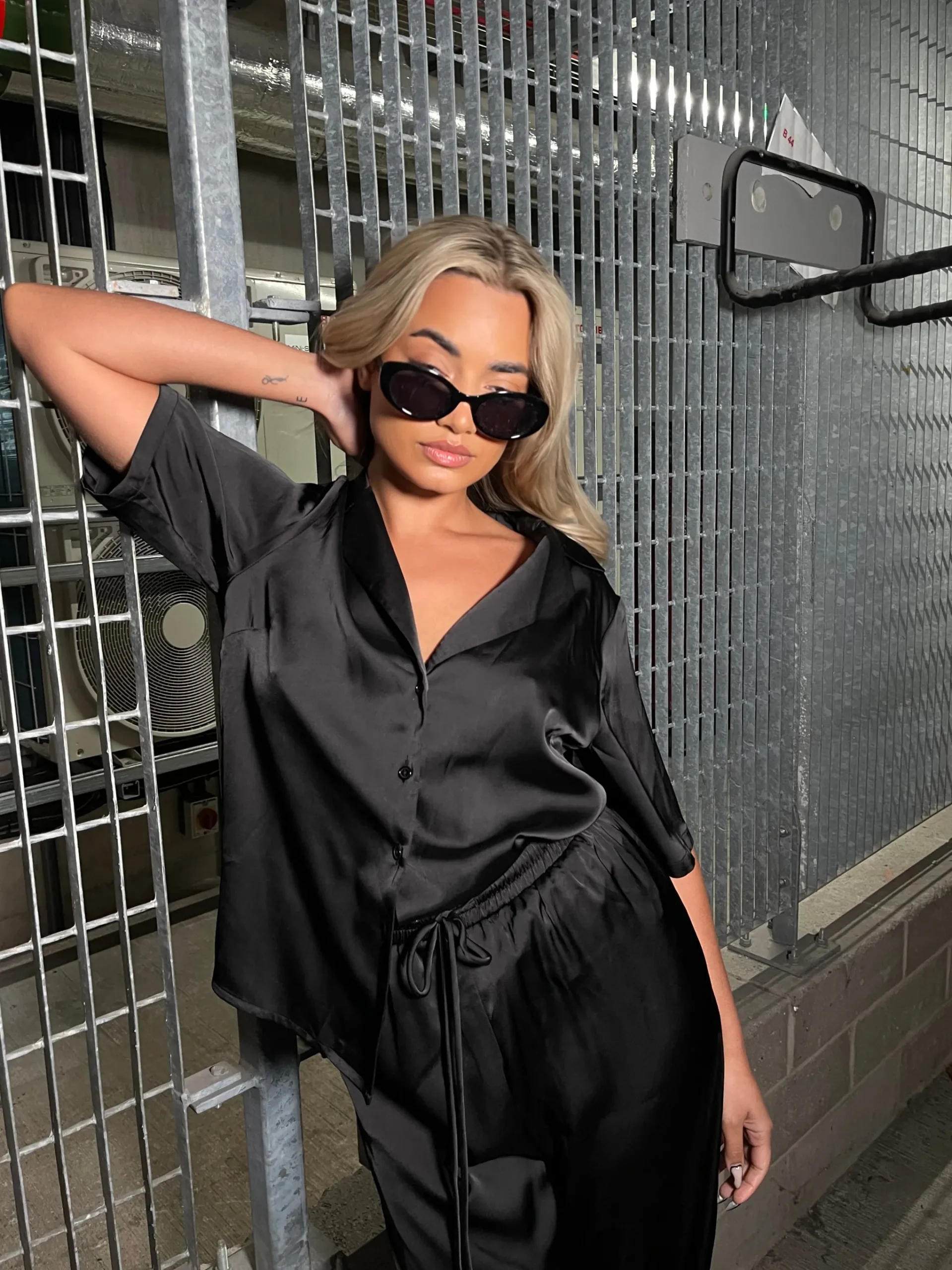Glamorous Studio Womens Black-Satin Resort Long-Shirt. Elevate your style with this black satin short sleeve top. Its relaxed fit and low cut make it easy to wear, while the button up design adds a touch of sophistication. Pair it with the matching trousers for a chic and effortless look.