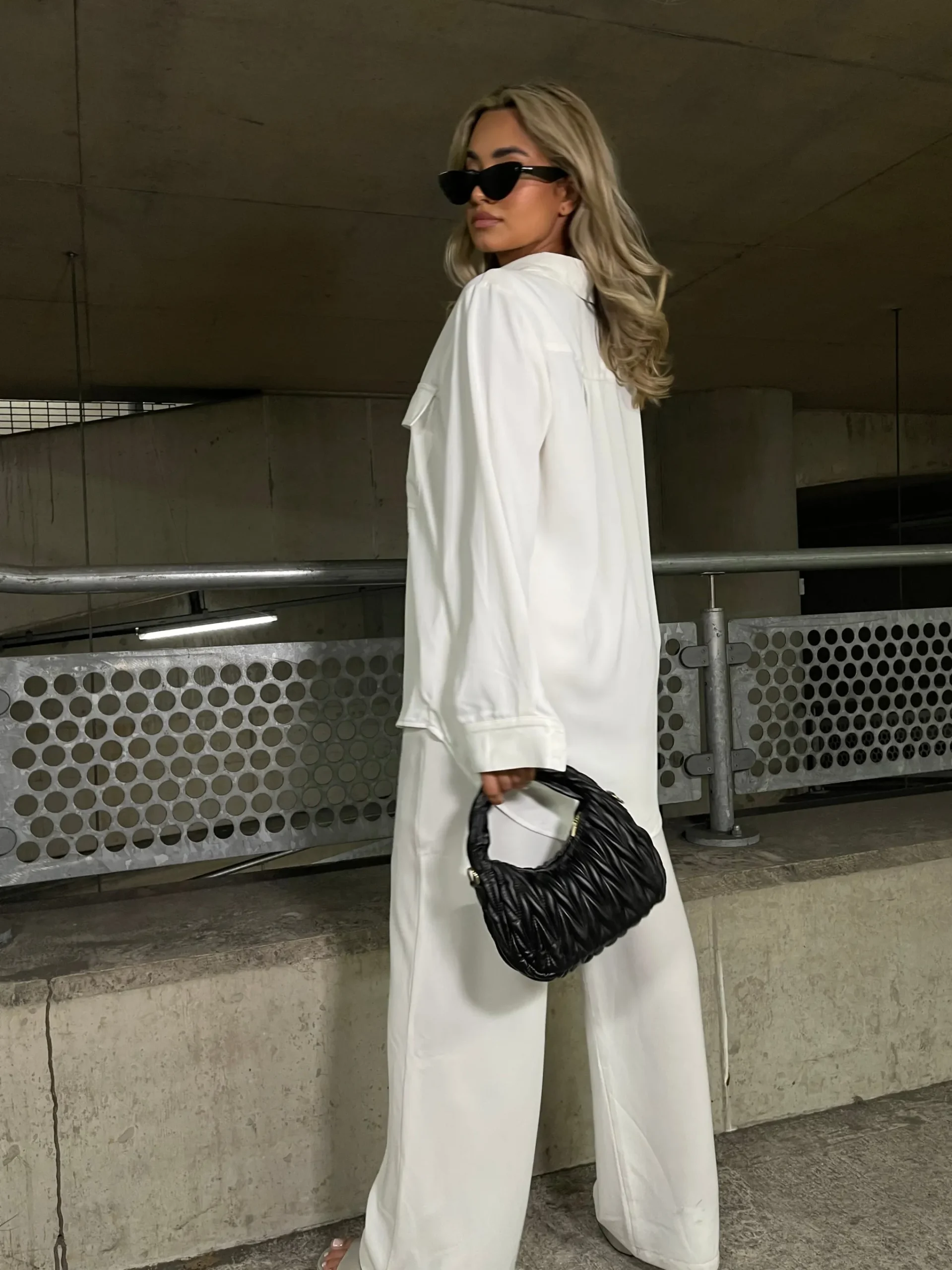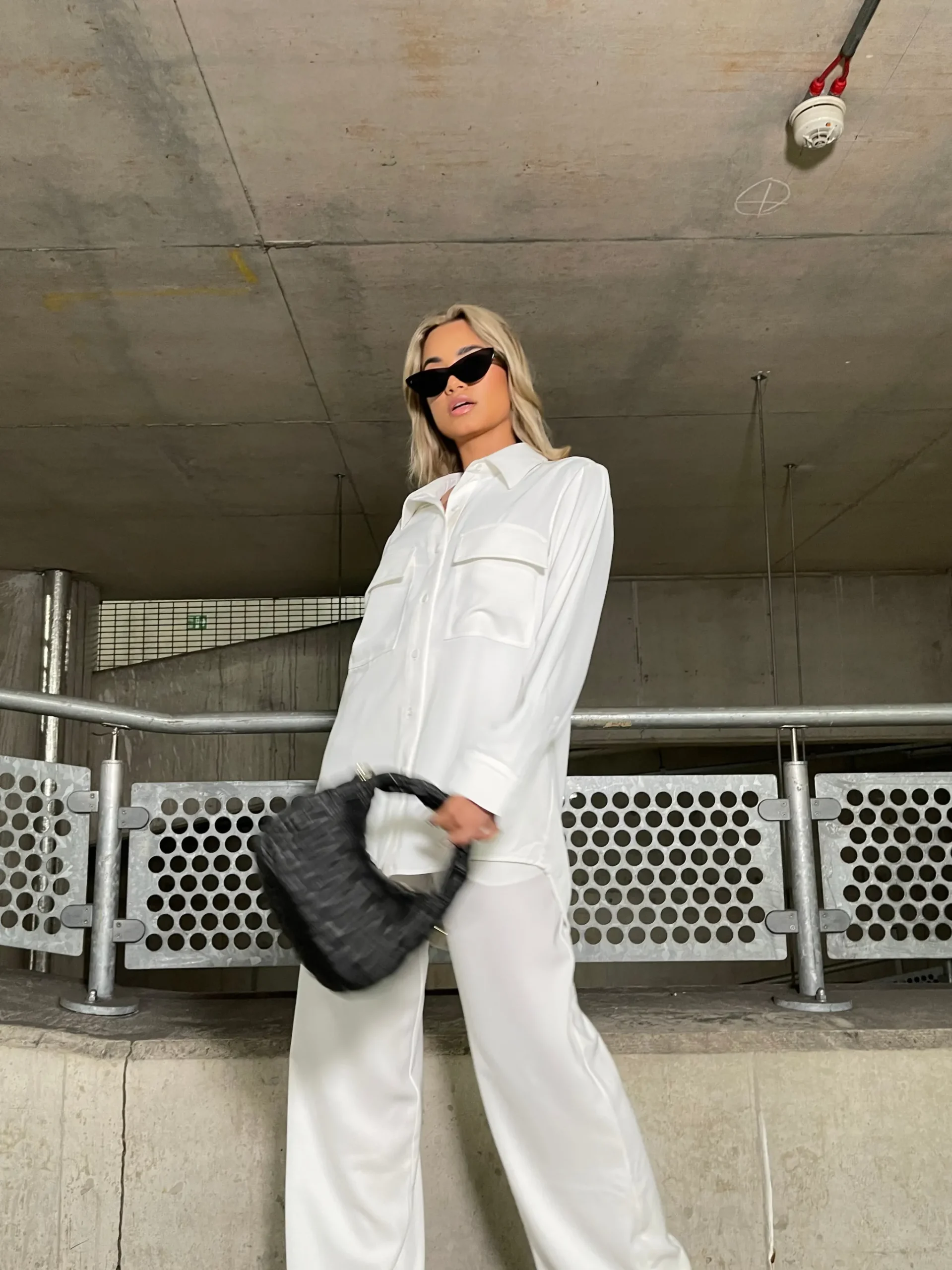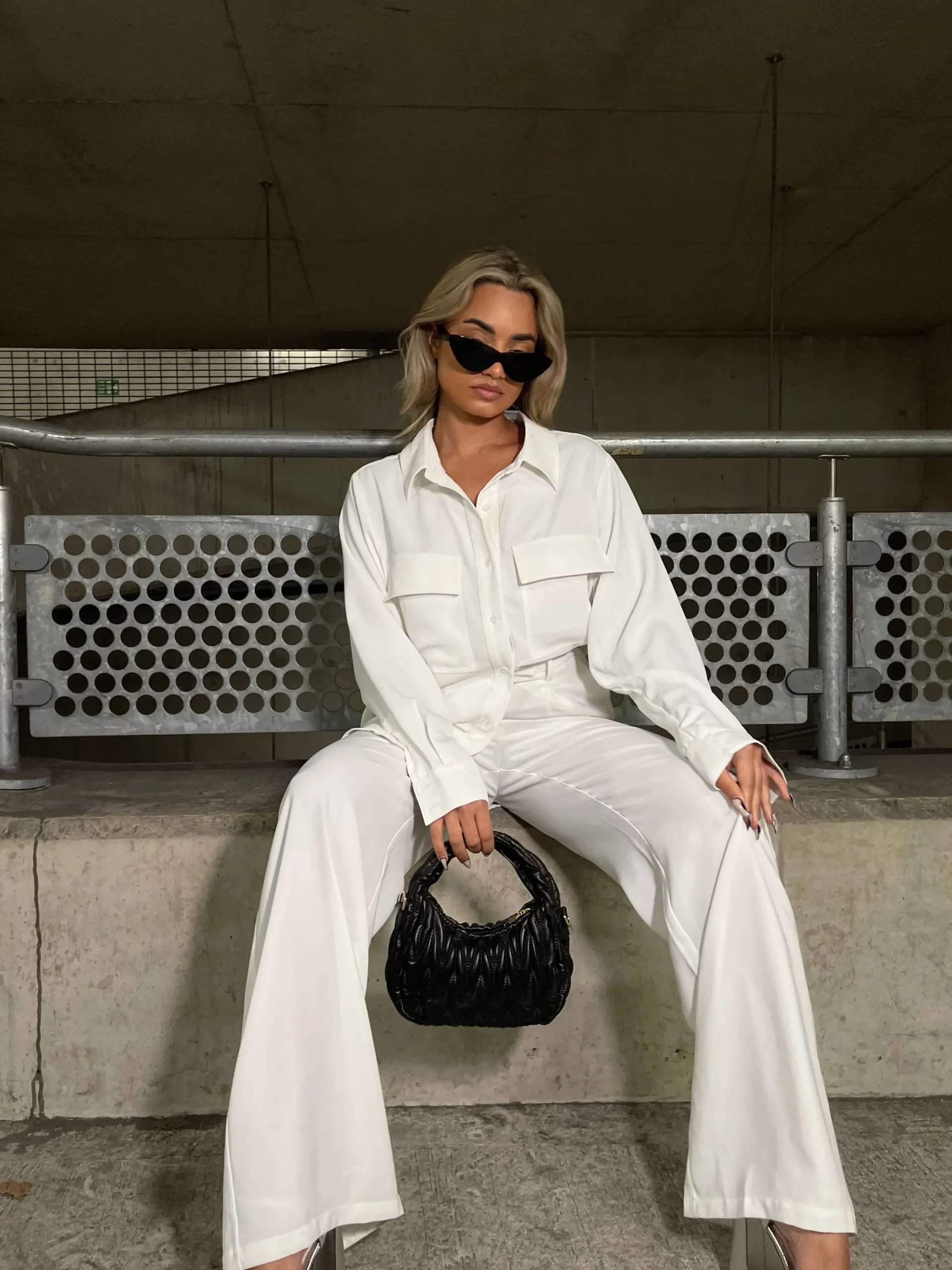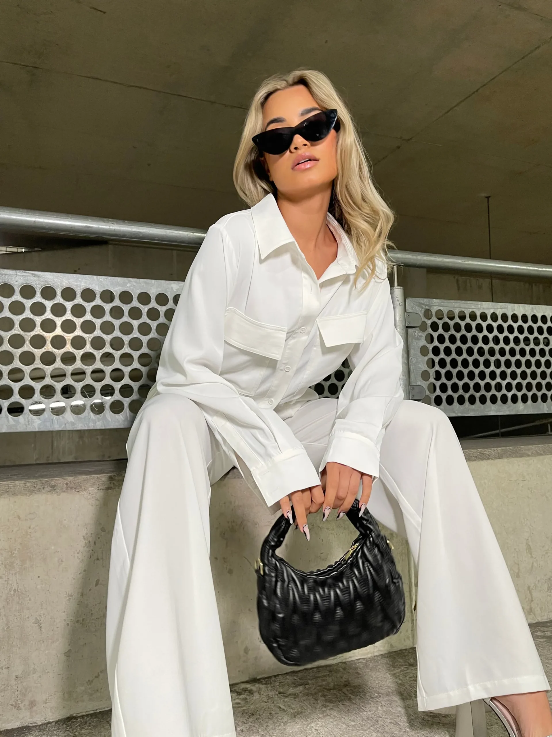 Glamorous Studio Womens Off White Oversized Utility -Shirt. Stay stylish and organized in this white long sleeve shirt with big pockets and a classic collar. Carry your essentials with ease while looking sharp and dapper. Perfect for any occasion, this shirt is a must-have in your wardrobe.